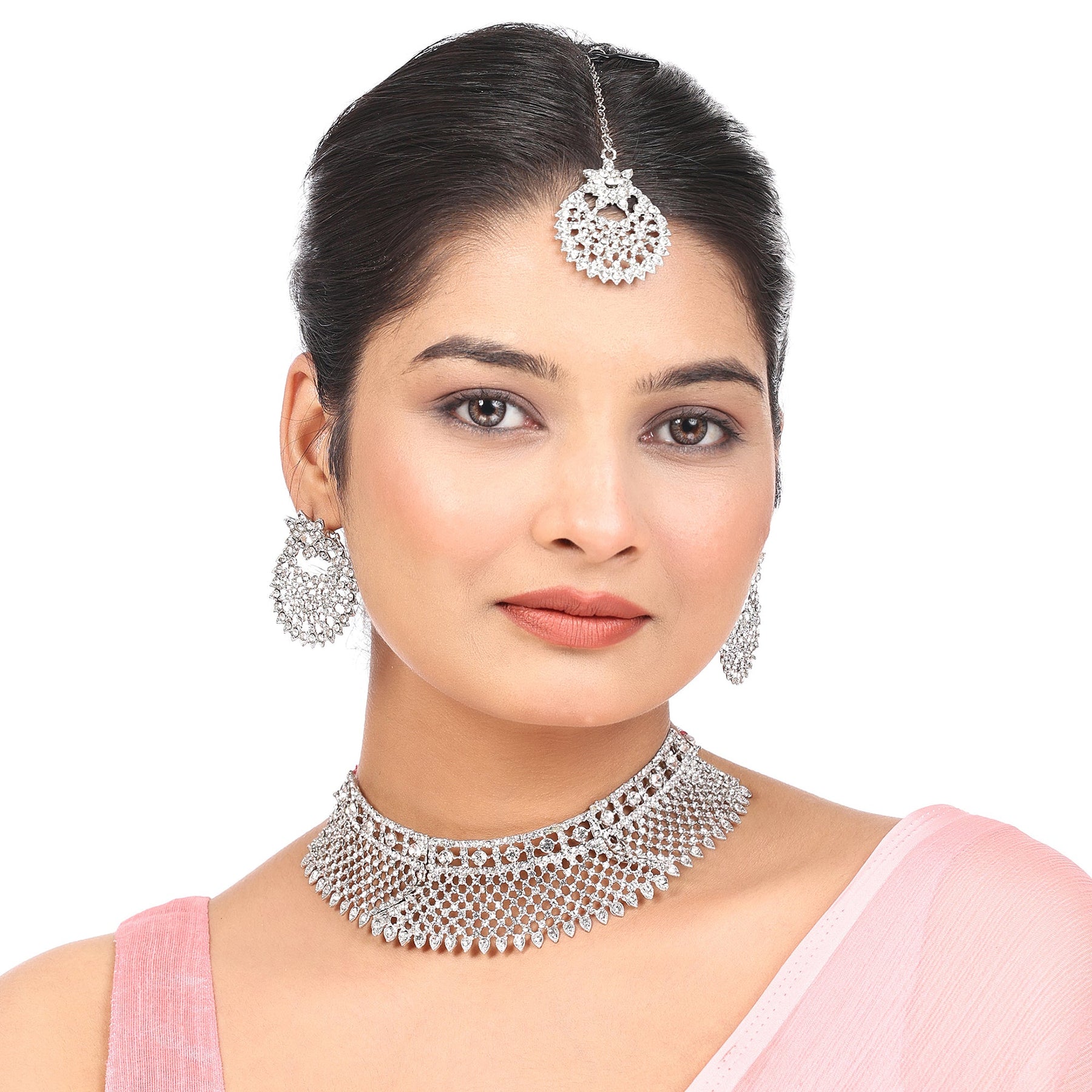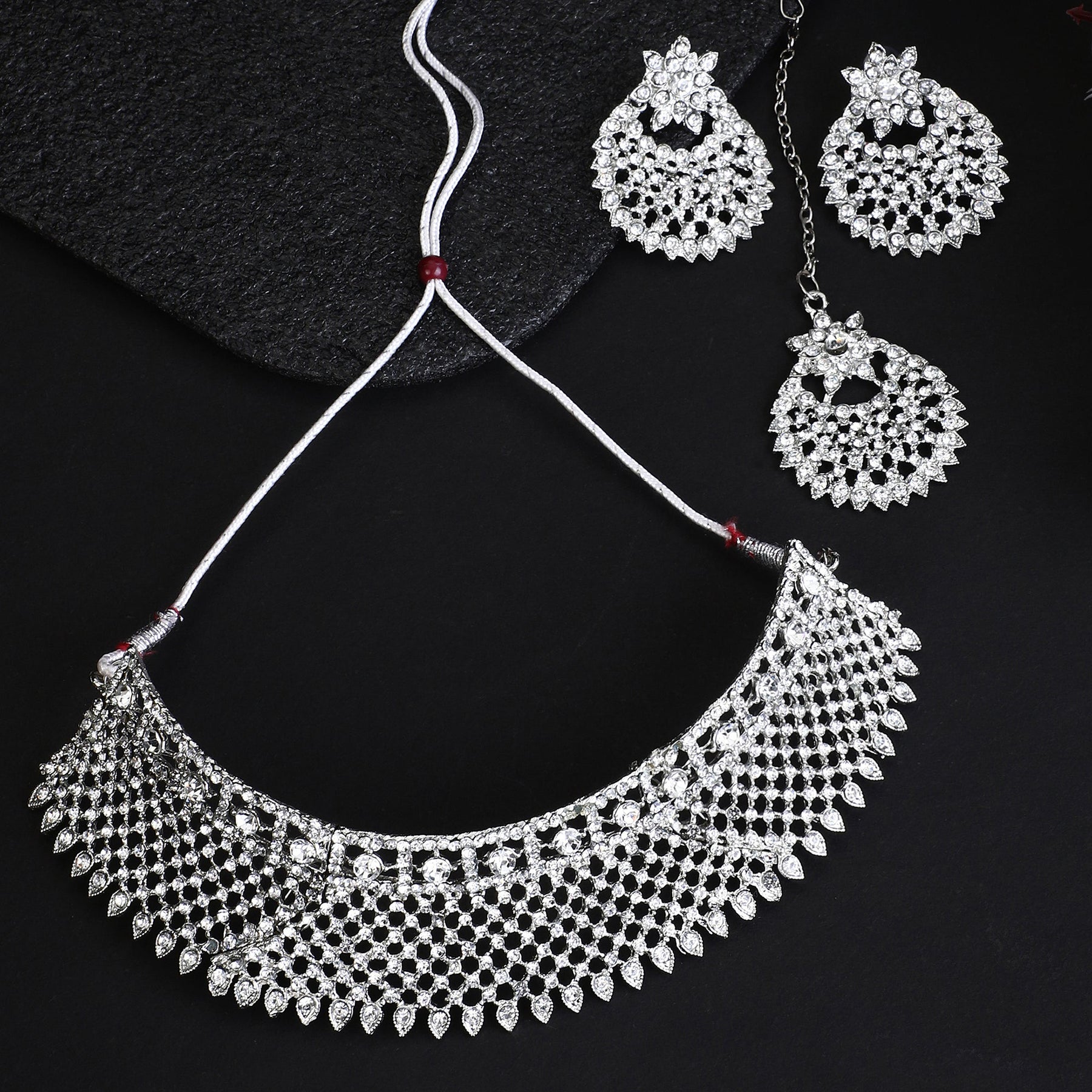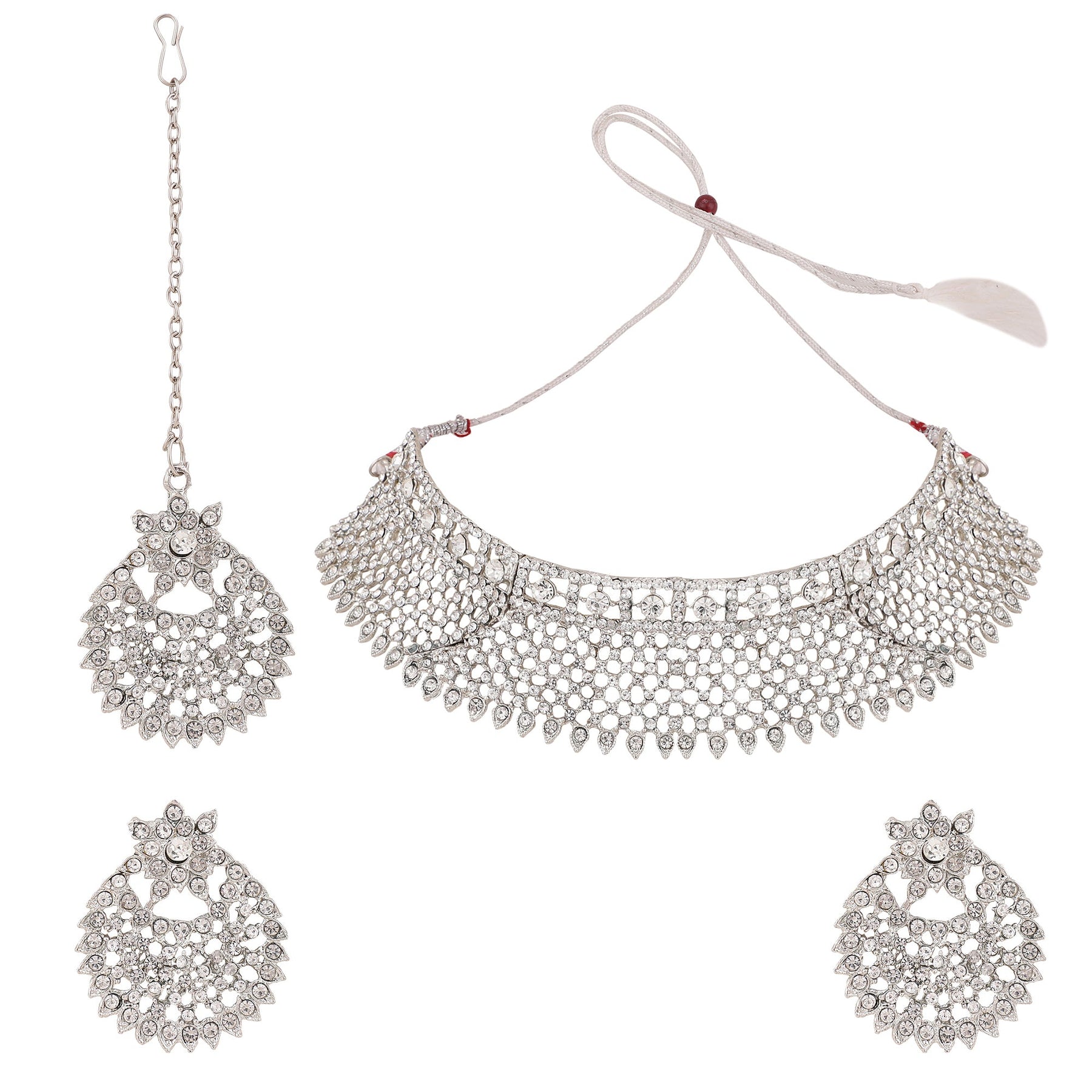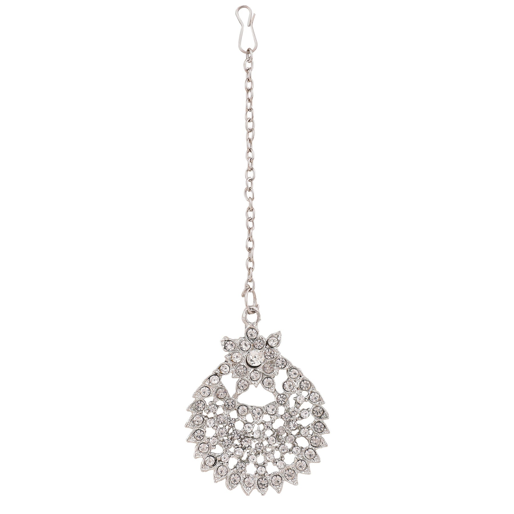 Mode Mania Traditional Silver Plated White Stone Jewellery Set With Pair Of Earrings And A Maangtikka