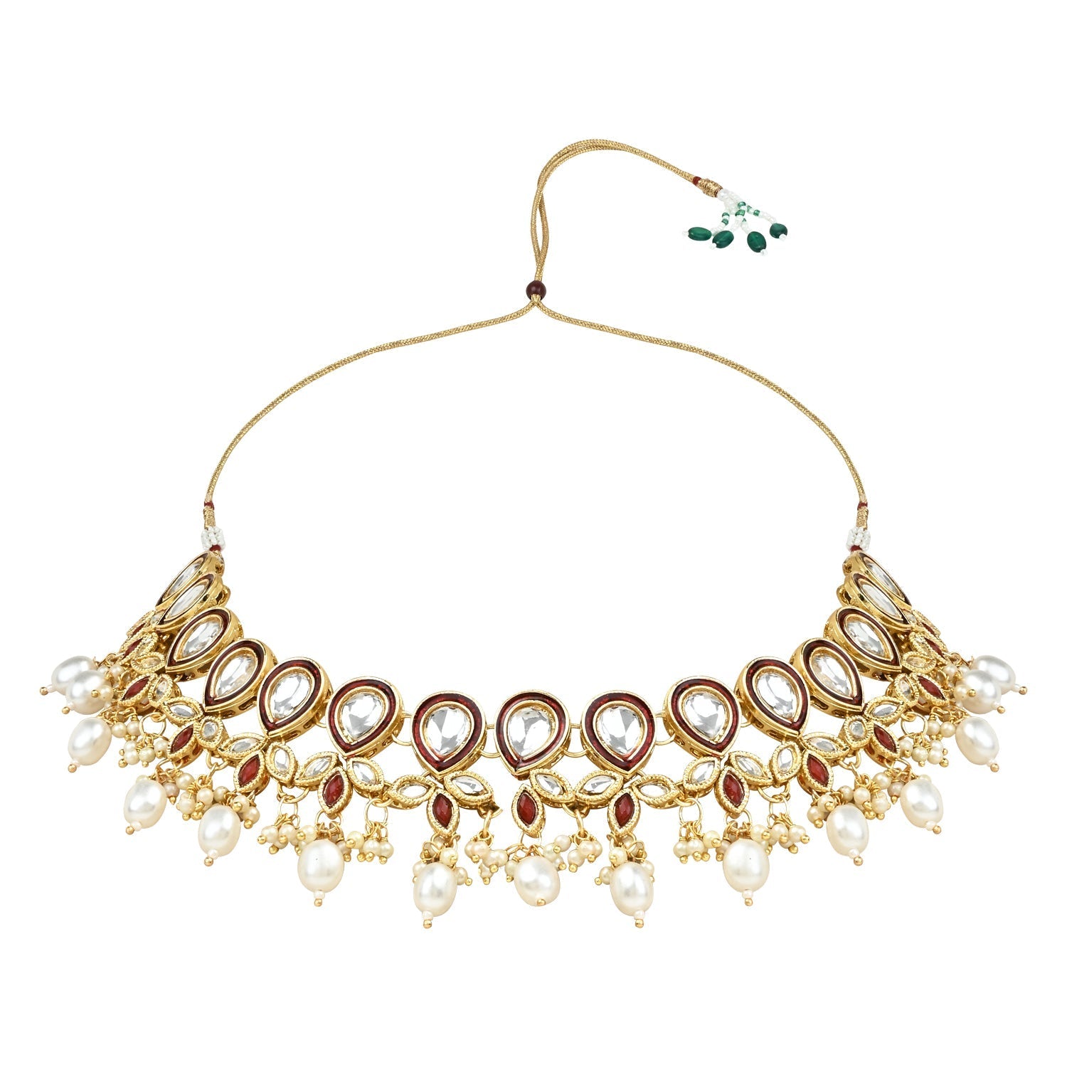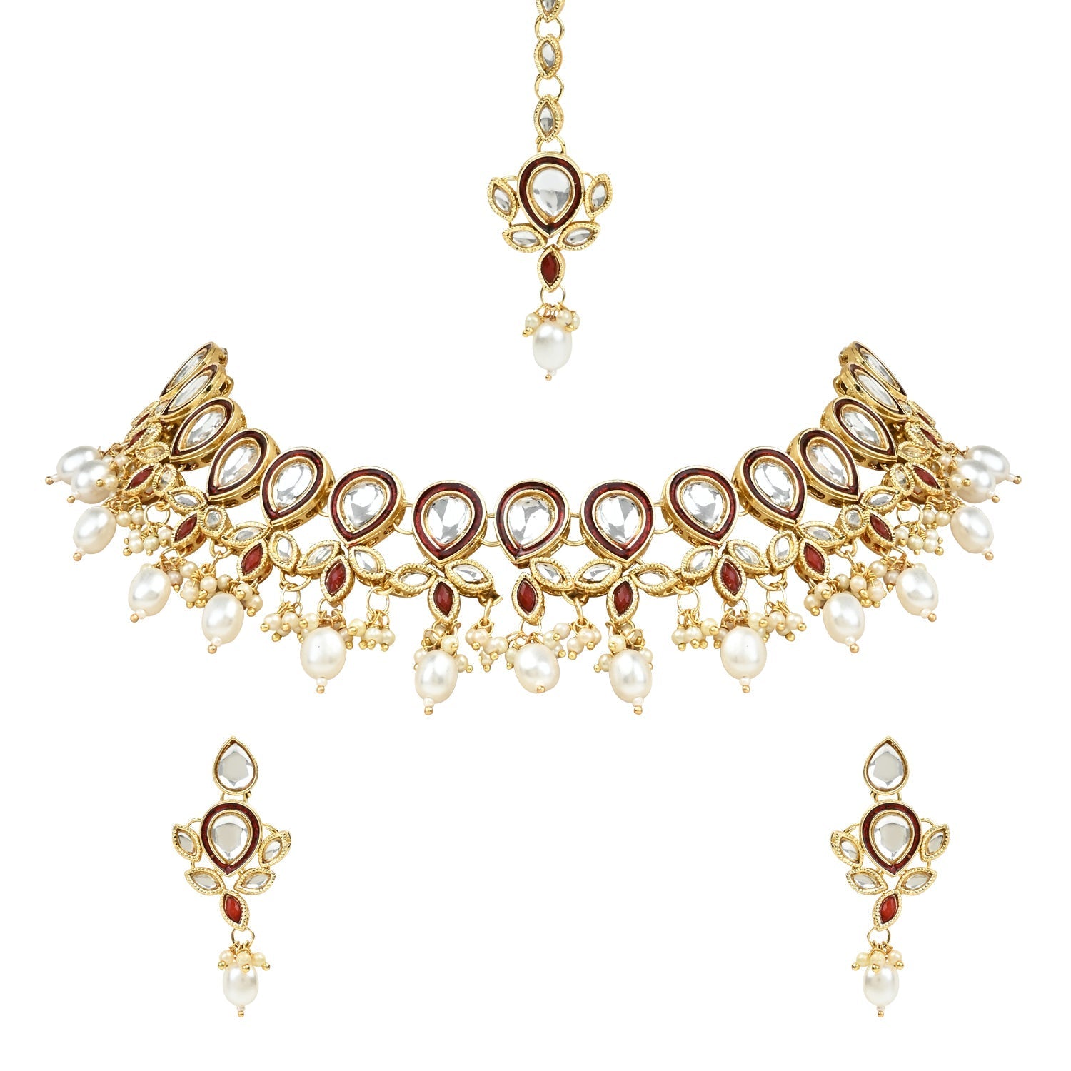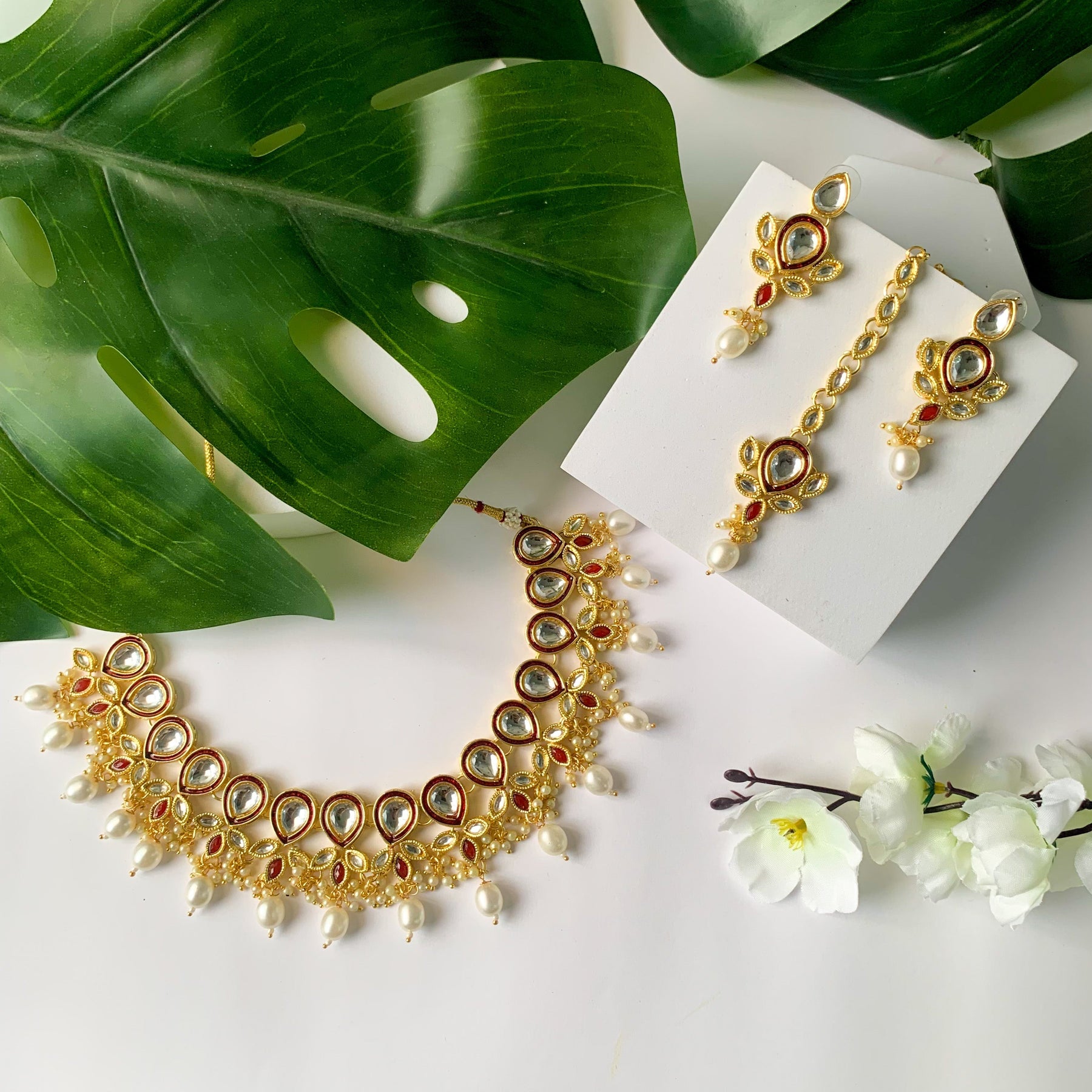 The necklace is gracefully designed to adorn the neck, accentuating the collarbone. The floral motif adds a unique touch to the overall design, making it suitable for a wide range of necklines, from high-neck to V-neck ensembles. Perfect for special occasions and celebrations. This set includes matching earrings and a Maang Tikka, each thoughtfully designed to harmonize with the necklace, creating a captivating and regal look. The Maang Tikka adds a traditional charm, making this ensemble ideal for weddings, festivals, and cultural ceremonies.