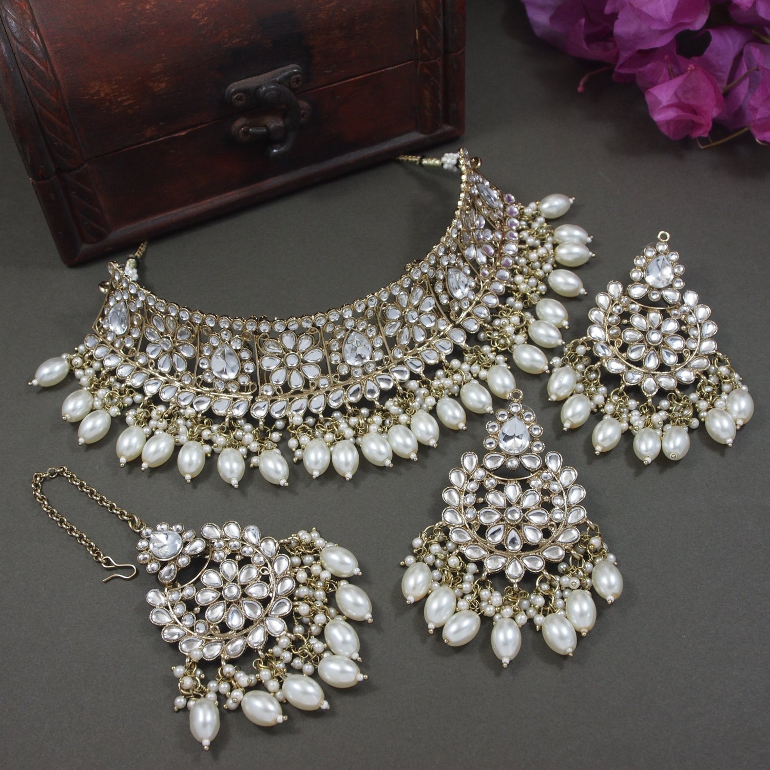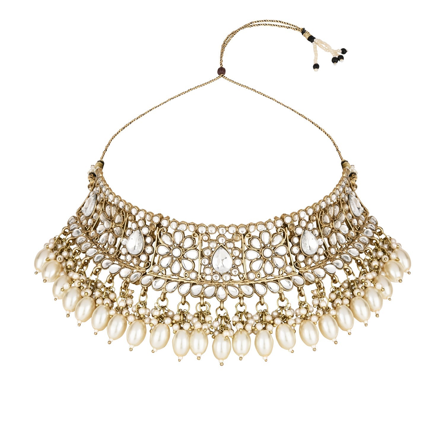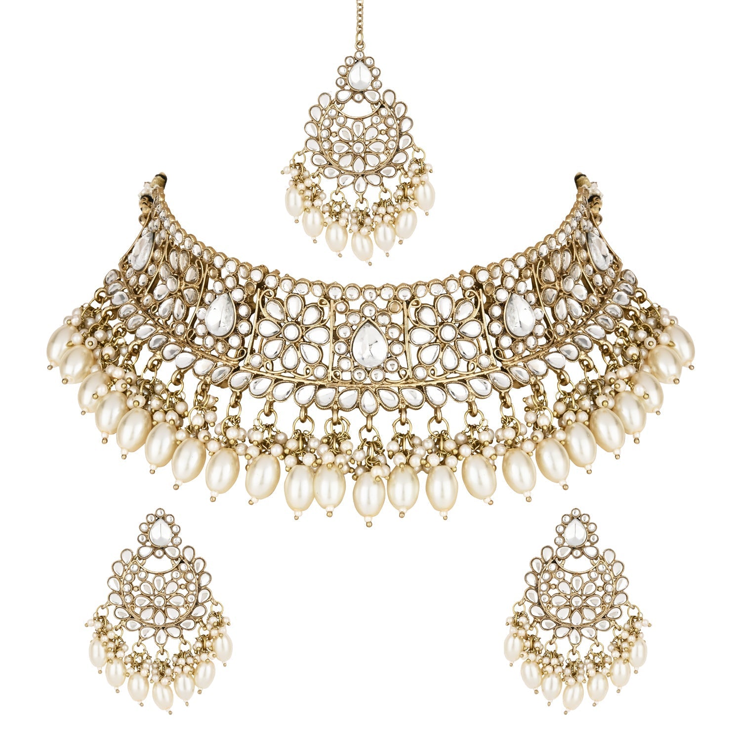 The gold-plated choker necklace set consists of a necklace, a pair of earrings, and a maang tikka. The necklace features kundan studded with pearl beaded in it, giving it an elegant and traditional look. The stones and pearls are set in a beautiful pattern, adding a touch of sophistication and grace to the necklace. The necklace is secured with drawstring closures, which make it easy to adjust the size to fit comfortably around the neck. This is an important feature, as it ensures that the necklace will be comfortable to wear for extended periods of time. The necklace is secured with drawstring closures, which make it easy to adjust the size to fit comfortably around the neck. This is an important feature, as it ensures that the necklace will be comfortable to wear for extended periods of time. The earrings and maang tikka are also adorned with stones and pearls, which match the pattern of the necklace. The earrings have a beautiful design, which makes them easy and comfortable to wear. The maang tikka is a traditional Indian hair accessory that can be worn with the necklace and earrings to complete the look.