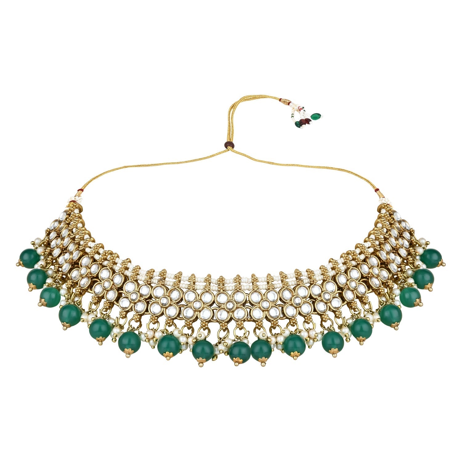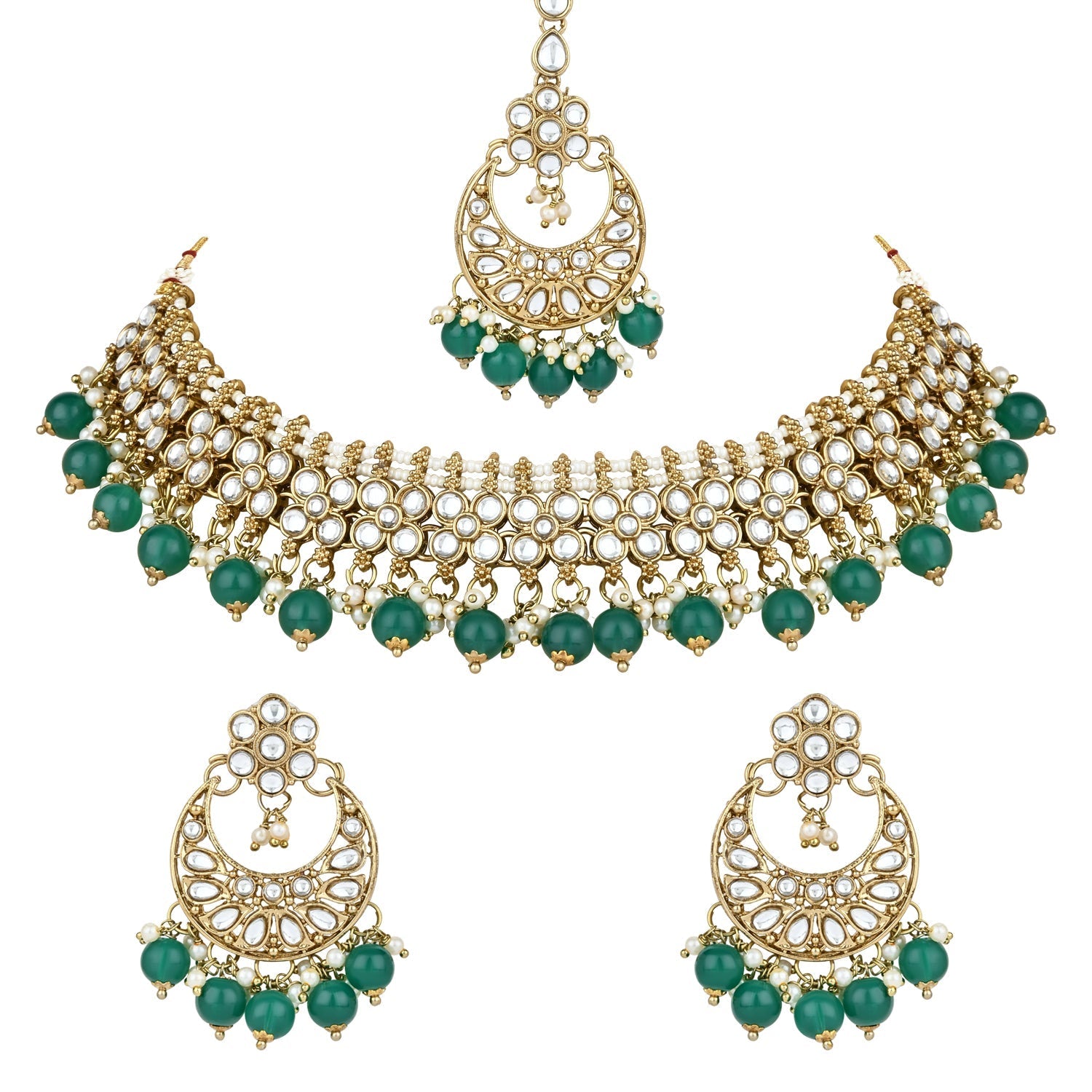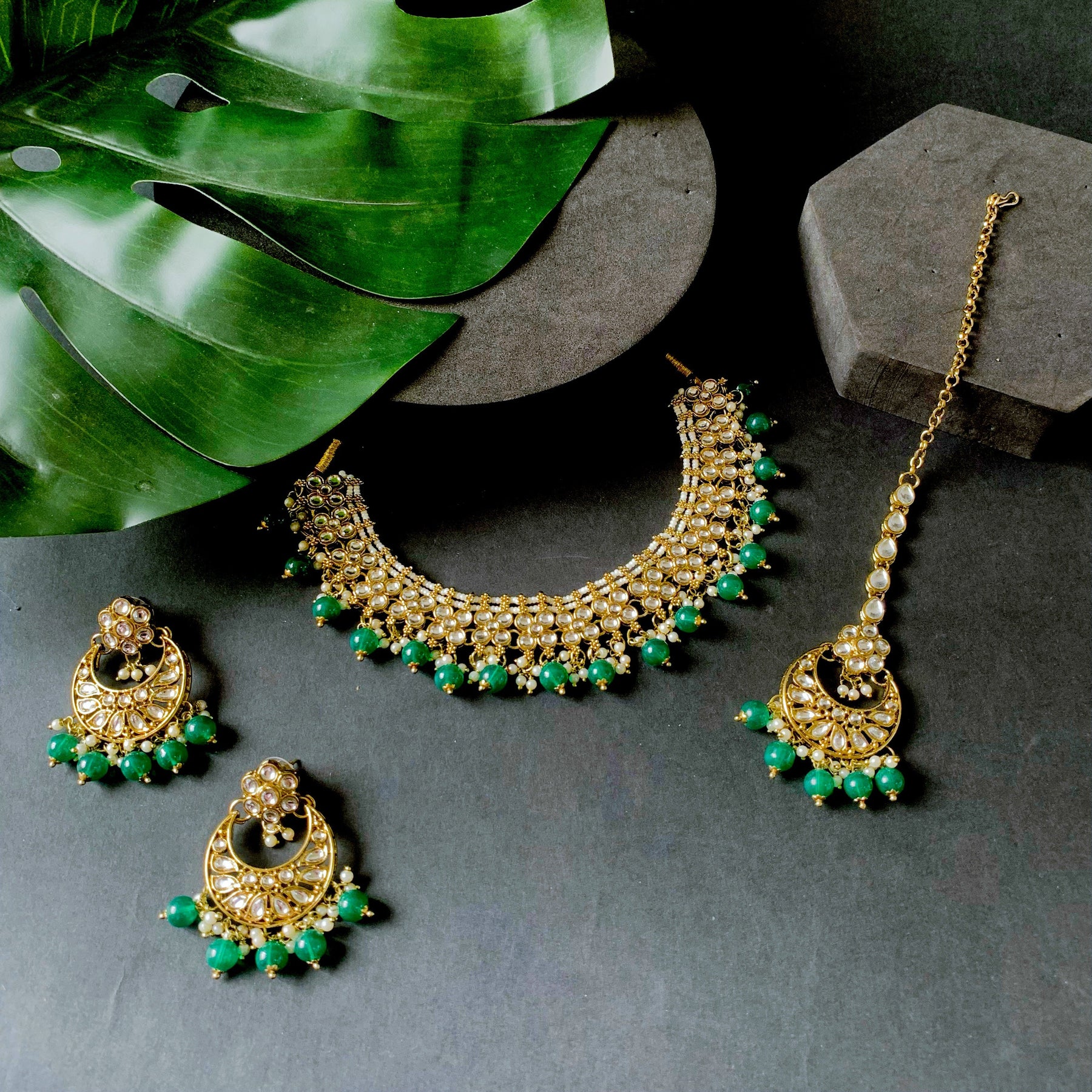 The gold-plated choker necklace set consists of a necklace, a pair of earrings, and a maang tikka. The necklace features kundan studded with pearl beaded in it, giving it an elegant and traditional look. The stones and pearls are set in a beautiful pattern, adding a touch of sophistication and grace to the necklace. The necklace is secured with drawstring closures, which make it easy to adjust the size to fit comfortably around the neck. This is an important feature, as it ensures that the necklace will be comfortable to wear for extended periods of time. The necklace is secured with drawstring closures, which make it easy to adjust the size to fit comfortably around the neck. This is an important feature, as it ensures that the necklace will be comfortable to wear for extended periods of time. The earrings and maang tikka are also adorned with stones and pearls, which match the pattern of the necklace. The earrings have a beautiful design, which makes them easy and comfortable to wear. The maang tikka is a traditional Indian hair accessory that can be worn with the necklace and earrings to complete the look.