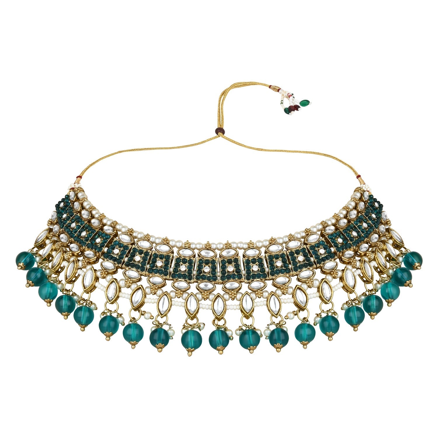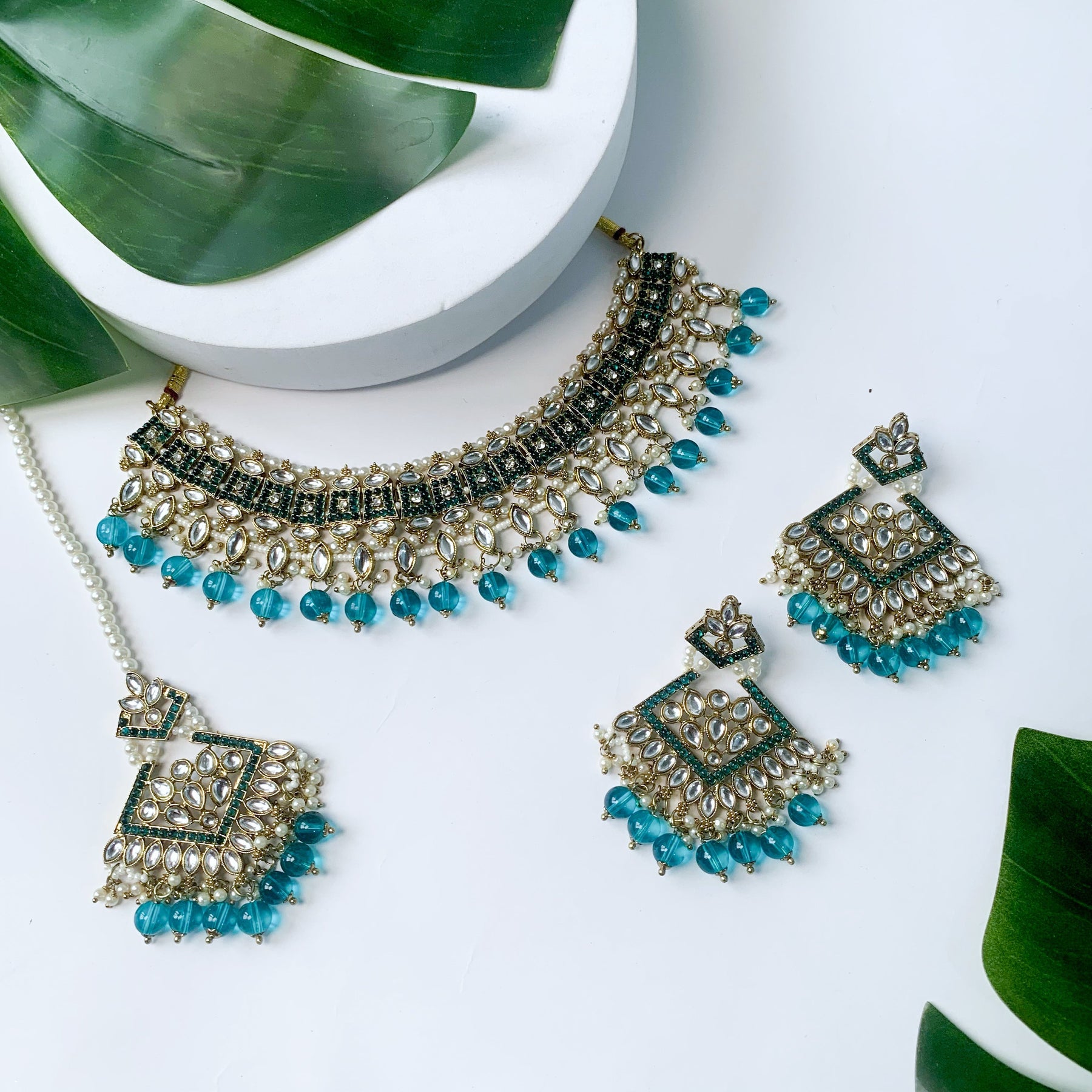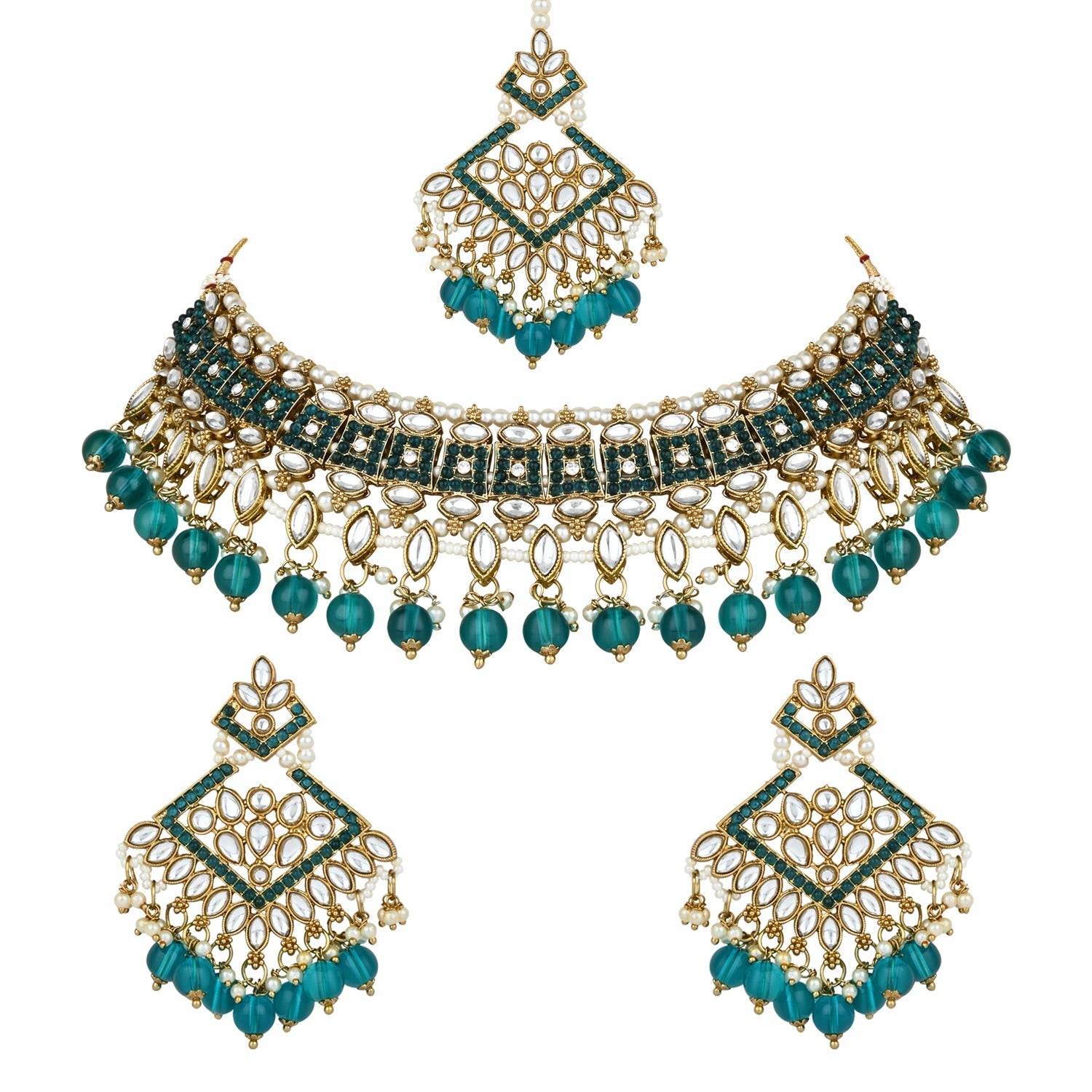 The gold-plated choker necklace set consists of a necklace, a pair of earrings, and a maang tikka. The necklace features kundan studded with pearl beaded in it, giving it an elegant and traditional look. The stones and pearls are set in a beautiful pattern, adding a touch of sophistication and grace to the necklace. The necklace is secured with drawstring closures, which make it easy to adjust the size to fit comfortably around the neck. This is an important feature, as it ensures that the necklace will be comfortable to wear for extended periods of time. The necklace is secured with drawstring closures, which make it easy to adjust the size to fit comfortably around the neck. This is an important feature, as it ensures that the necklace will be comfortable to wear for extended periods of time. The earrings and maang tikka are also adorned with stones and pearls, which match the pattern of the necklace. The earrings have a beautiful design, which makes them easy and comfortable to wear. The maang tikka is a traditional Indian hair accessory that can be worn with the necklace and earrings to complete the look.