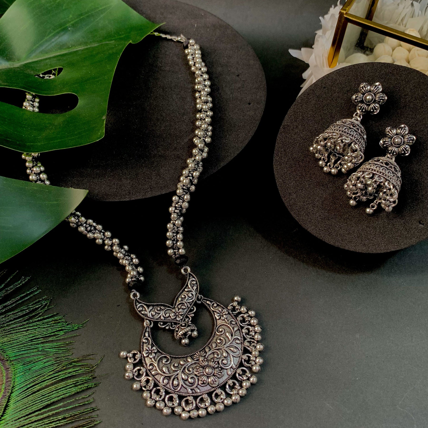 Dimension: Necklace Length - 24 Cm, Pendant Height -5 Cm X Width - 5 Cm, Earring Height - 3.5 Cm X Width - 1 Cm. Embrace The Festive Spirit With This Exquisite Jewelry Set, Featuring A Beautiful Floral Design And Delicate Ghungroos (Small Bells). This Set Includes A Stylish Long Necklace And Matching Jhumka Earrings. The Necklace Complements Various Necklines, Draping Gracefully Around Your Neck. The Pendant Boasts Intricate Floral Detailing, Making It A Noticeable Centerpiece. The Accompanying Earrings Are A Perfect Match, Striking The Right Balance Between Size And Comfort. The Oxidized Silver Finish Adds A Rustic Charm To The Set, Making It A Timeless Addition To Your Collection. Celebrate Navratri In Style And Grace With This Jewelry Set That Truly Embodies The Spirit Of The Season.