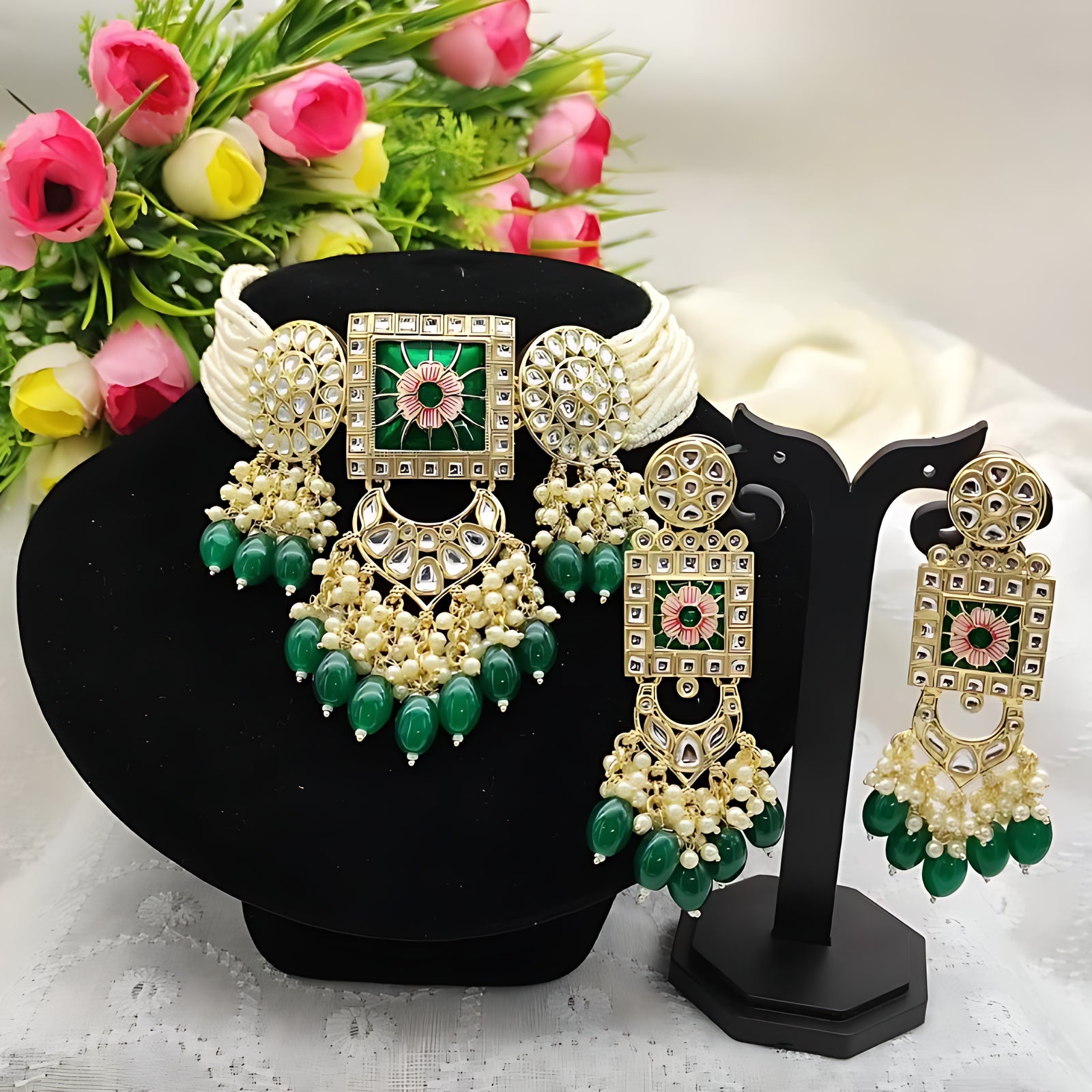 • Coordinating Drop Earrings With Complementary Kundan And Bead Elements