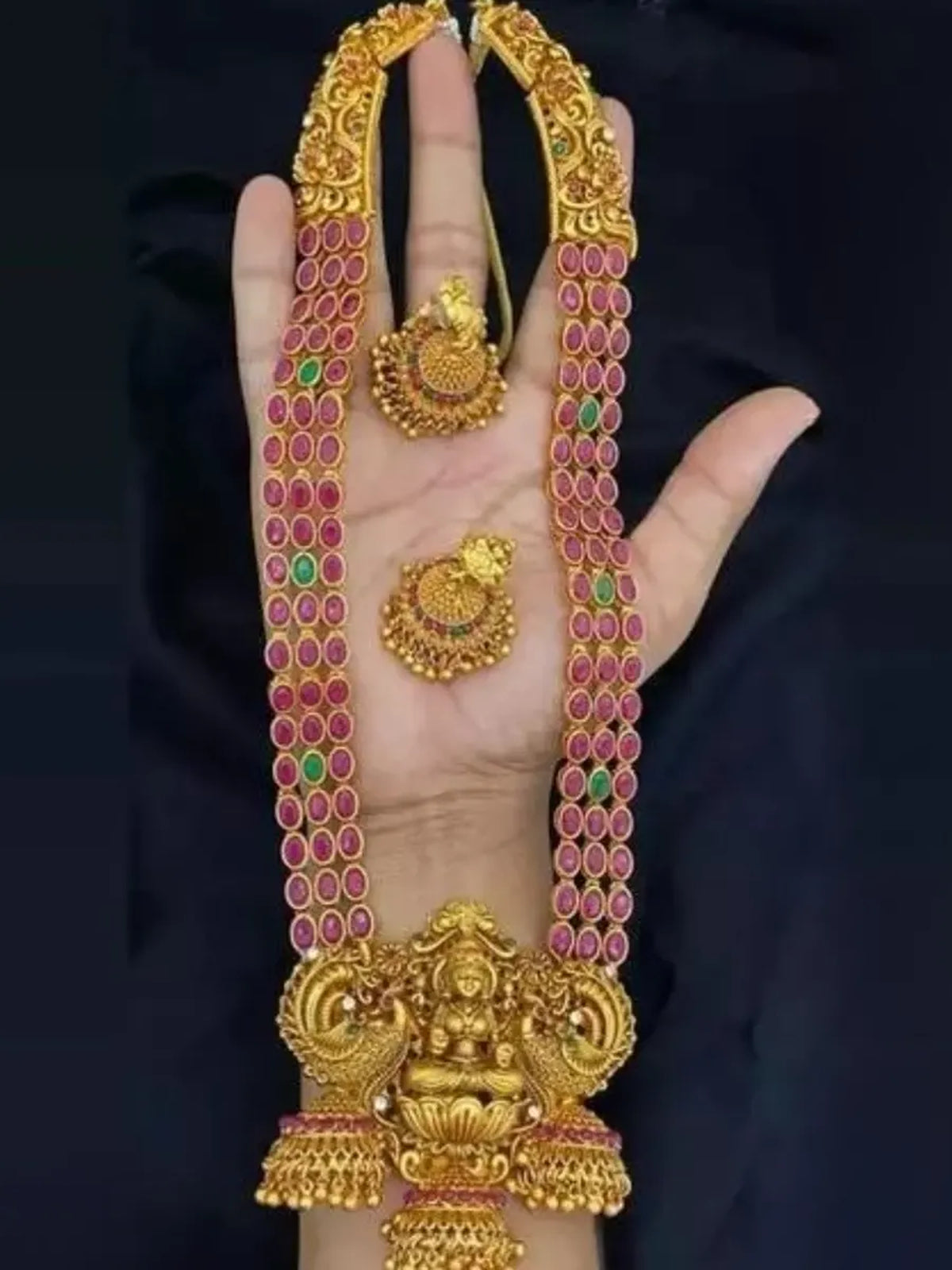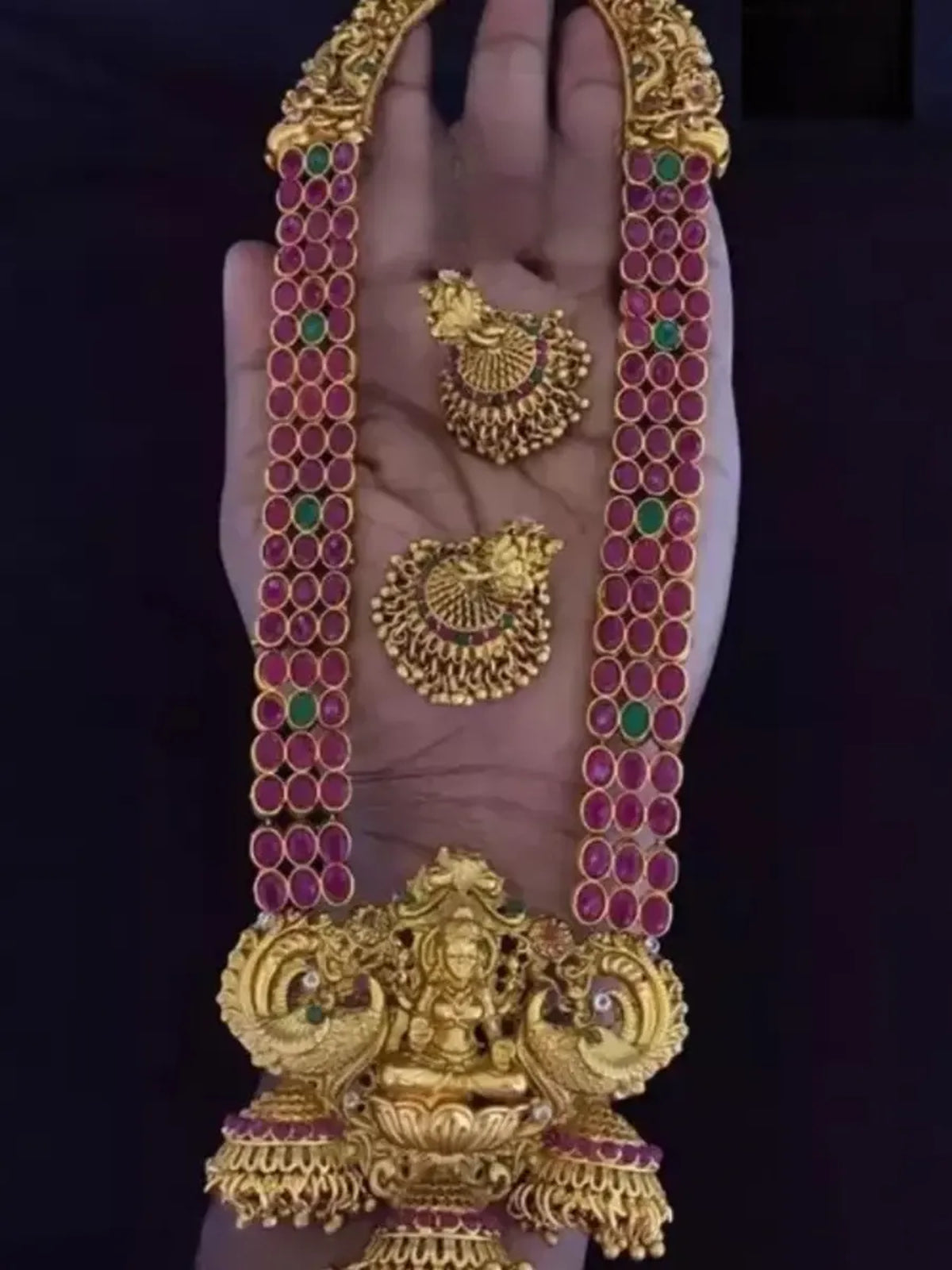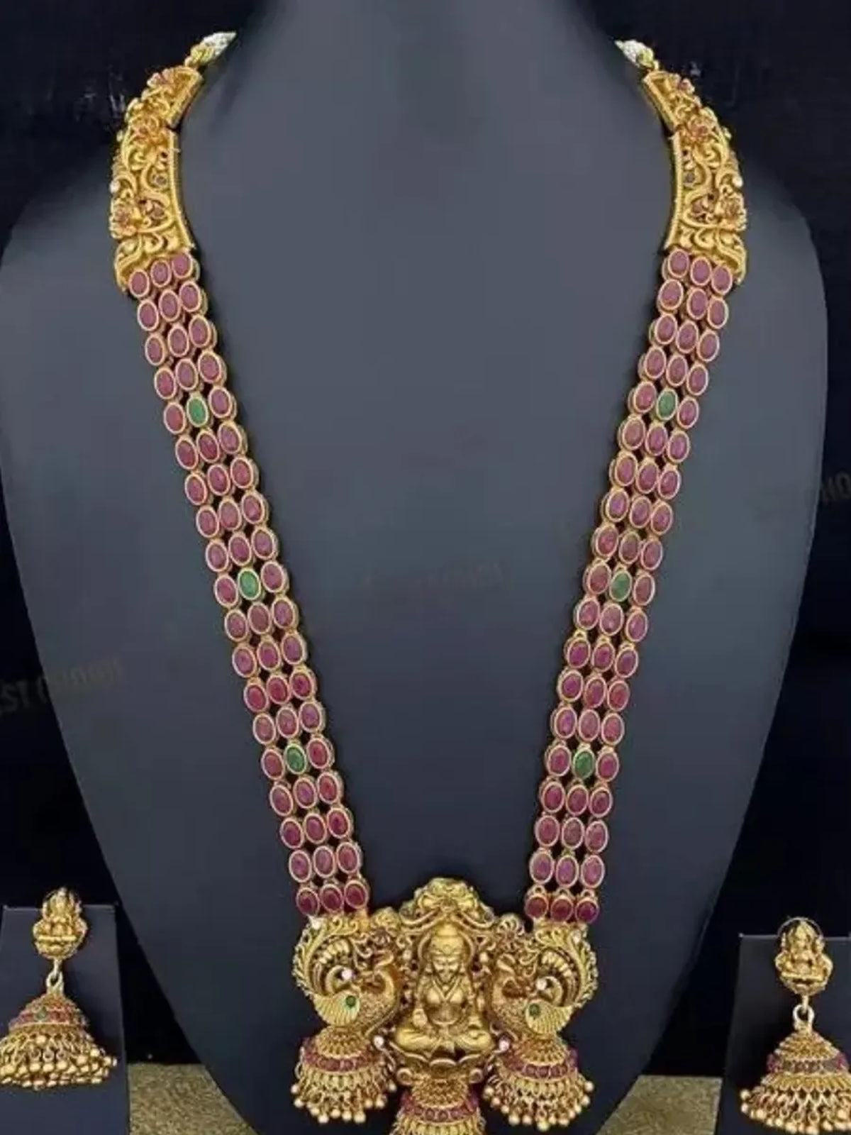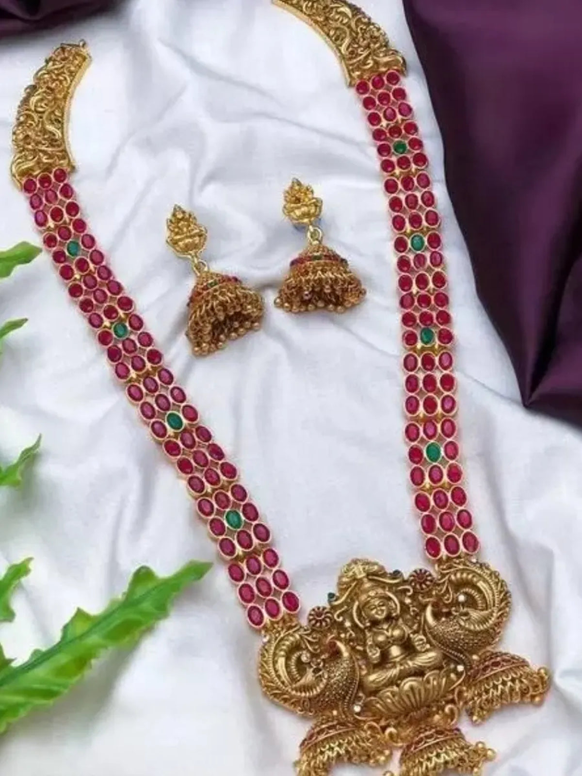 Traditional Lakshmi Temple Jewellery Set - Antique Red Green Stone Long Necklace With Jhumka Earrings