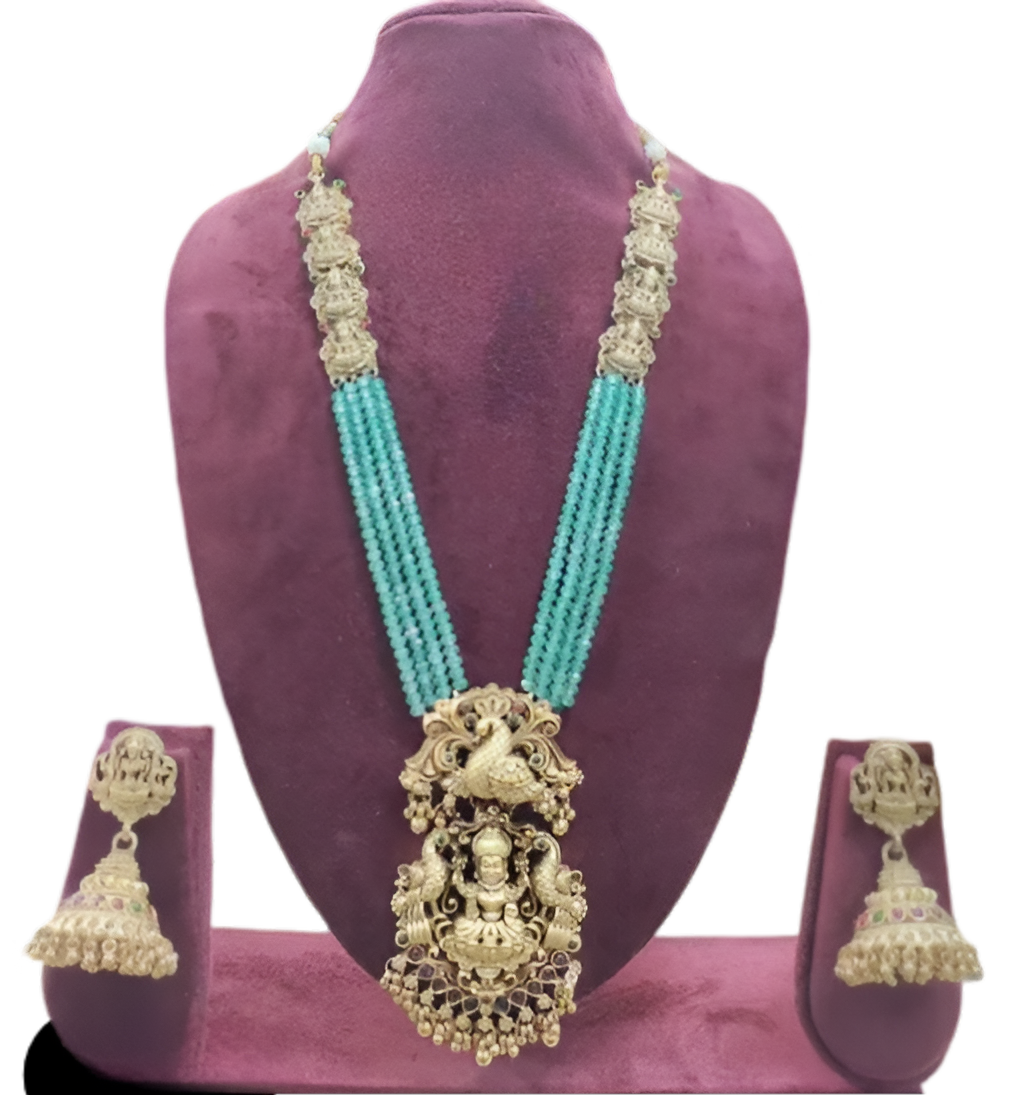 Gold-Plated Temple Jewelry Set With Green Beads – Lakshmi & Peacock Design