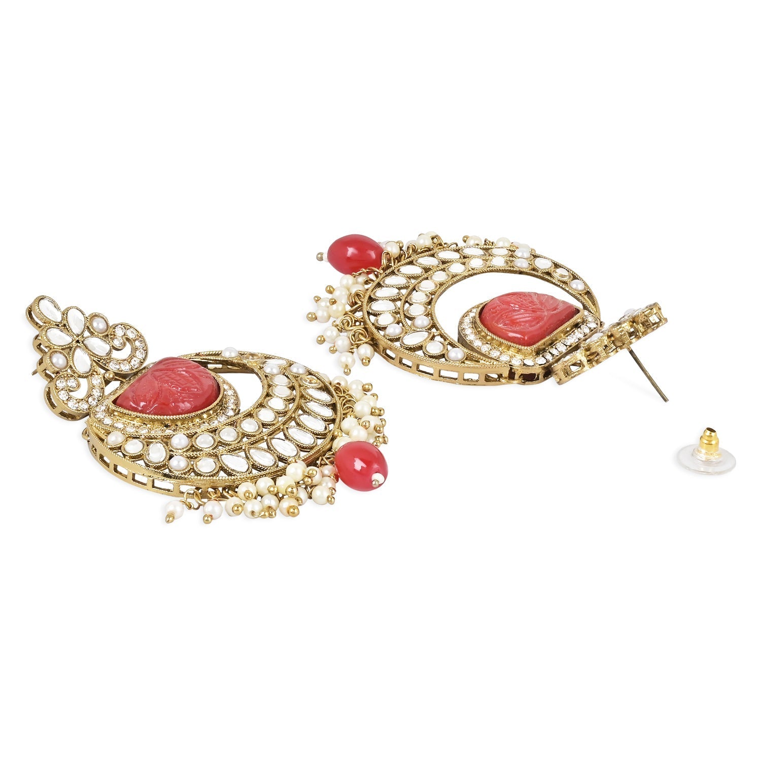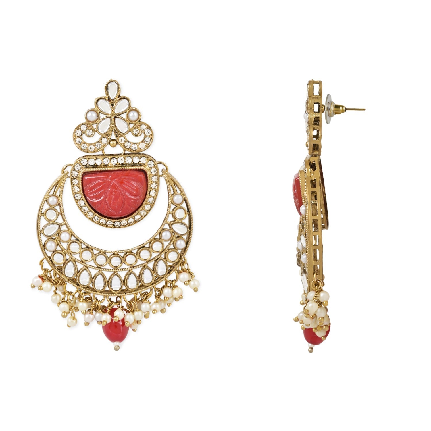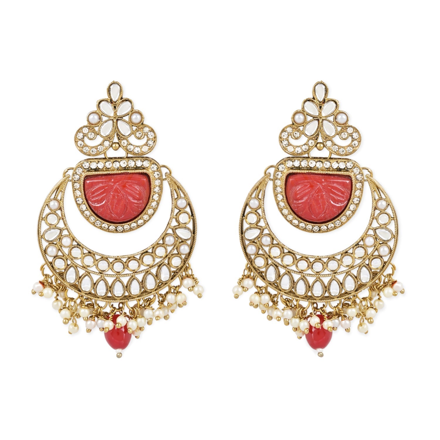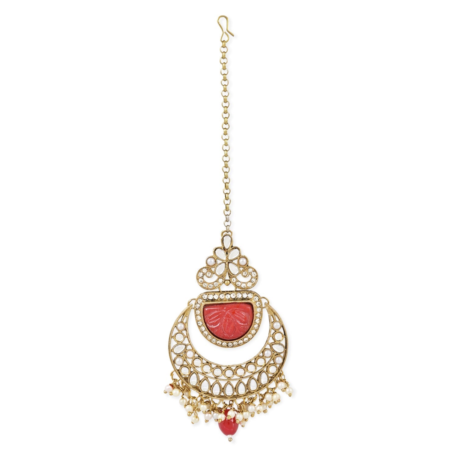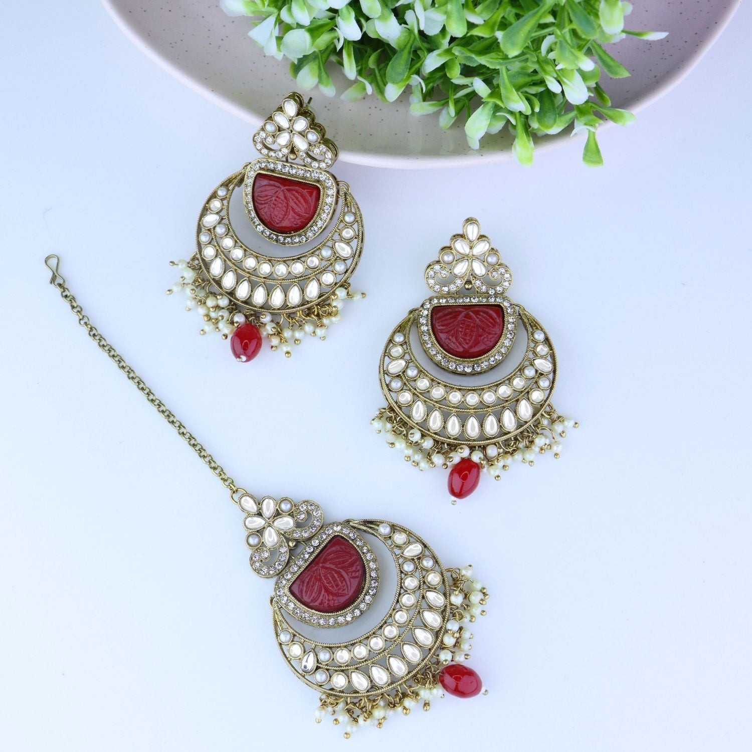 A Beautiful Set Of Jewelry That Will Add Elegance And Grace To Any Traditional Attire.These Chandbali Earrings Are Gold Plated And Adorned With Shimmering Kundan Stones That Sparkle In The Light. The Earrings Feature Traditional Pearl Hangings That Add A Touch Of Sophistication To The Design. Accompanying The Earrings Is A Matching Maang Tikka, Which Is Studded With Kundan Stones And Pearls. The Maang Tikka Beautifully Complements The Earrings And Adds A Touch Of Glamour To Any Hairstyle.This Jewelry Set Is Perfect For Weddings, Festivals, And Other Traditional Occasions. It Also Makes A Great Gift For Any Special Woman Or Girl In Your Life.