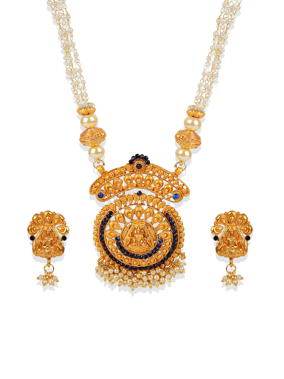 Antique Matte Gold Finish Goddess Laxmi Blue Stone Studded Temple Jewellery Set