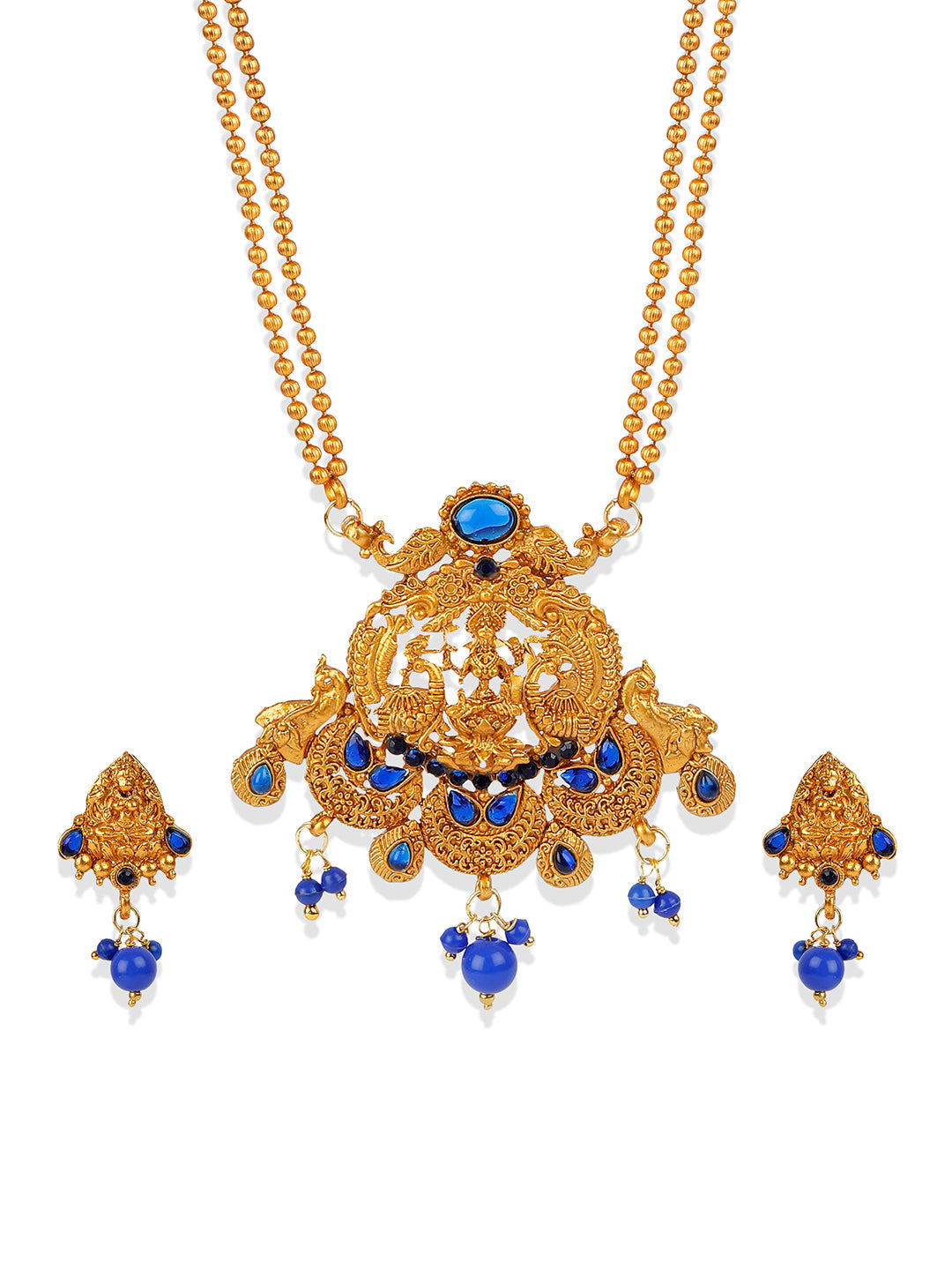 Antique Matte Gold Finish Blue Stone Studded Temple Jewellery Set