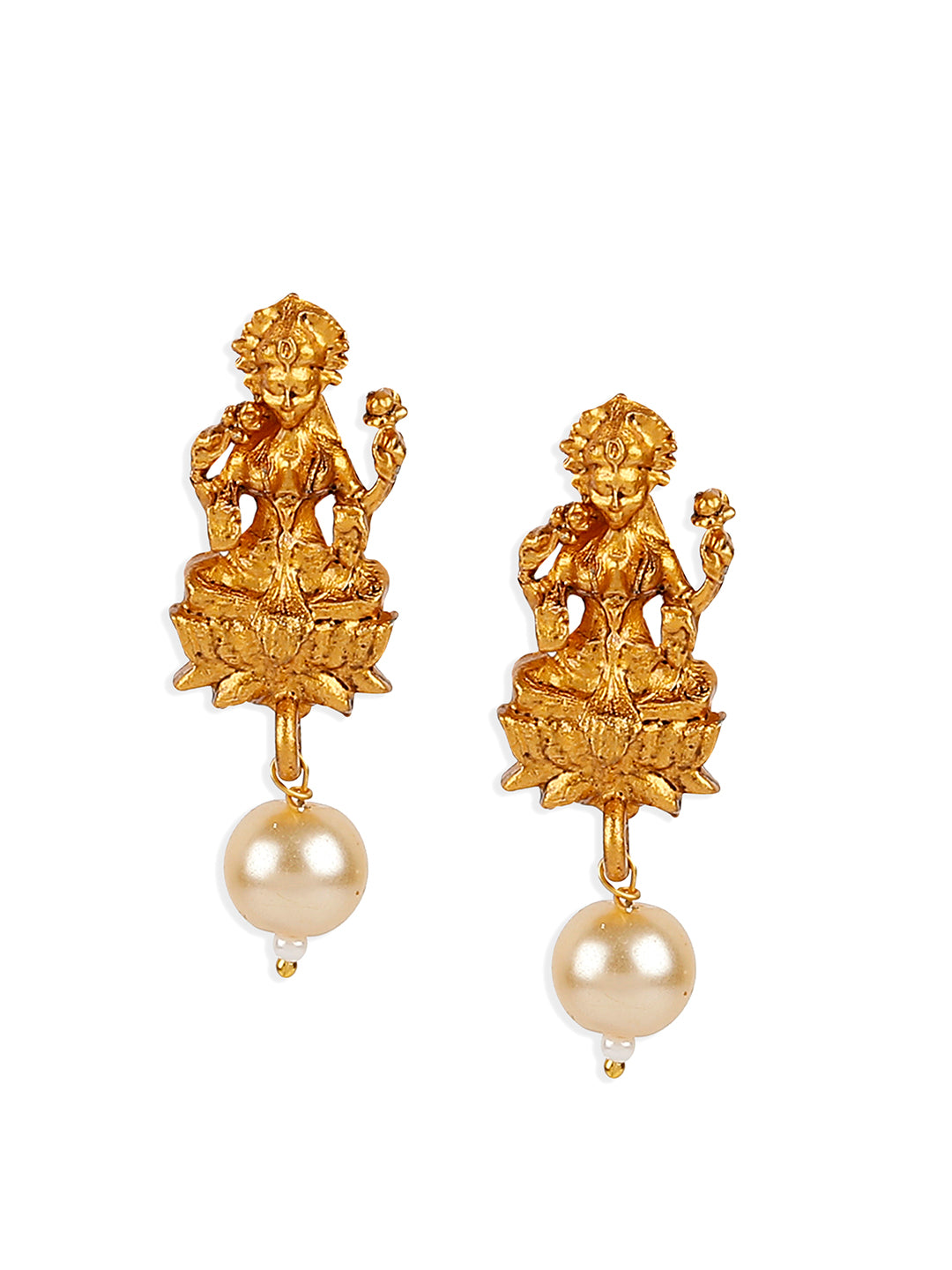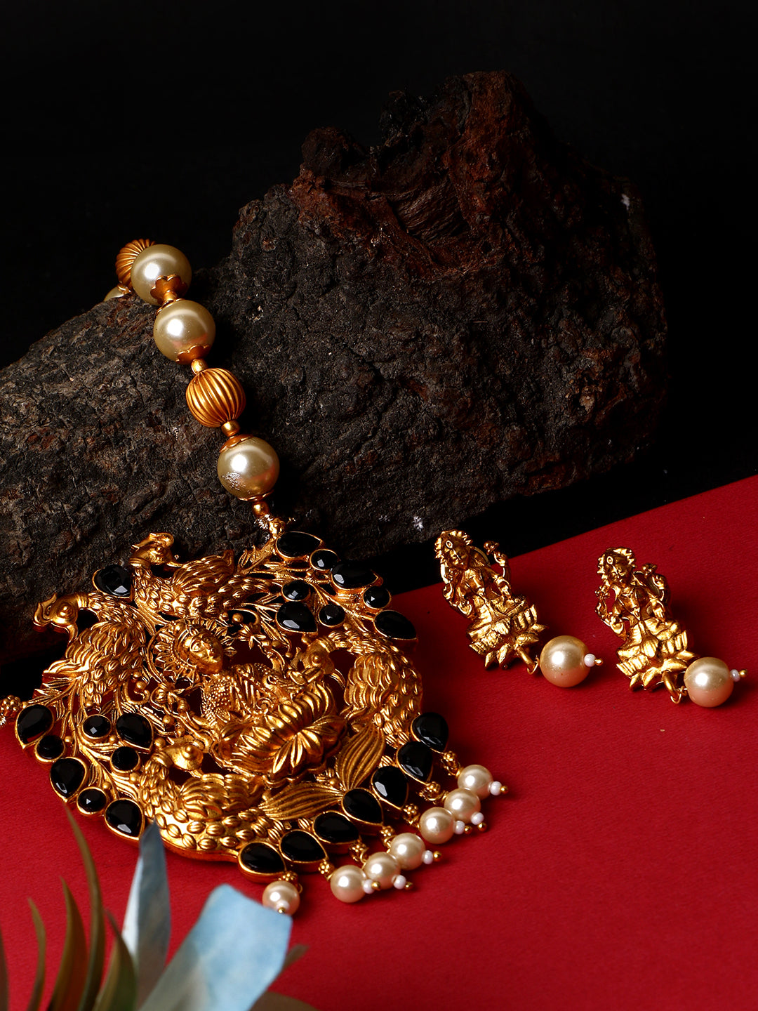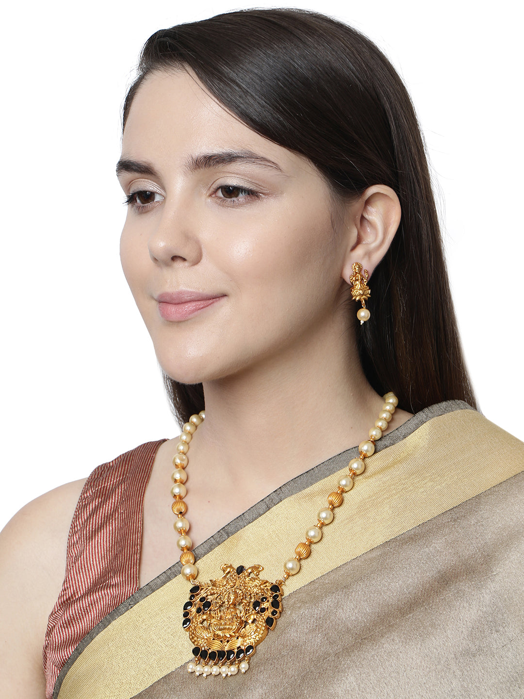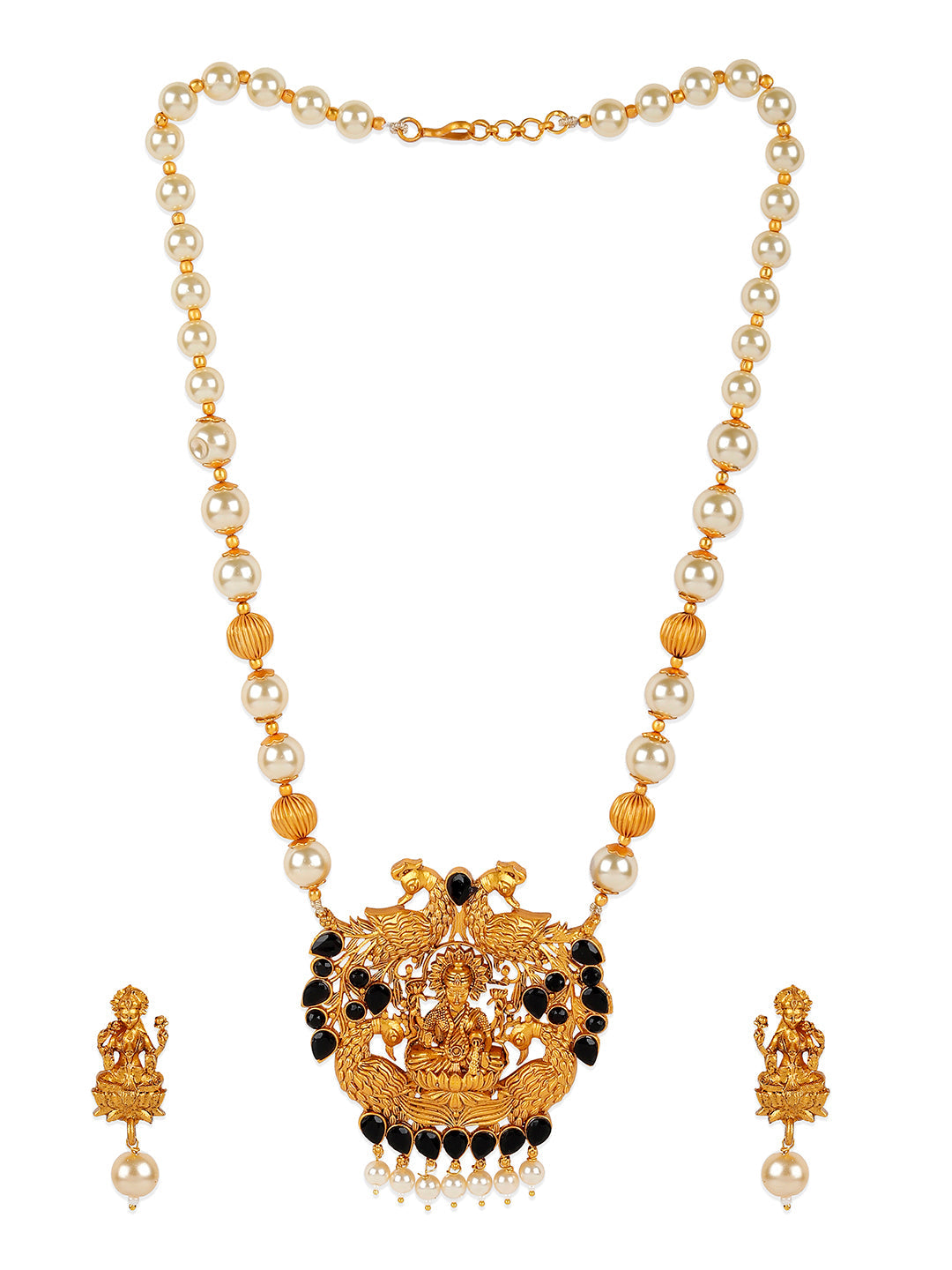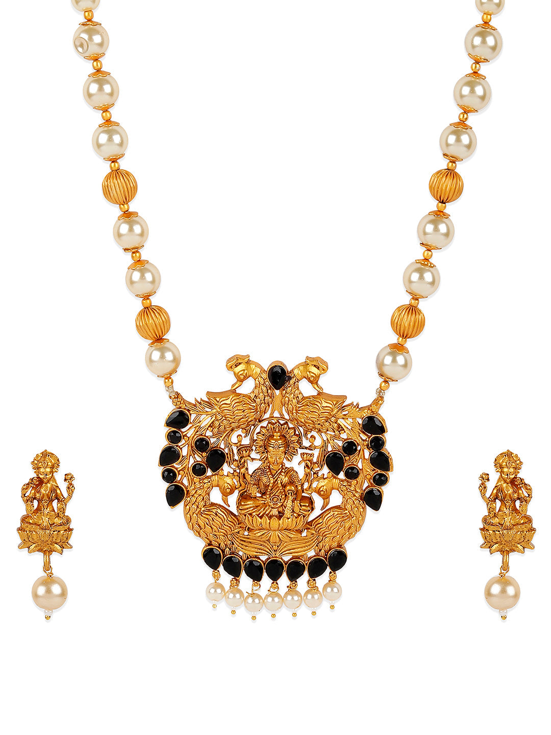 Antique Matte Gold Finish Goddess Laxmi Black Stone Studded Temple Jewellery Set