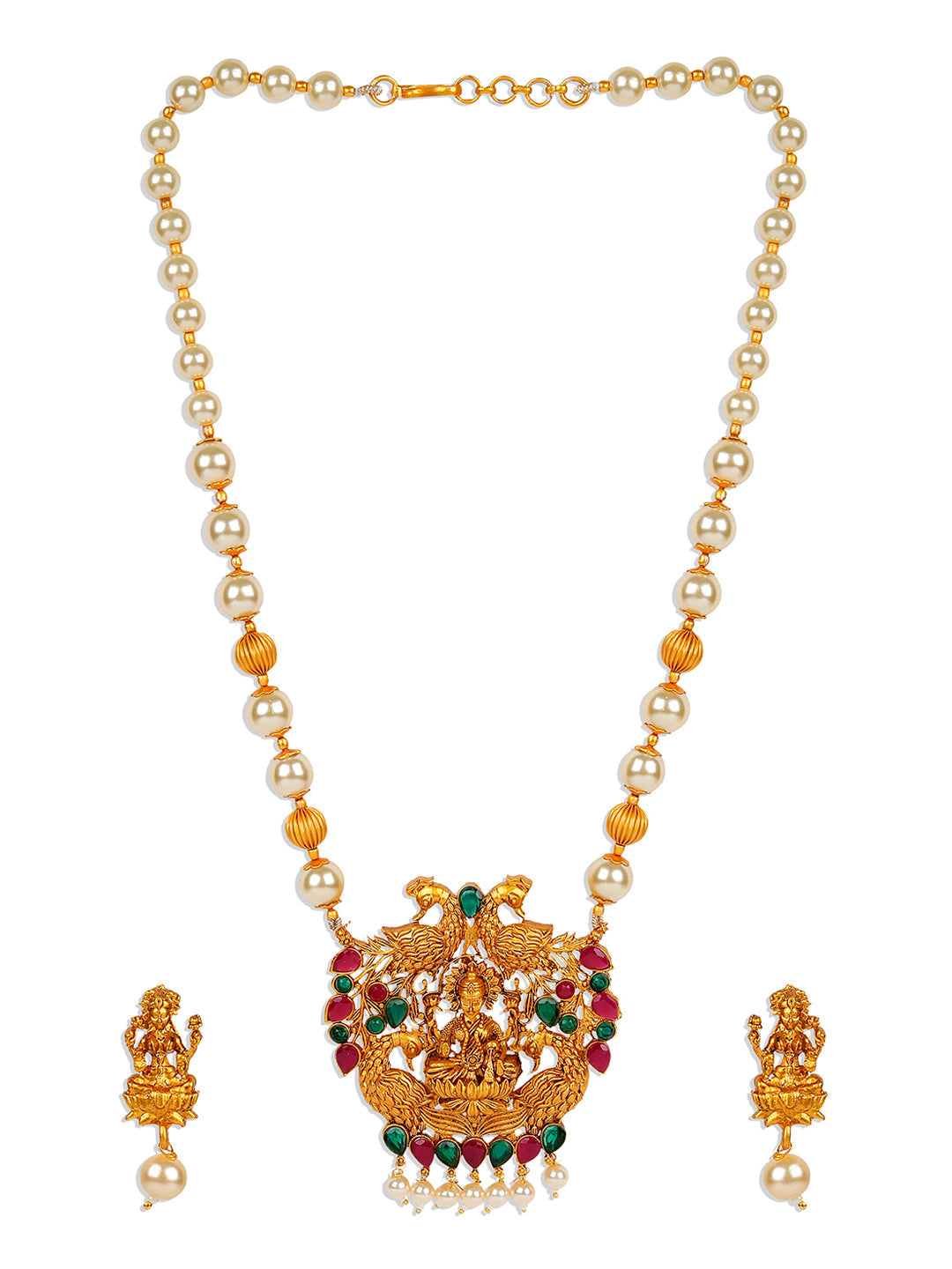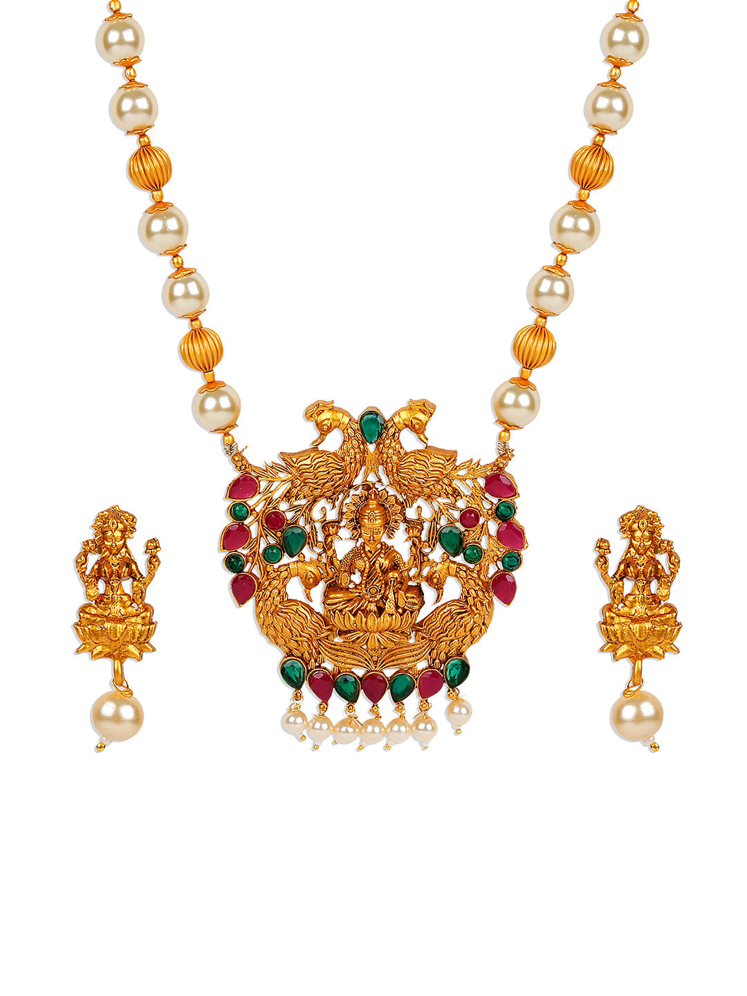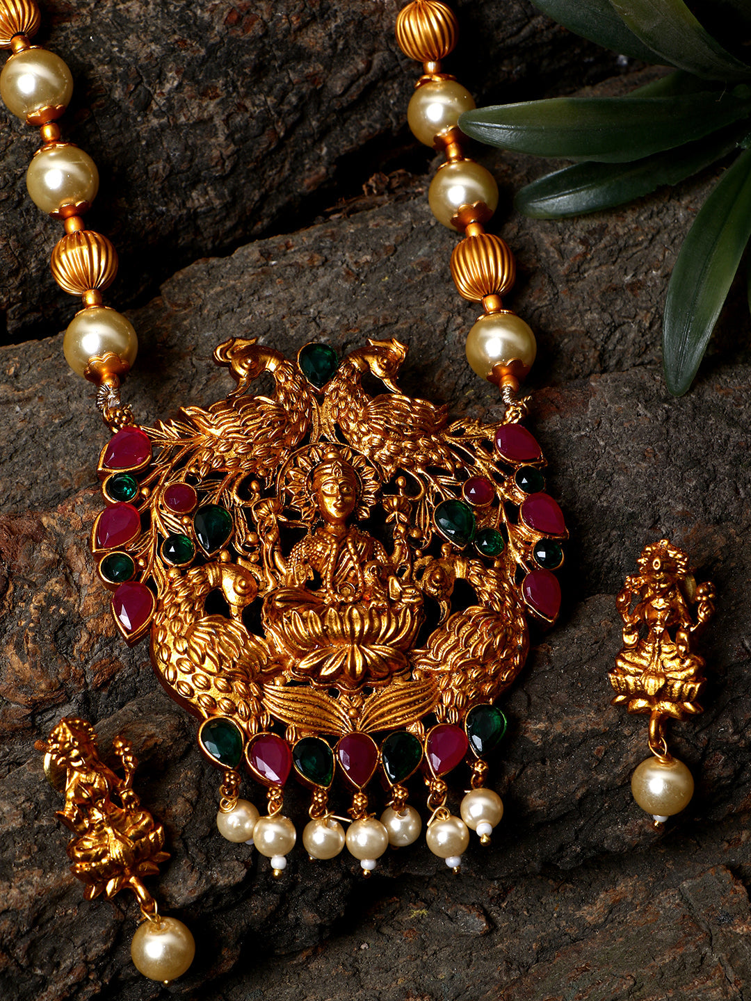 Antique Matte Gold Finish Goddess Laxmi Green Stone Studded Temple Jewellery Set