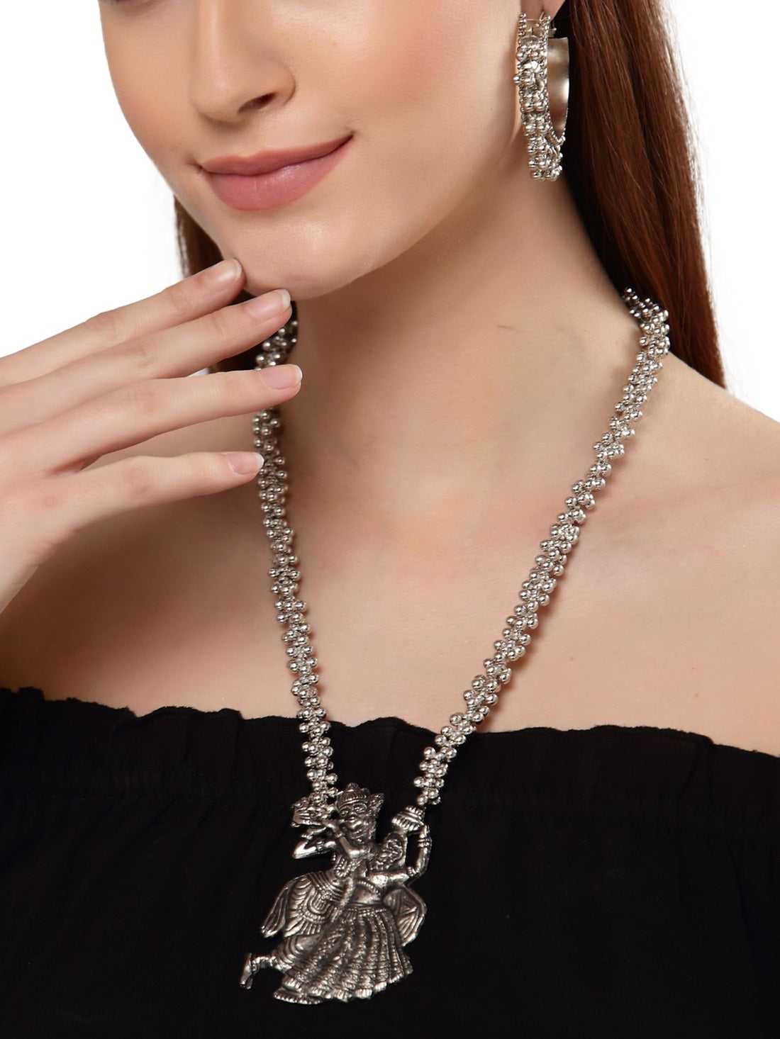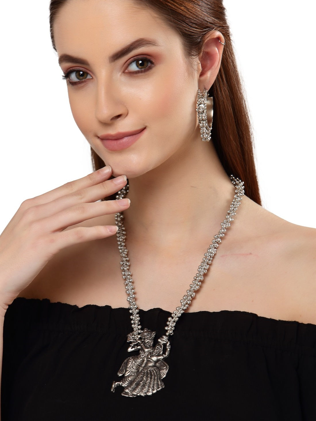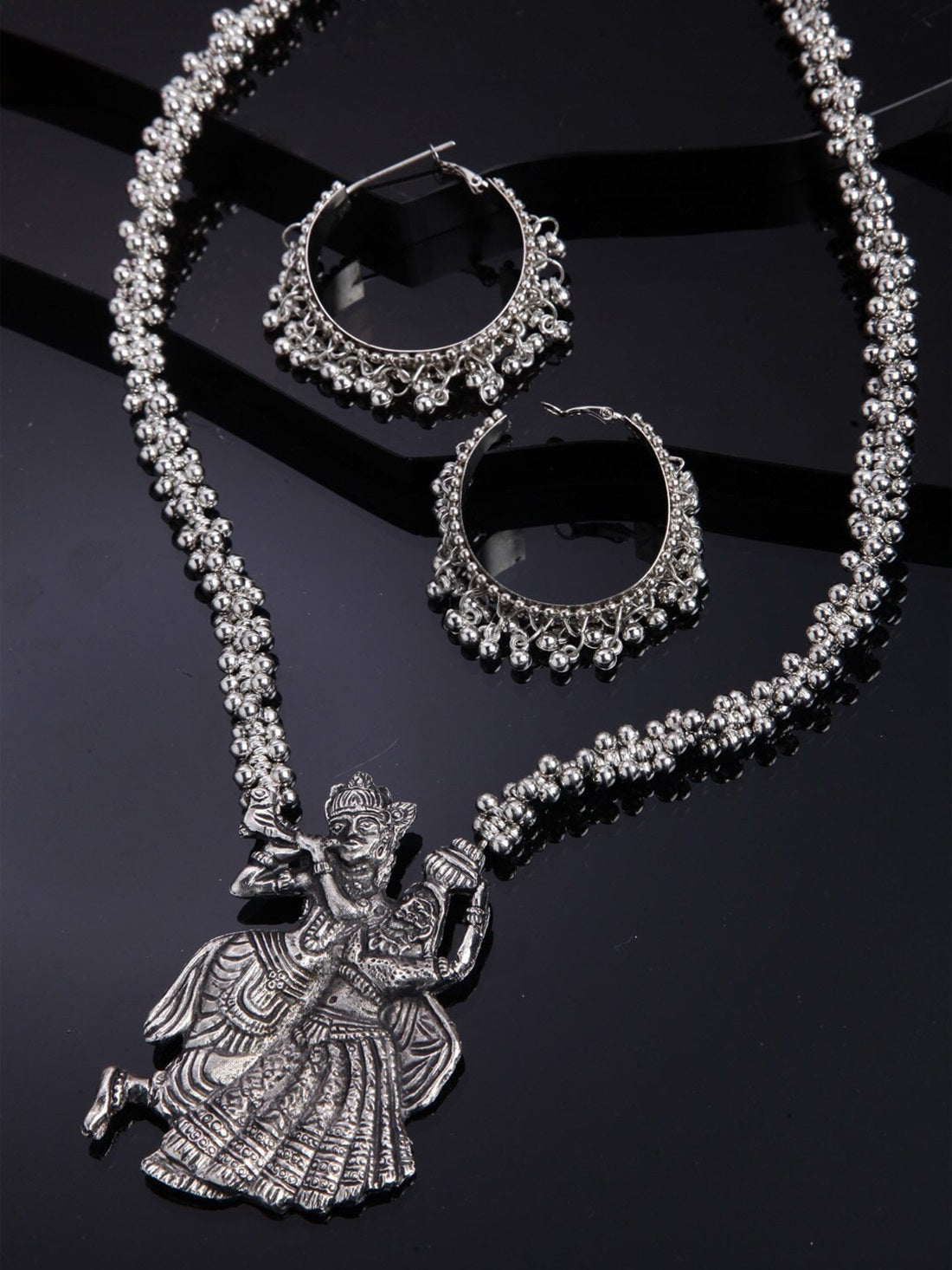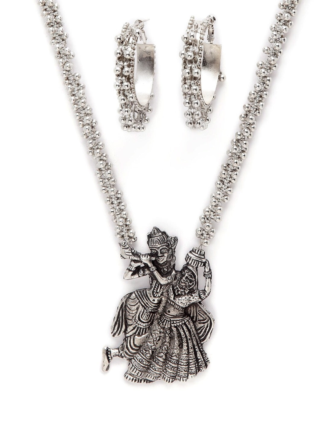Celebrate Tradition With This Oxidised Silver-Plated Jewelry Set By Vastrabhushan. This Exquisite Set Features A Beautifully Crafted Necklace Adorned With Intricate Radha-Krishna Motifs And Secured With An S-Hook Closure. Complementing The Necklace Is A Matching Pair Of Earrings With A Hoop Wire Closure, Completing The Look With Elegance. Perfect For Festive Occasions Or Cultural Events, This Timeless Set Adds A Touch Of Heritage And Sophistication To Your Ensemble.