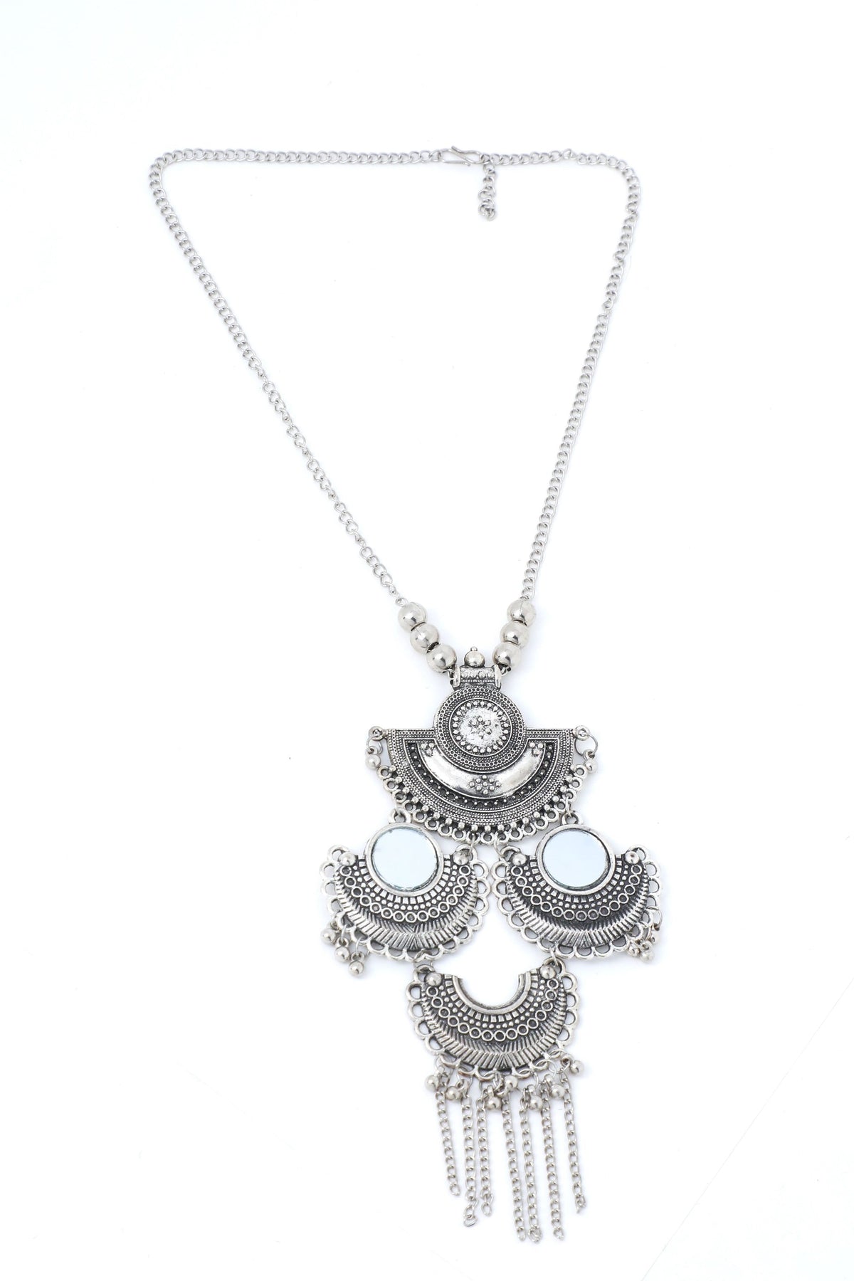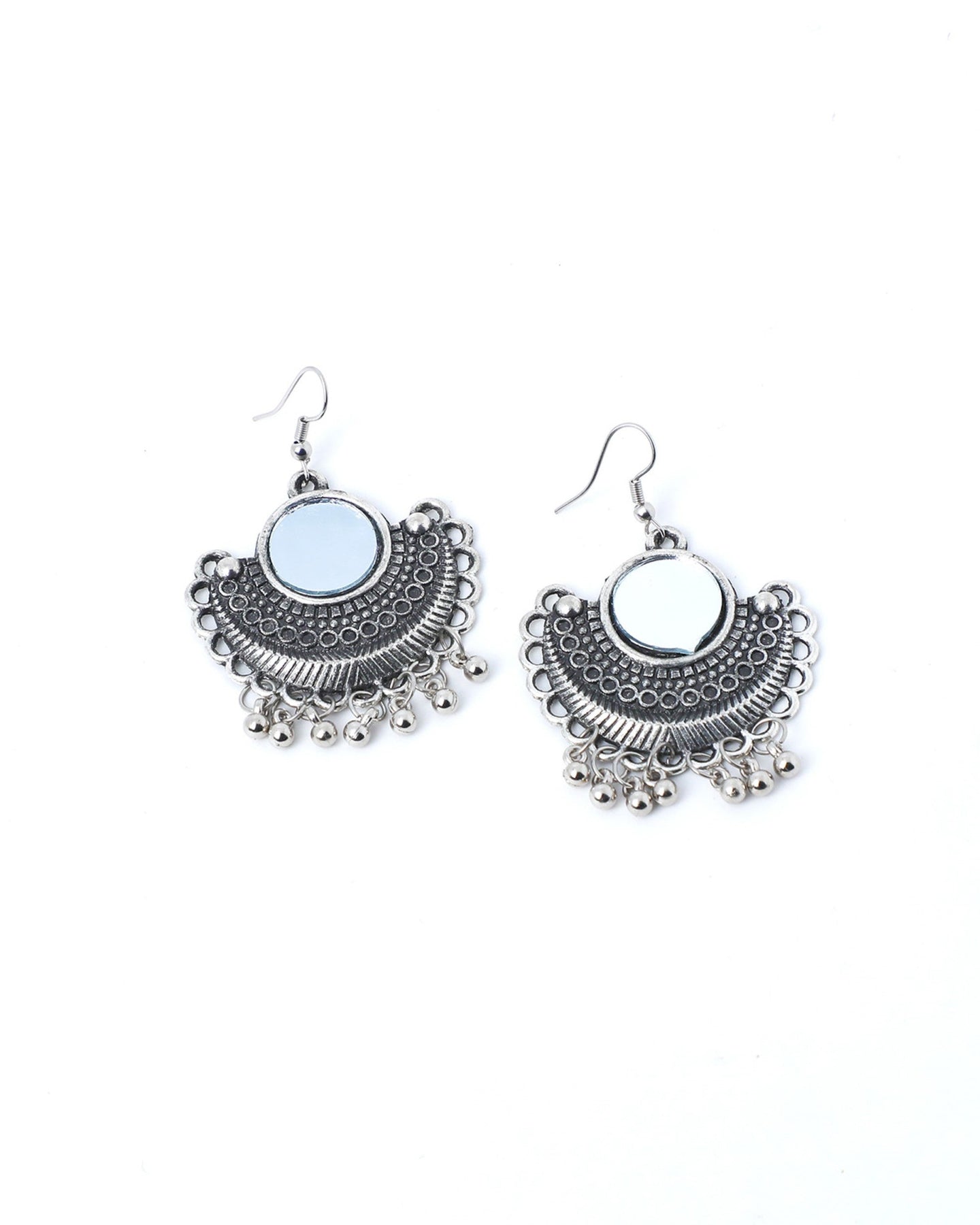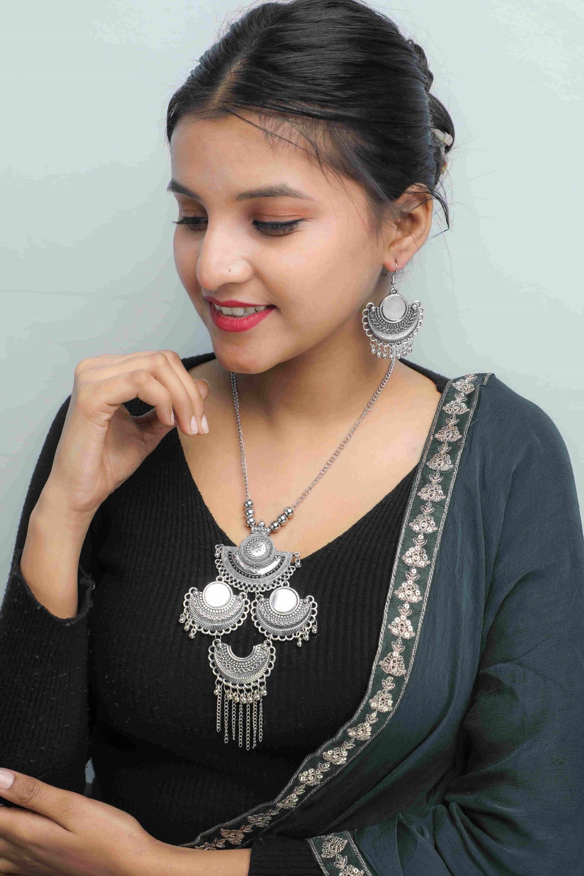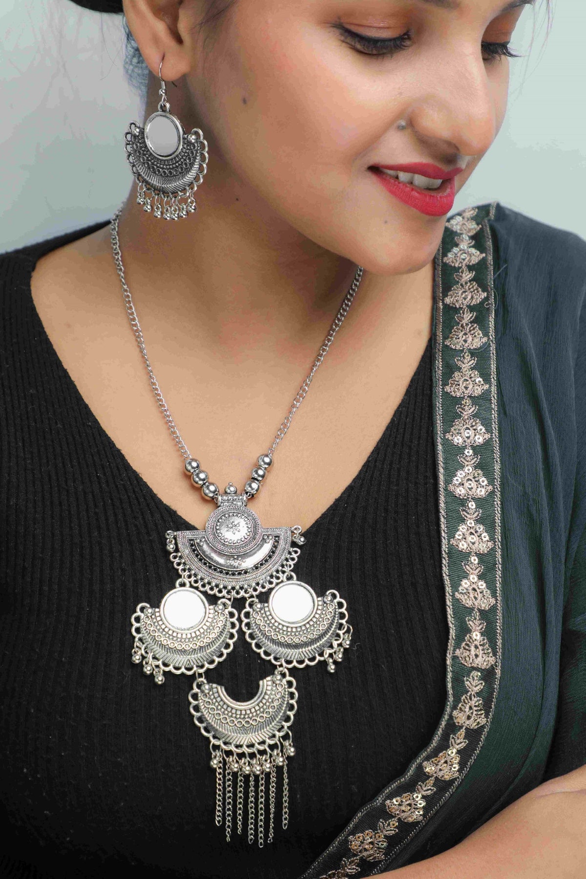 Introducing our enchanting Oxidized Silver Plated Mirror and Ghungroo Beads Jewelry Set a fusion of traditional craftsmanship and contemporary elegance. This exquisite ensemble is a celebration of cultural heritage and modern style, combining the allure of mirrors with the rhythmic charm of ghungroo beads. The mirrors reflect light beautifully, creating a mesmerizing play of sparkle and shine. The oxidized finish adds a timeless quality, giving the set a unique character and depth.