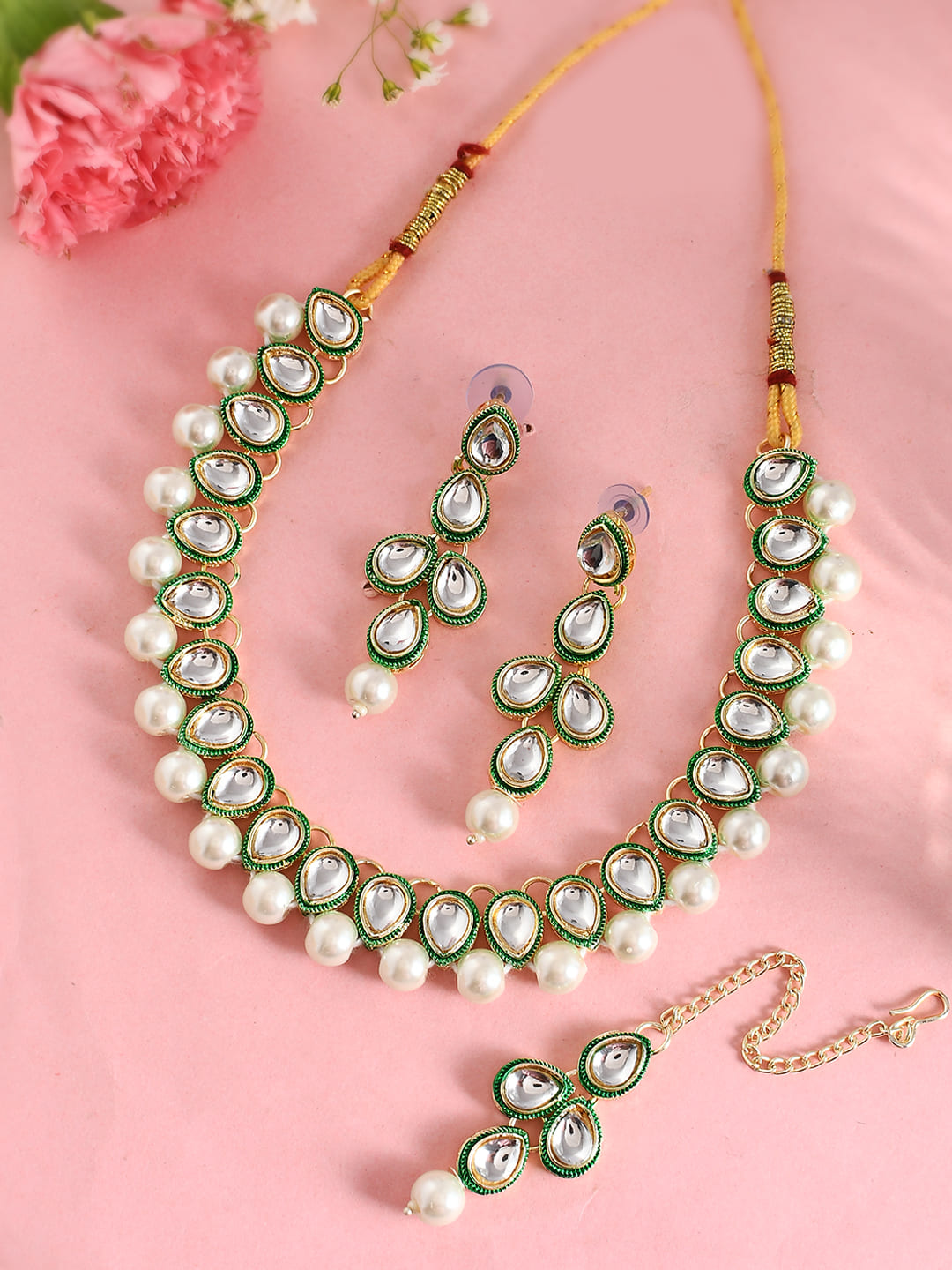 Experience The Epitome Of Sophistication With Our White Pearl Kundan Necklace And Earring Set, Complete With A Mang Tikka. Impeccably Crafted, This Set Showcases Lustrous White Pearls And Intricate Kundan Work, Exuding Timeless Elegance. The Matching Mang Tikka Adds A Touch Of Regal Charm. Elevate Your Ensemble With This Exquisite Jewelry Set, Perfect For Weddings, Parties, And Special Occasions.