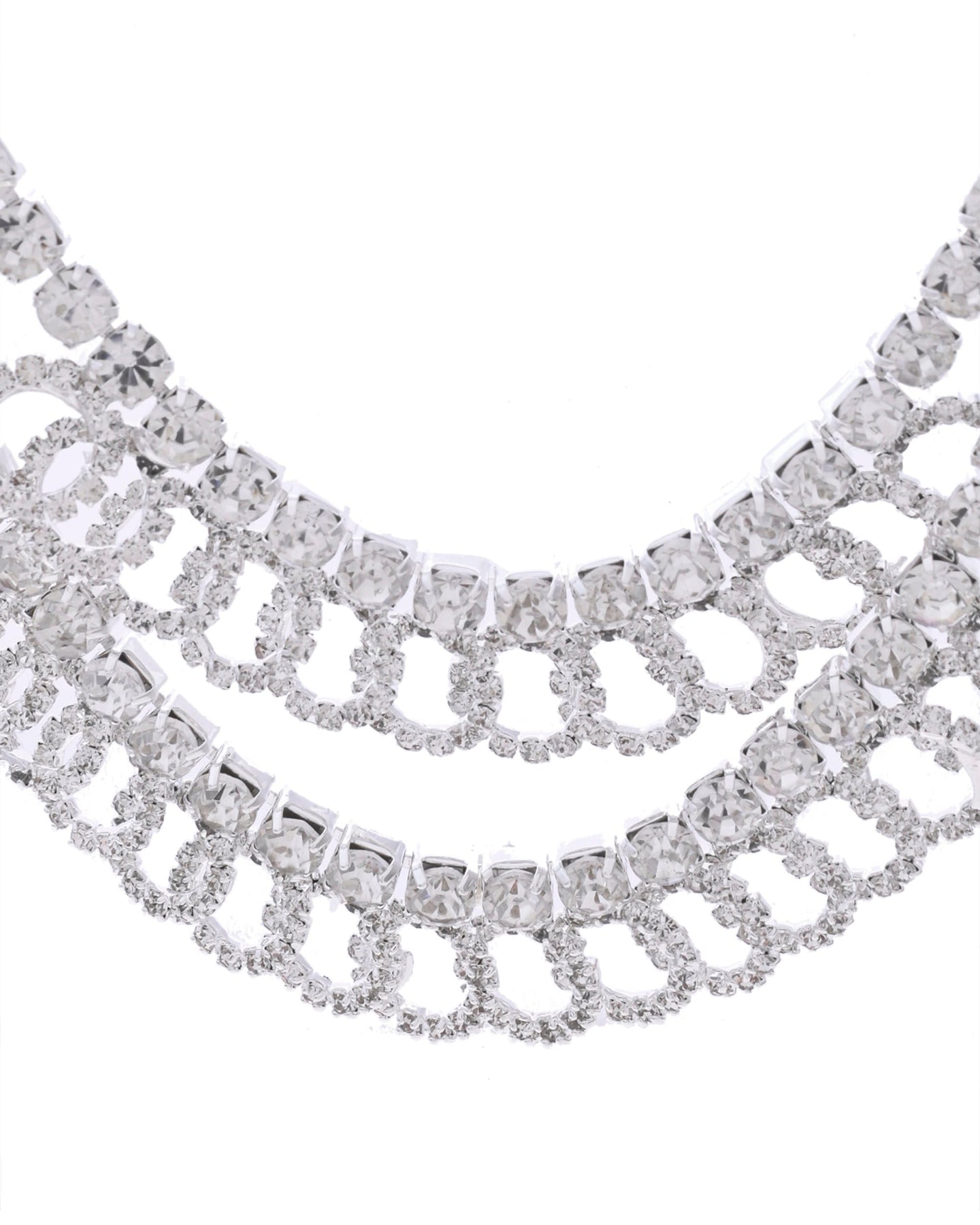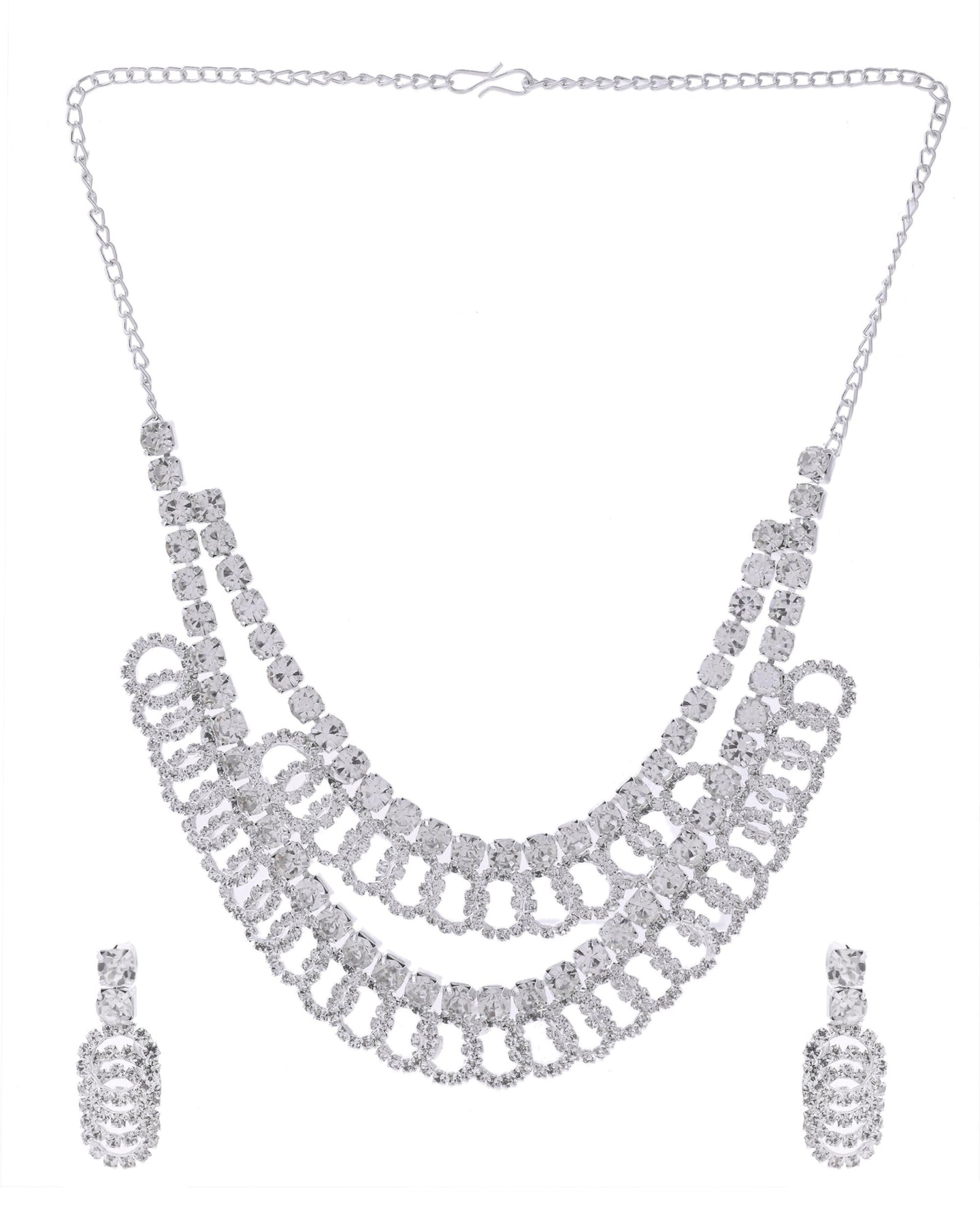 Make A Statement With This Silver-Plated Stone Studded Circular Multi-Layer Necklace Set. Featuring Sparkling Stones Arranged In Elegant Circular Patterns Across Multiple Layers, It Adds Depth And Glamour To Any Outfit. The Silver Plating Ensures A Polished, Durable Finish, While The Lightweight Design Offers Comfortable Wear. Perfect For Festive Occasions And Special Events.