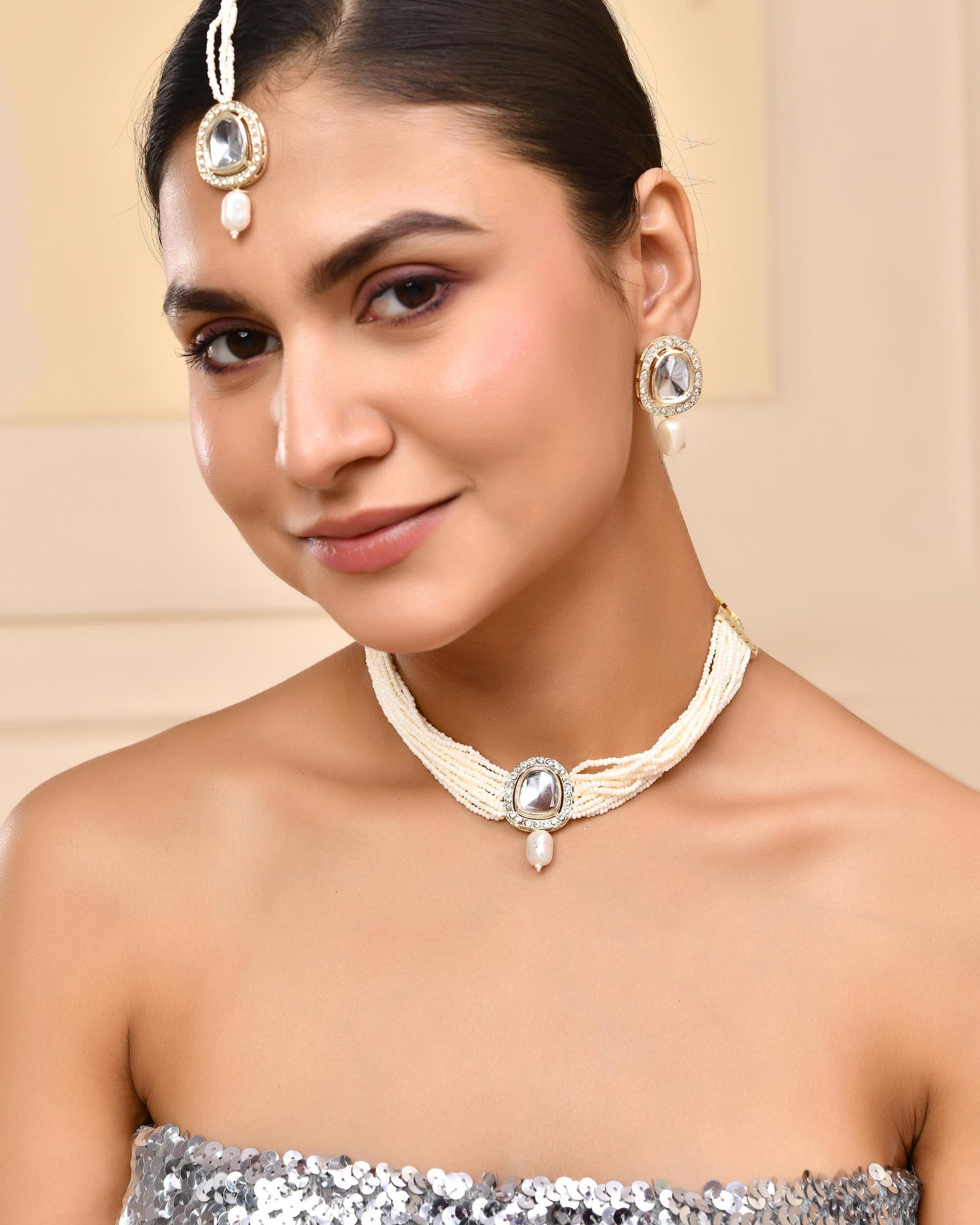 Elevate Your Elegance With This White Kundan Studded Choker Set. Featuring Exquisite White Kundan Stones Intricately Set In A Classic Choker Design, This Set Includes Matching Earrings For A Complete Look. Perfect For Weddings, Festive Occasions, Or Special Events, It Adds A Timeless And Regal Touch To Any Outfit.