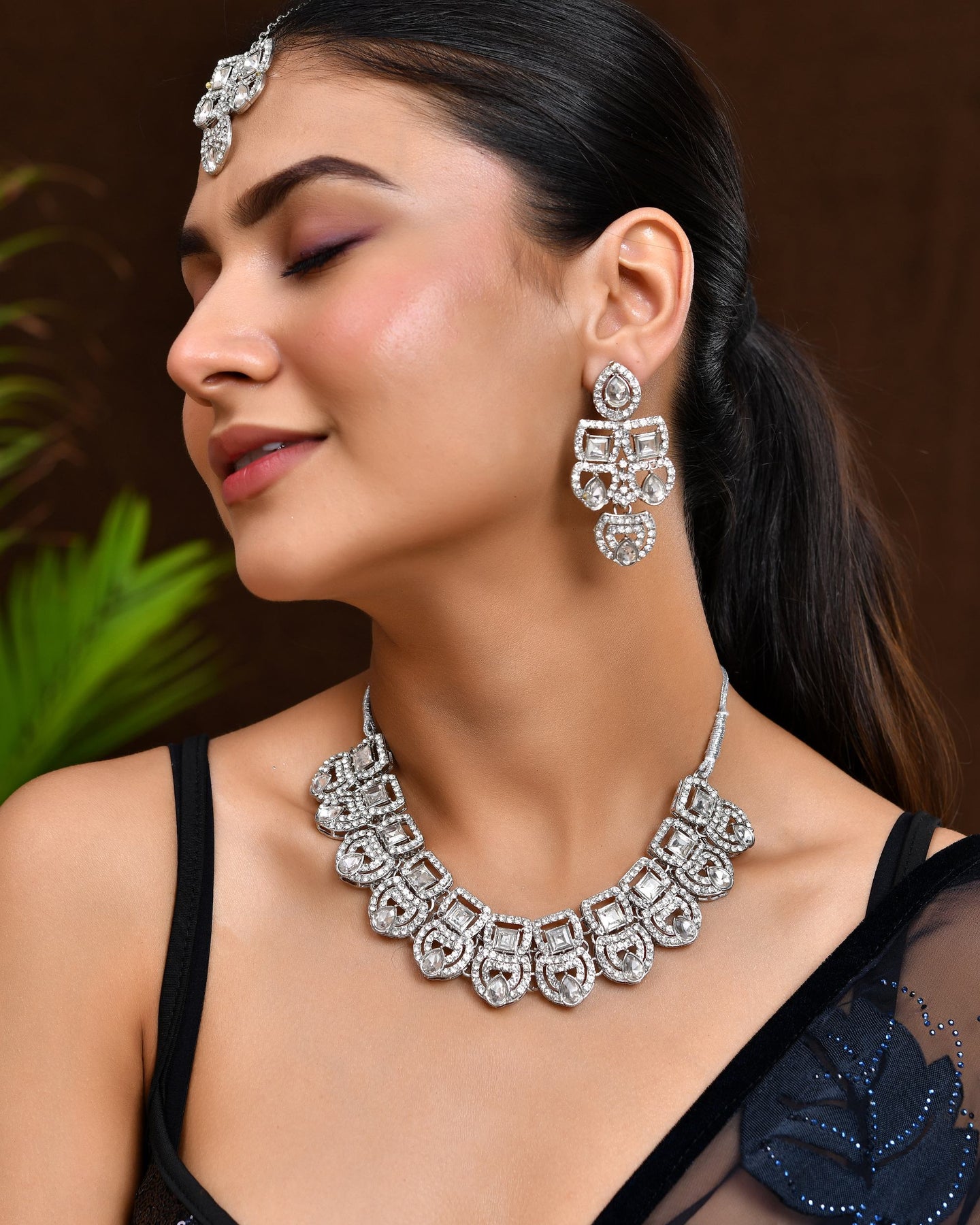Radiate Elegance With This Silver-Plated American Diamond Studded Jewellery Set. Featuring A Stunning Necklace And Matching Earrings, Each Piece Is Adorned With Sparkling American Diamonds For A Luxurious Finish. The Silver Plating Adds Timeless Charm, Making It Perfect For Weddings, Parties, Or Festive Celebrations. A Dazzling Addition To Your Jewellery Collection That Exudes Grace And Sophistication.