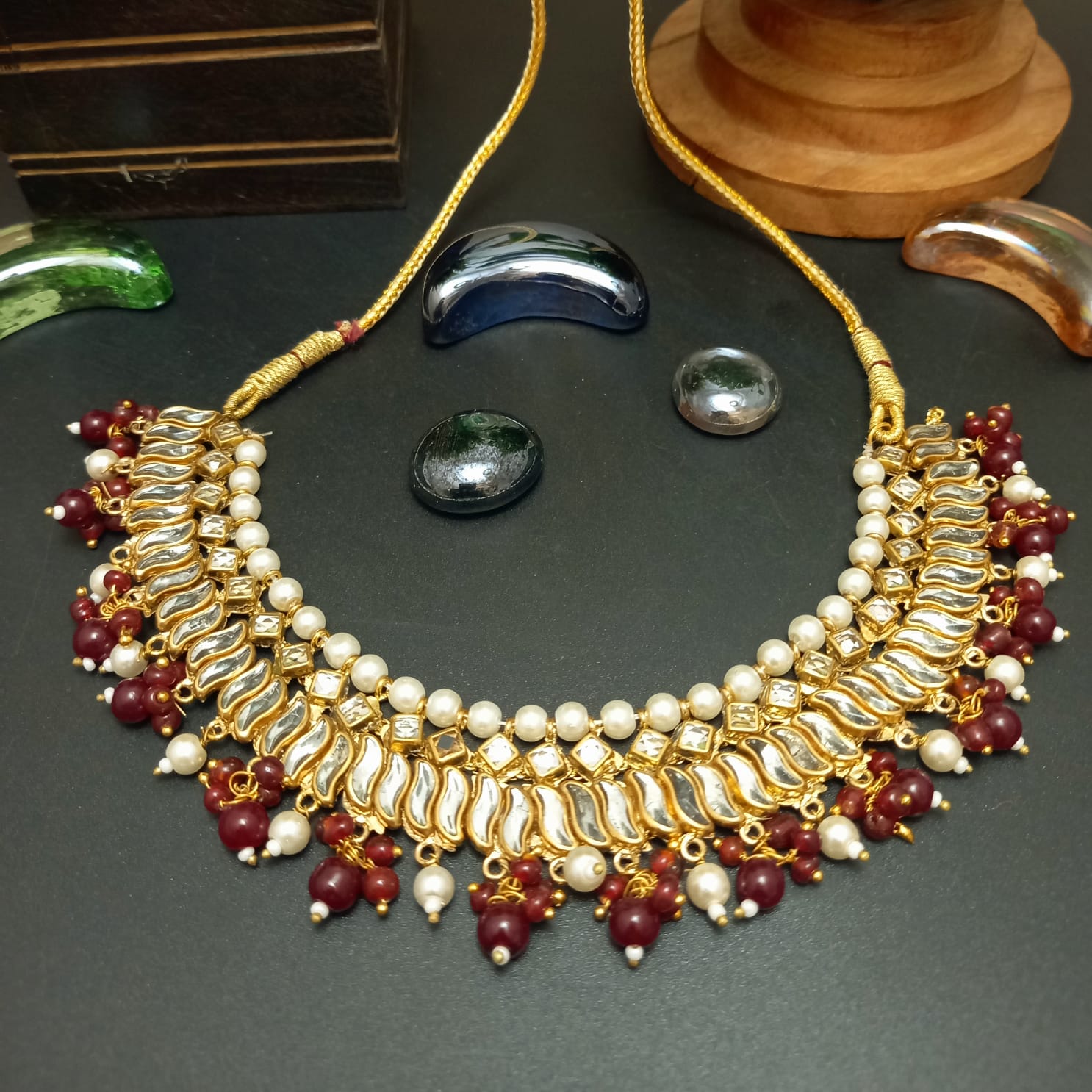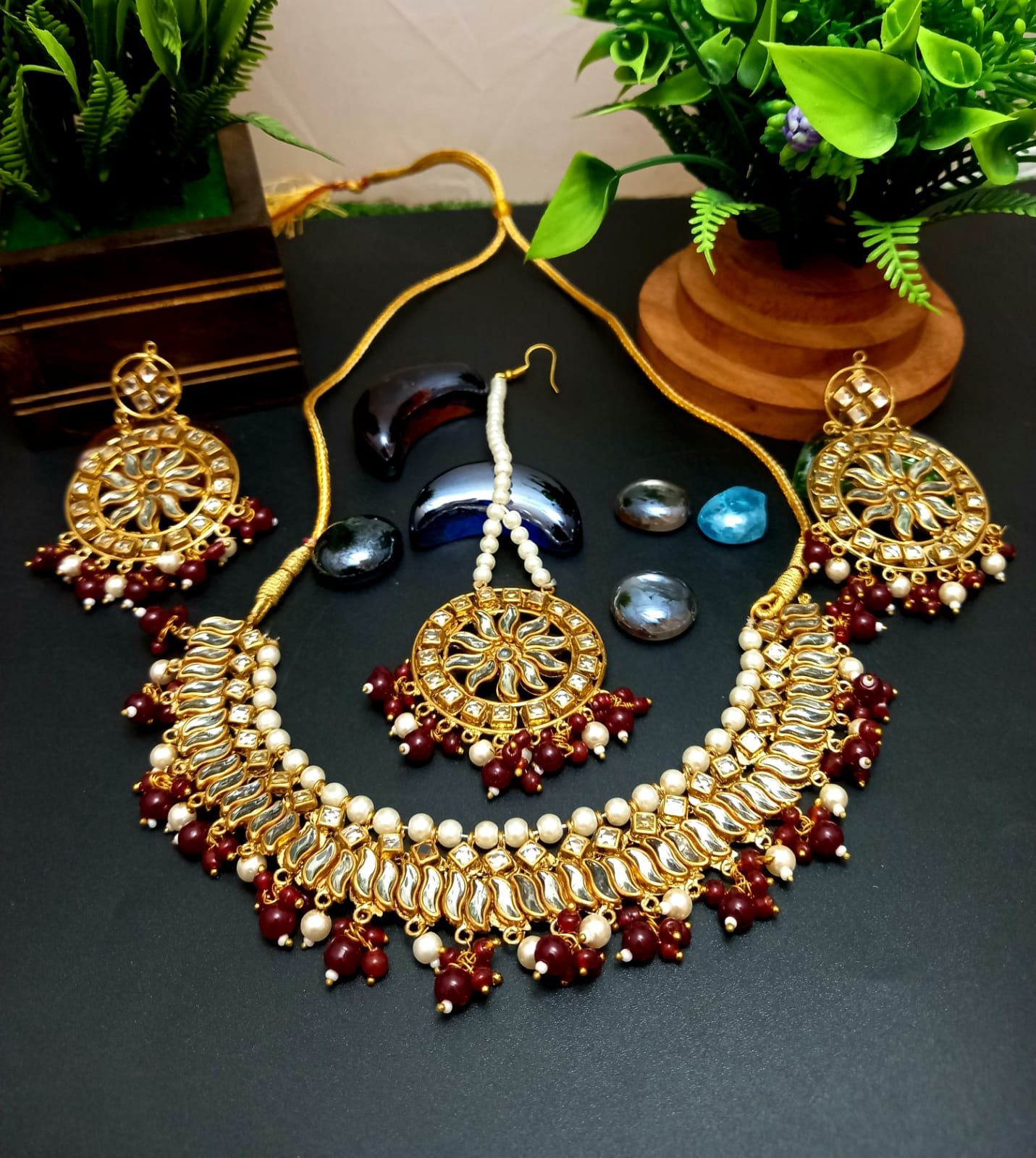 Red Colour Copper Base Kundan Pearl Necklace Jewellery With Maangtika , Very Light Weight