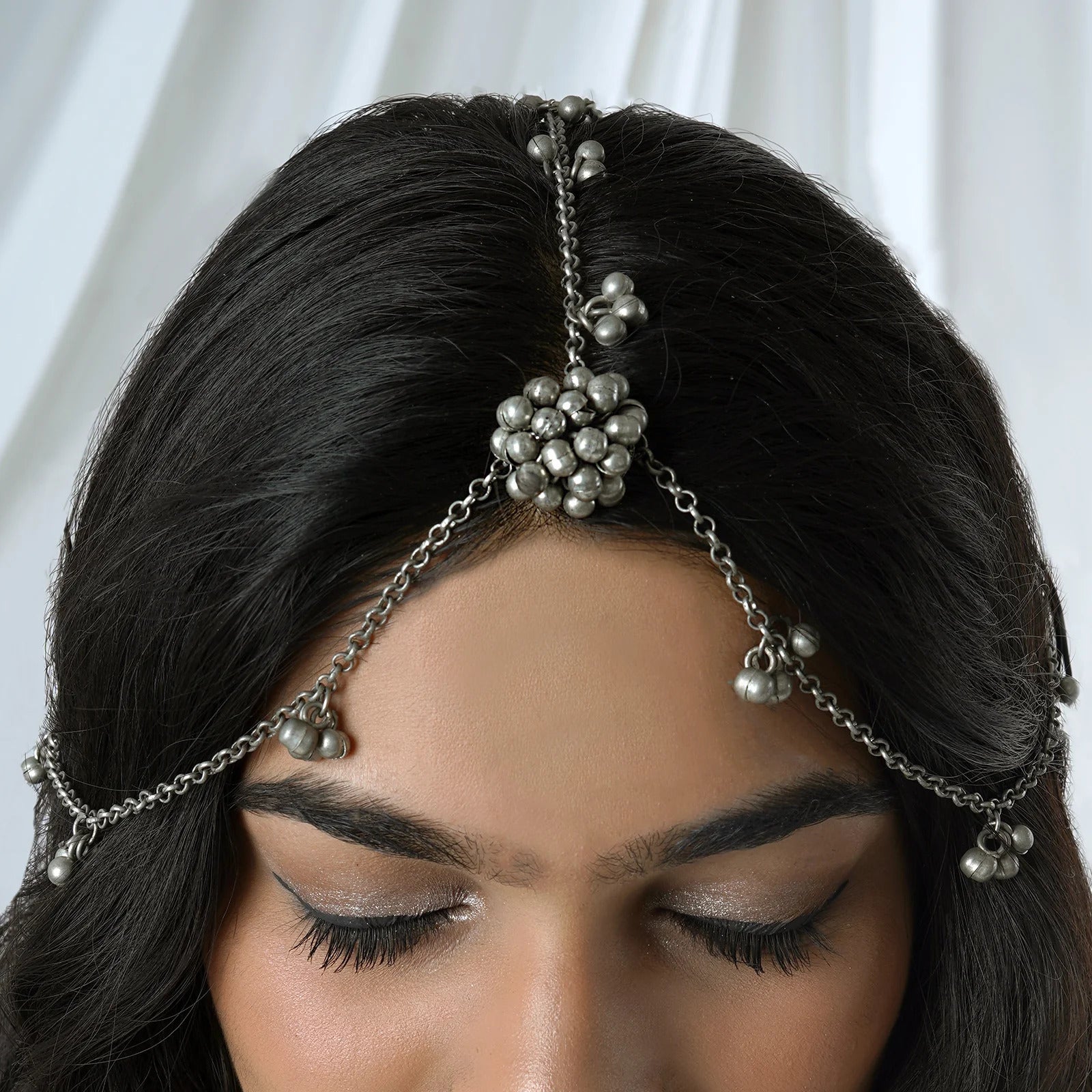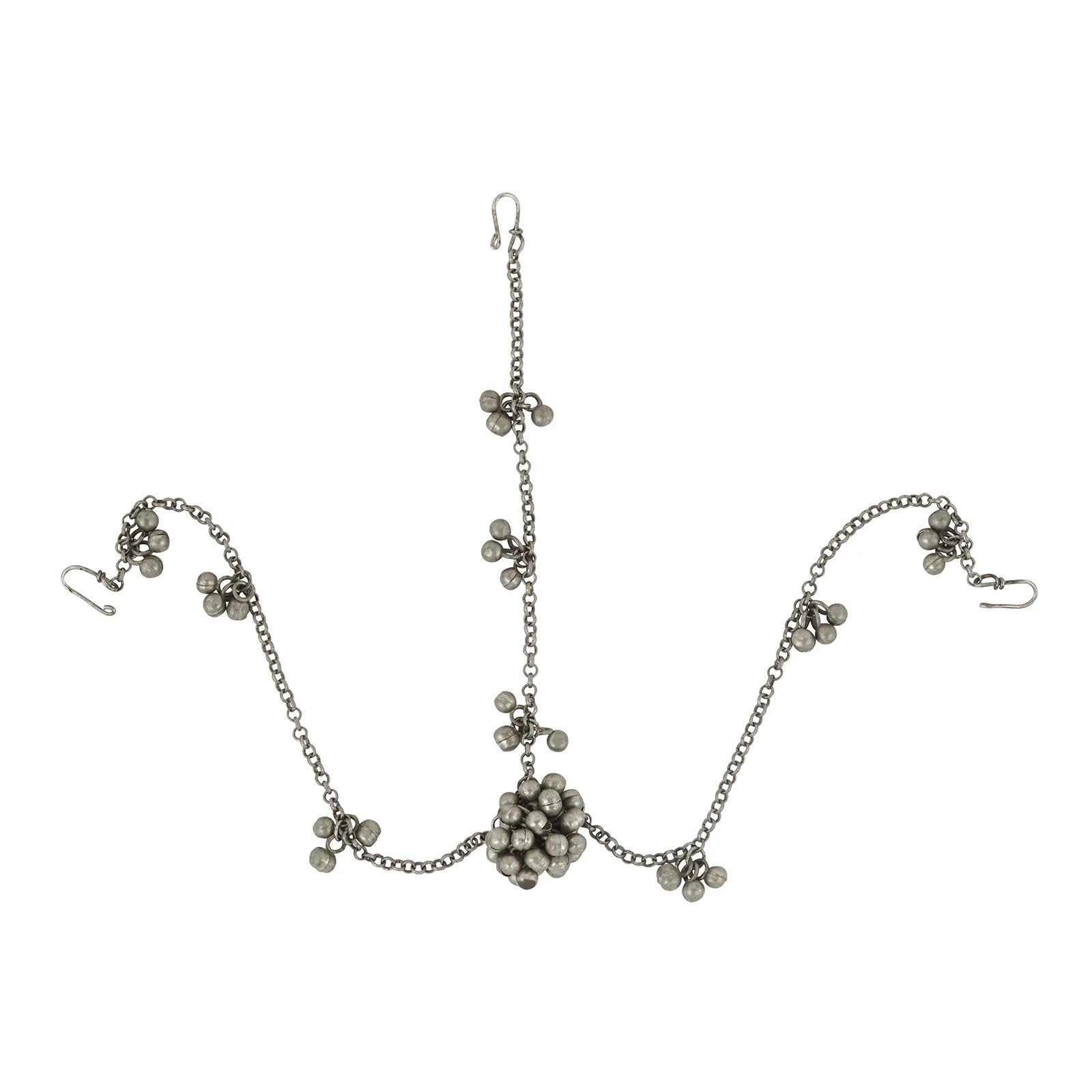 Women's Silver Oxidised Maang Tikka With Intricate Details And Ghungroo Accents