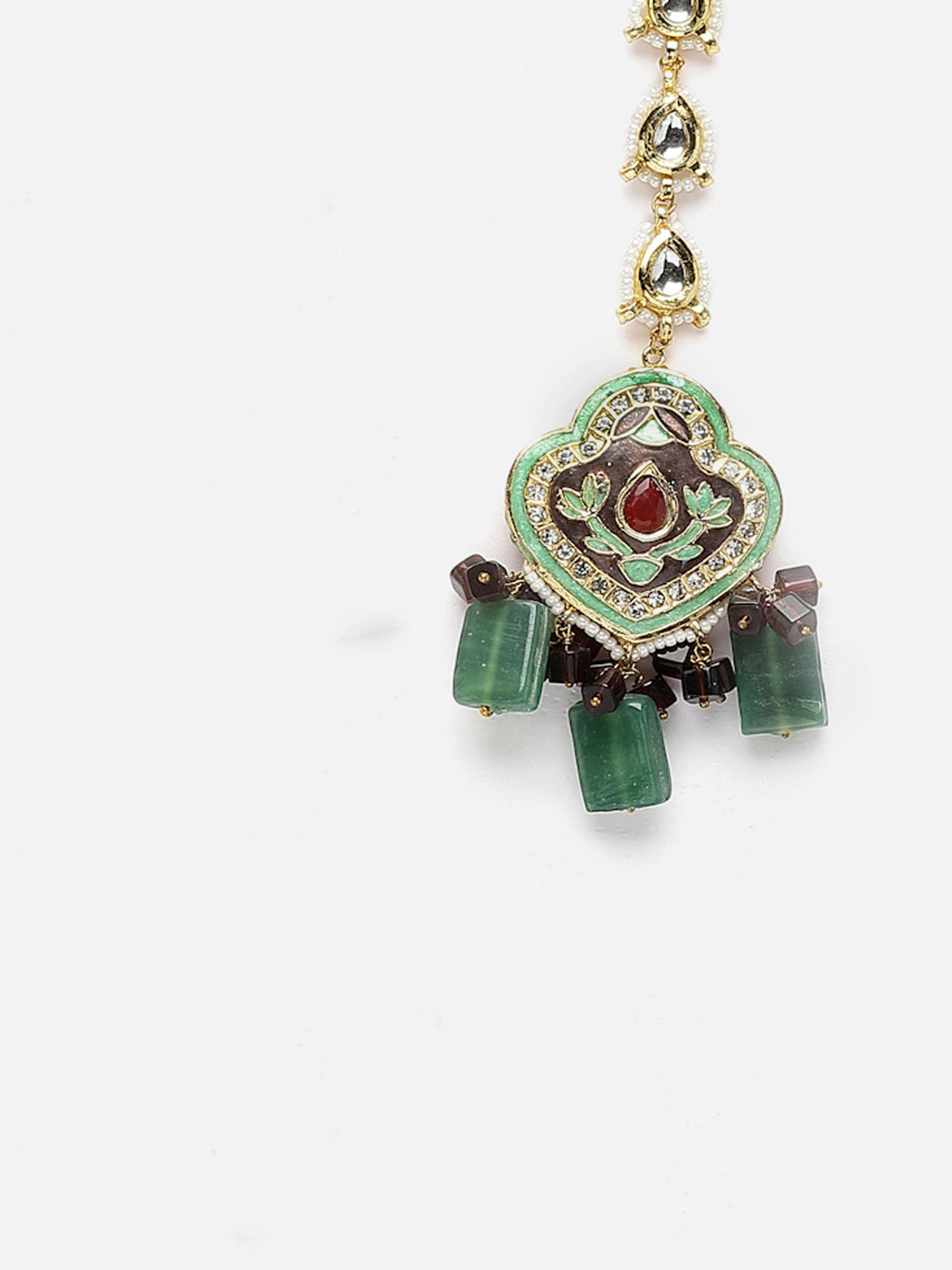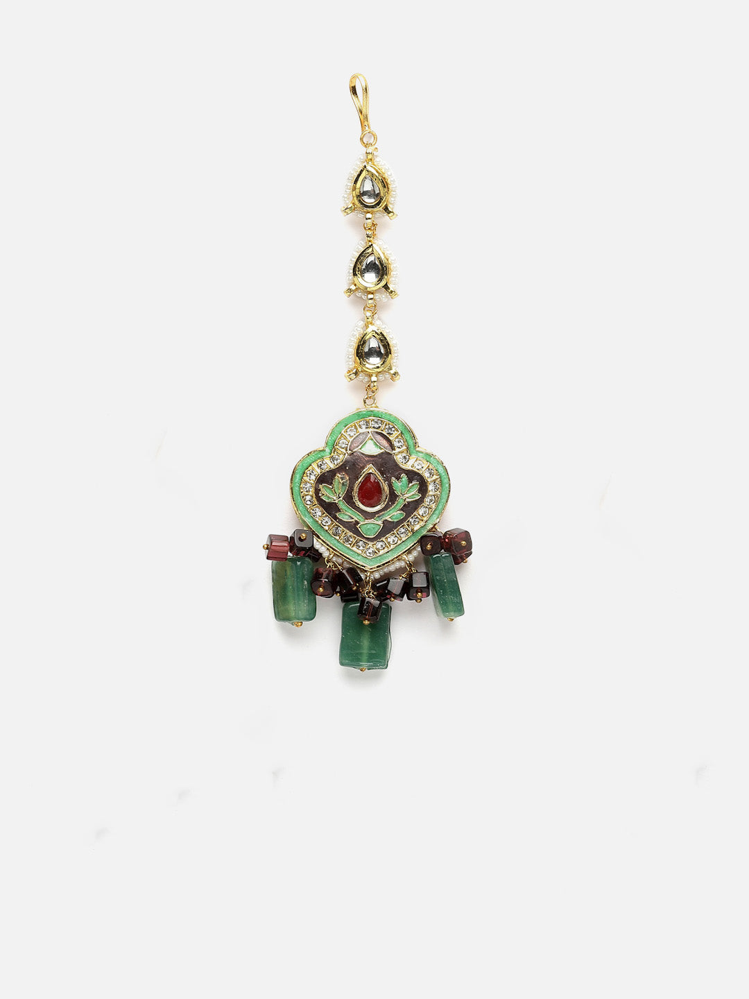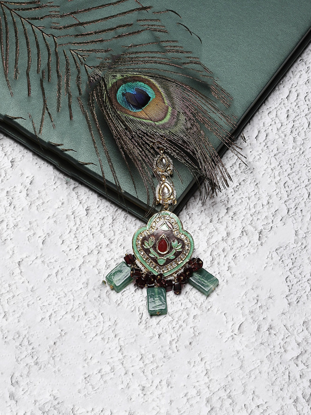 Peacock Meenakari And Purple Tinch Maang Tikka; Category Of Jewellery Is Hair Jewellery; Sub Category Is Maang Tikka; Ideal For Women; Color Is Blue, Grey, Maroon, Green, Purple, Cream, Gold, White; Gemstones Used - Kundan, American Diamonds, Pearls, Natural Stones ; Plating Is Gold-Plated; Base Metal Is Alloy; Other Material Used - Kanchain; Size Is Freesize; Adjustable - No; Weight Is 30 Gms; Mesaurements - Length Of Maang Tikka= 6 Cm; Width Of Maang Tikka =4 Cm; Length Of Kanchain =8 Cm; Width Of Kanchain = 1 Cm; Adjustable - No; Content 1 Maang Tikka