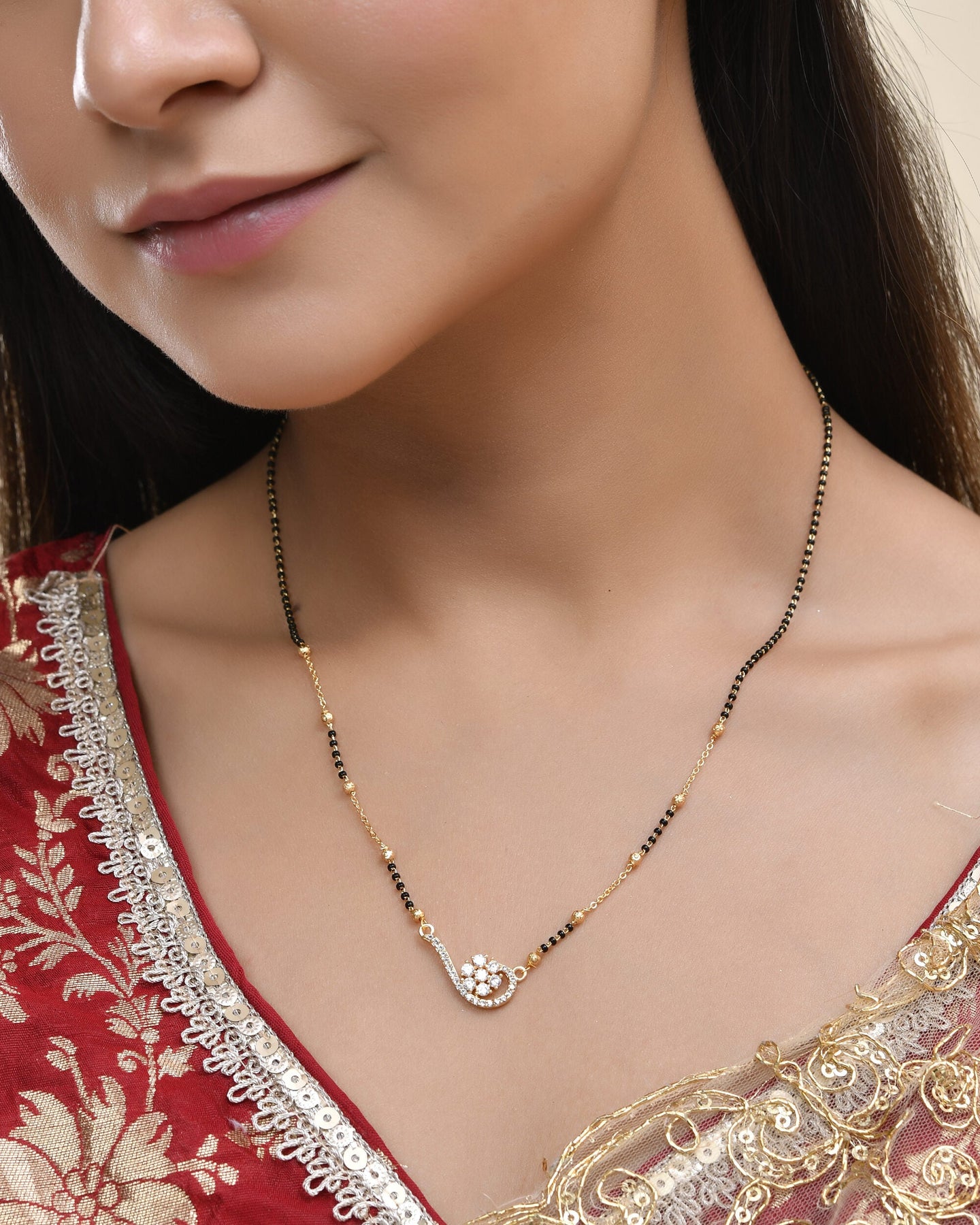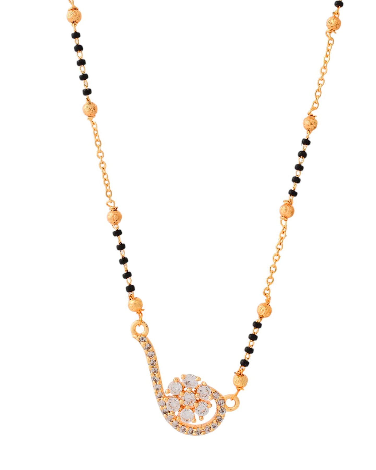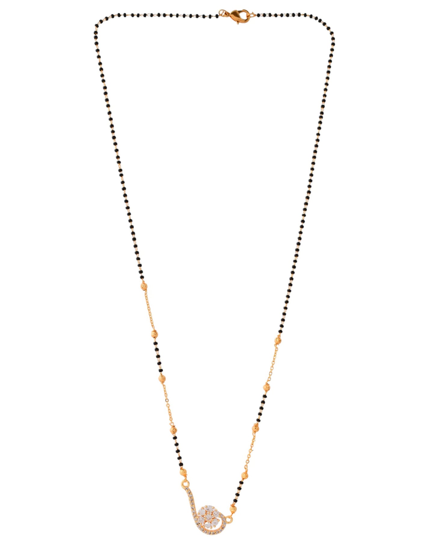 Celebrate Love And Style With This Sophisticated Gold-Plated Mangal Sutra! The Sleek Dual-Chain Design, Enhanced With Traditional Black Beads, Complements A Stunning Swirl-Shaped Pendant — Beautifully Encrusted With Dazzling White Stones.