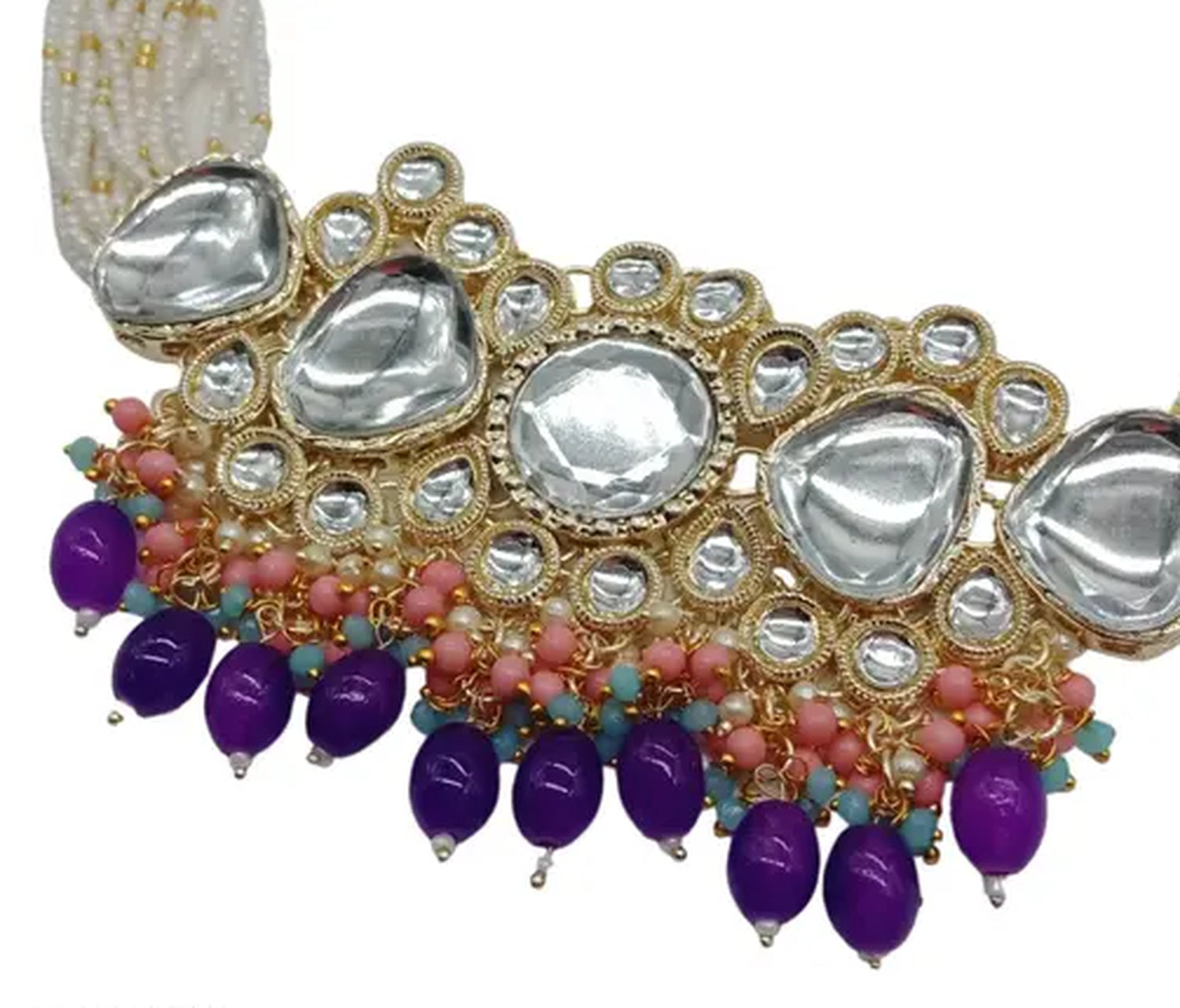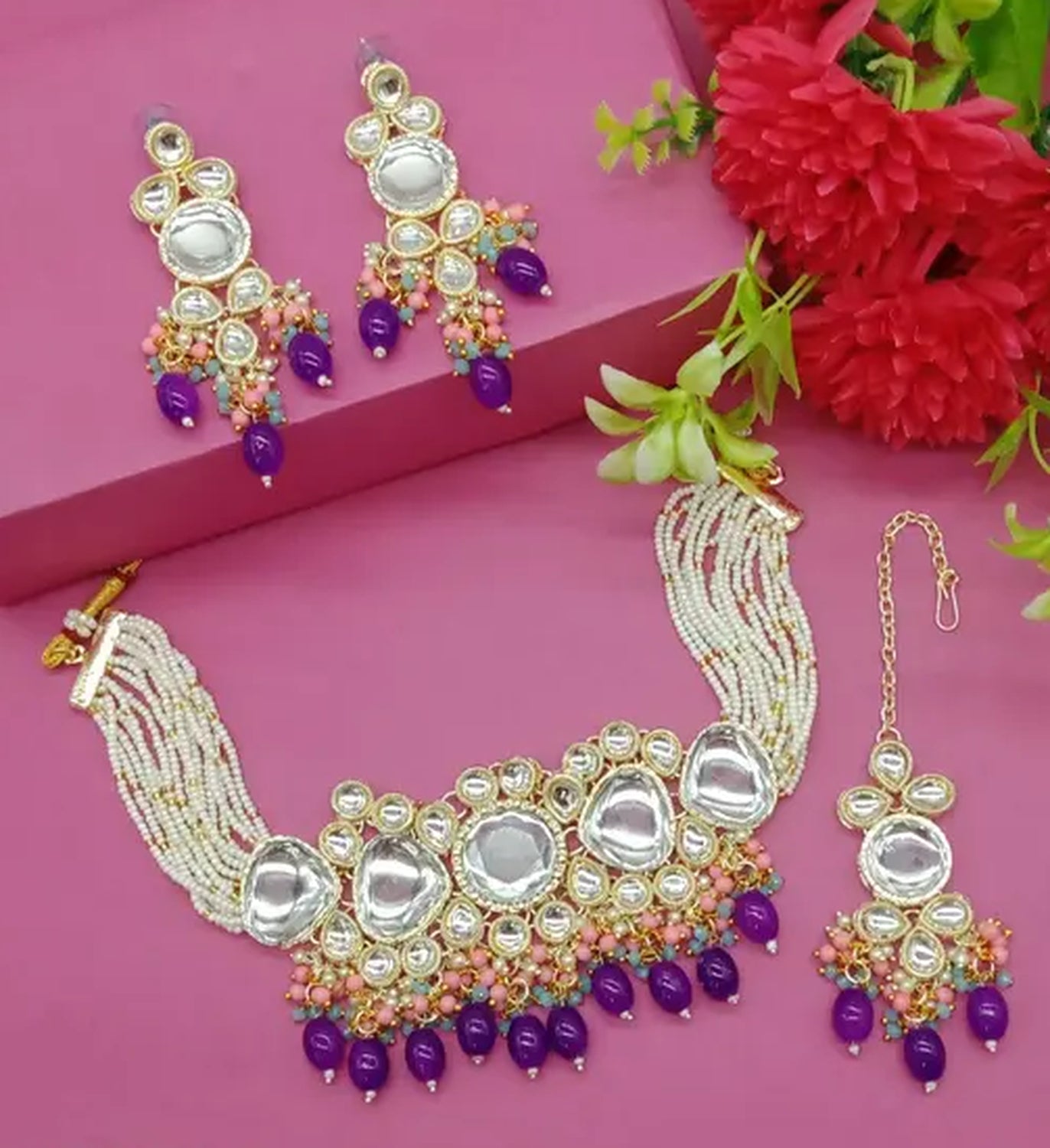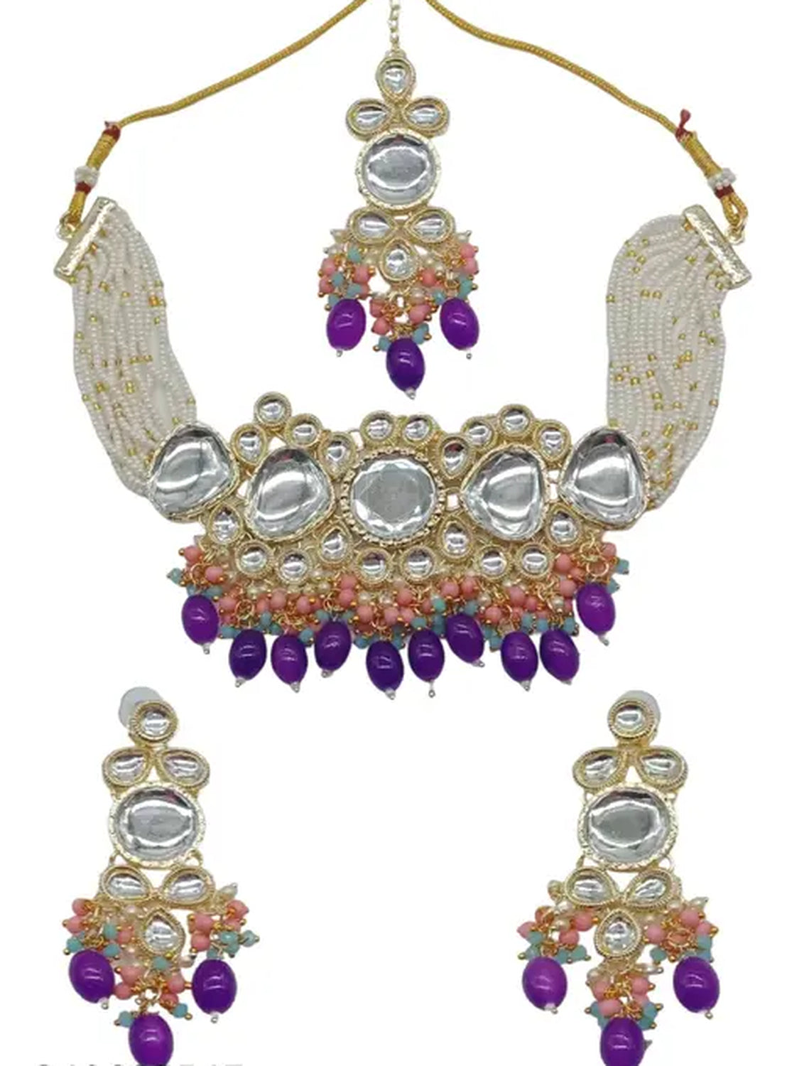 This Breathtaking Handcrafted Jewelry Set Combines Timeless Elegance With Traditional Artistry, Featuring A Stunning Kundan Choker Necklace Complemented By Matching Earrings And A Beautiful Maang Tikka (Forehead Ornament). The Exquisite Piece Showcases Premium Polki-Style Kundan Stones Set In A Gold-Plated Frame, Enhanced By Delicate Pearl Strands And Eye-Catching Purple Stone Drops.