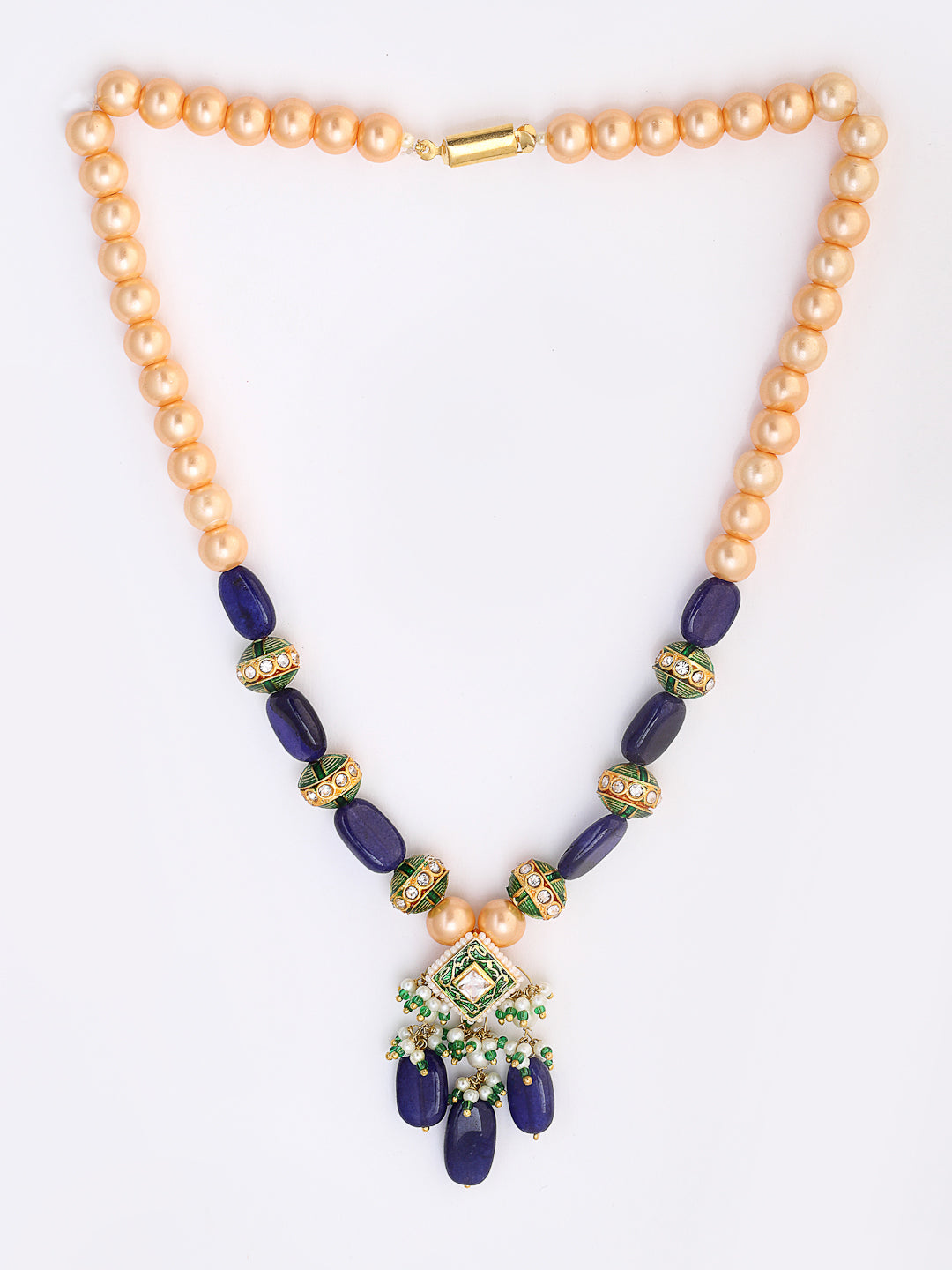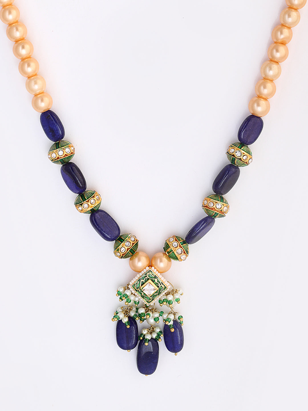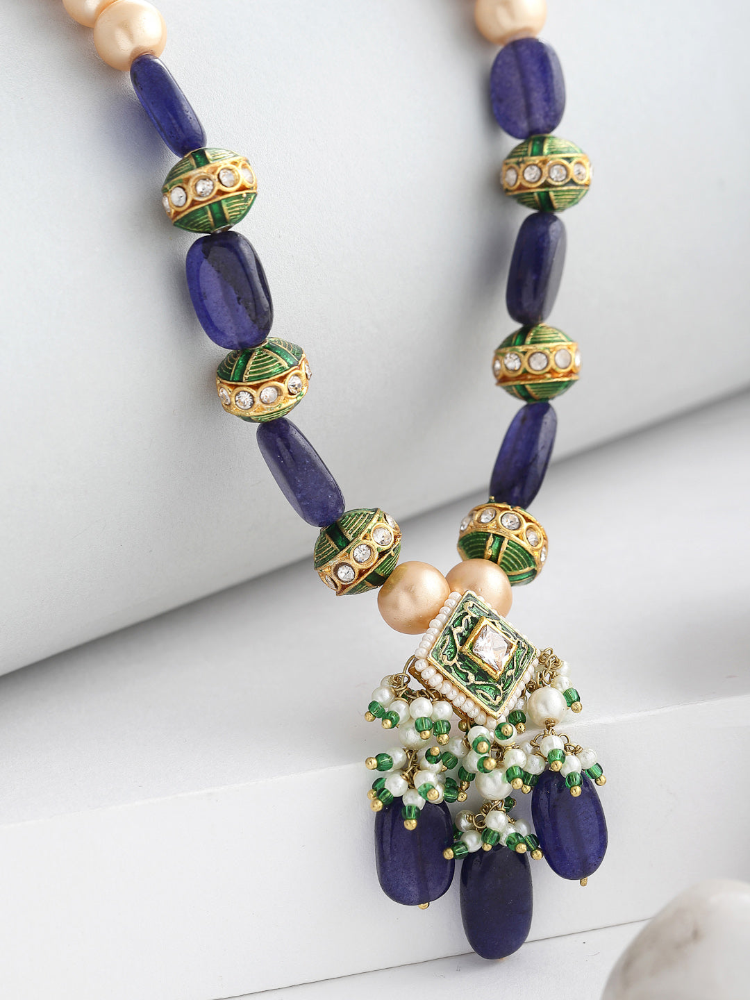 A String Of Pearl And Handmade Kundan Highlighted With Amythest Semi Precious Stone Style This With Simple Kurta To Work Or Any Party Where You Want Your Presence To Talk More Than You Do.; Category Of Jewellery Is Necklace; Sub Category Is Haar; Ideal For Women; Color Is Blue, Green, White, Gold; Gemstones Used - Kundan, Pearls, Natural Stones, American Diamond, Faux Blue Sapphire; Plating Is Gold-Plated; Base Metal Is Alloy; Other Material Used - None; Size Is Freesize; Adjustable - No; Weight Is 50 Gms; Mesaurements - Length Of Necklace =46 Cm; Width Of Necklace = 1.5 Cm; Adjustable - Yes; Content 1 Necklace