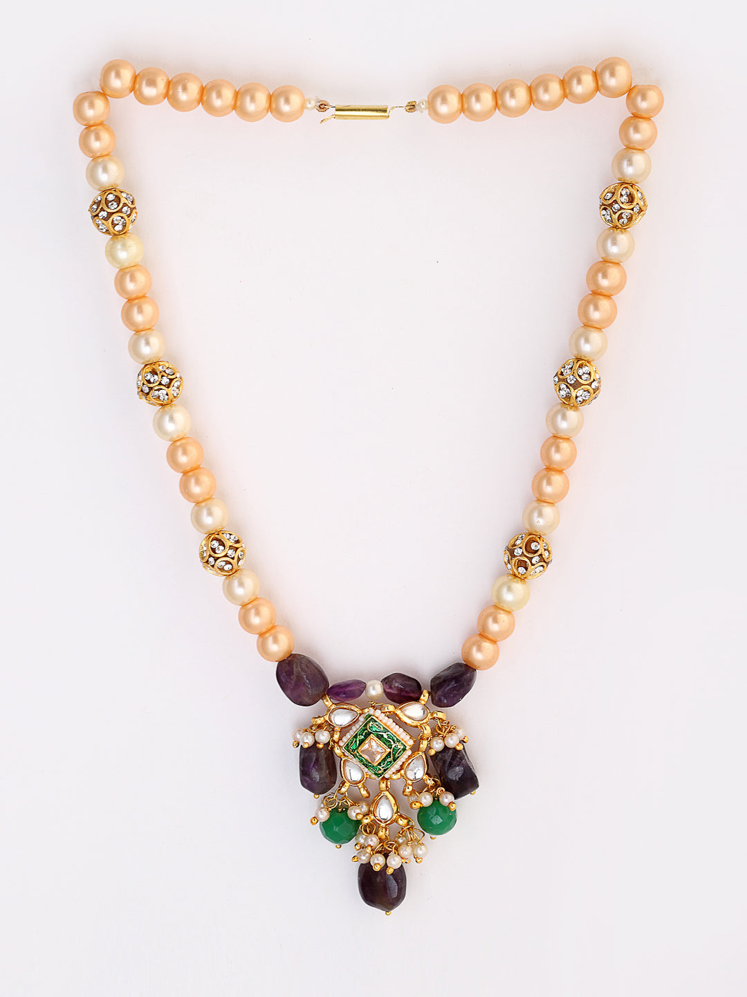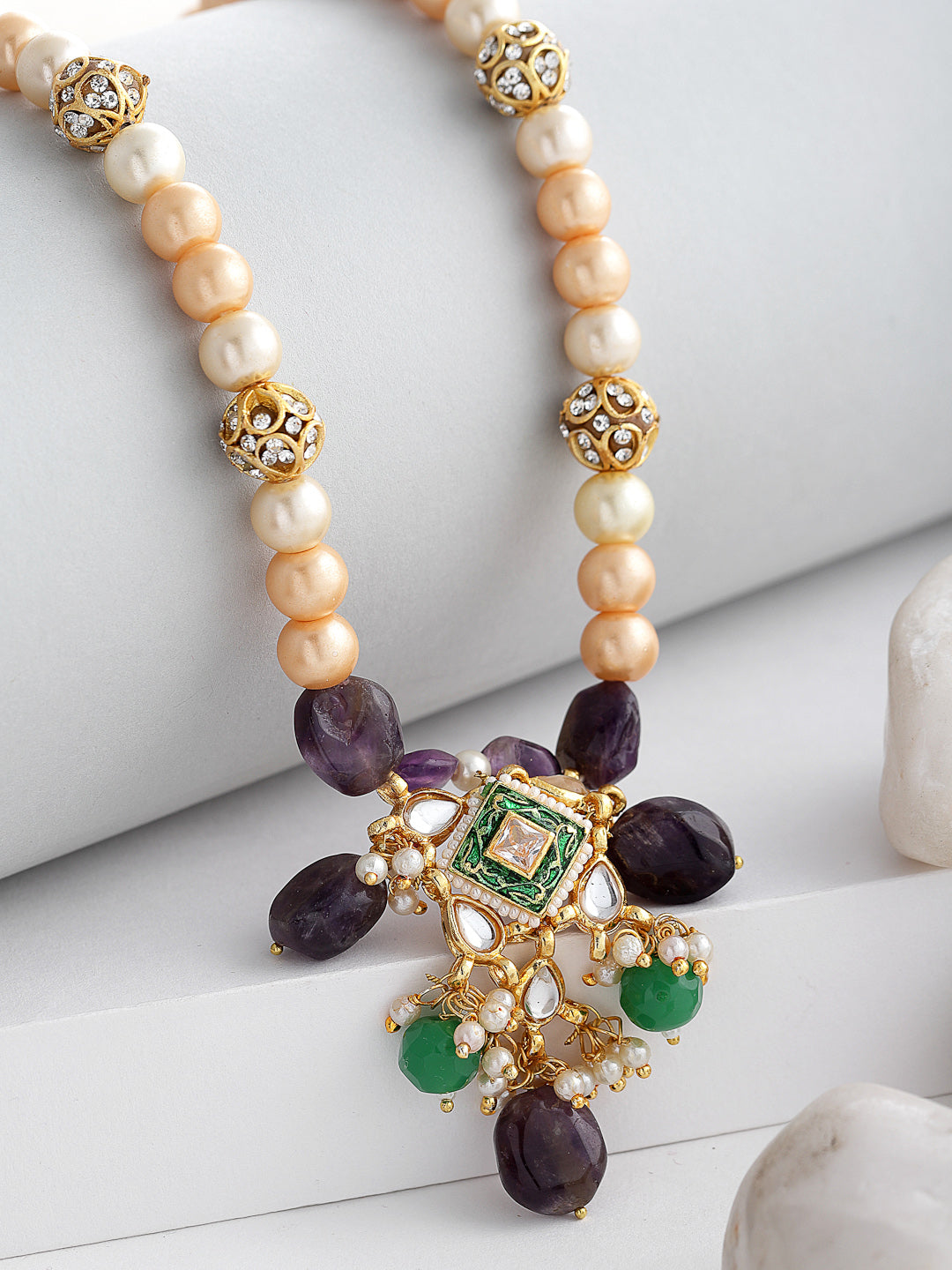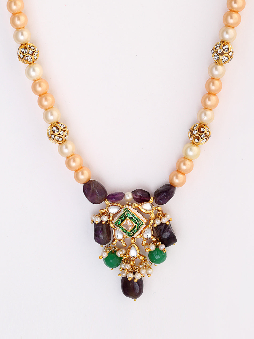 A String Of Love And Affection To Highlight Any Of Your Outfit With Multicolor Stones Semi Precious Can Be Styled With Any Outfit That Has Broad Neckline.; Category Of Jewellery Is Necklace; Sub Category Is Haar; Ideal For Women; Color Is Purple, Green, White, Gold; Gemstones Used - Kundan, Pearls, Natural Stones, American Diamond; Plating Is Gold-Plated; Base Metal Is Alloy; Other Material Used - None; Size Is Freesize; Adjustable - No; Weight Is 56 Gms; Mesaurements - Length Of Necklace =46 Cm; Width Of Necklace = 1.5 Cm; Adjustable - Yes; Content 1 Necklace