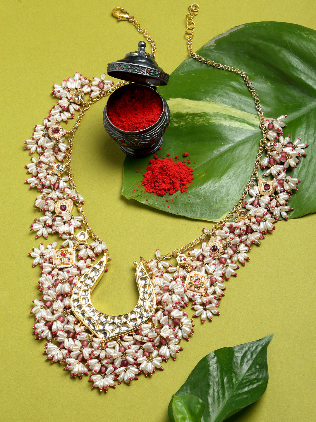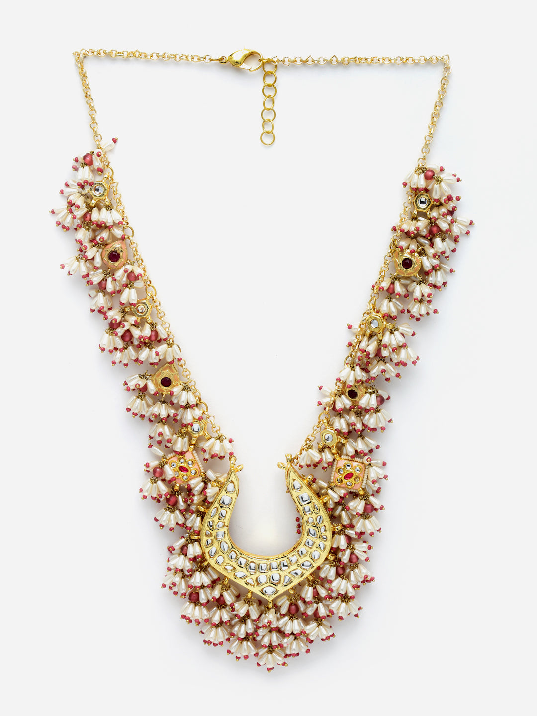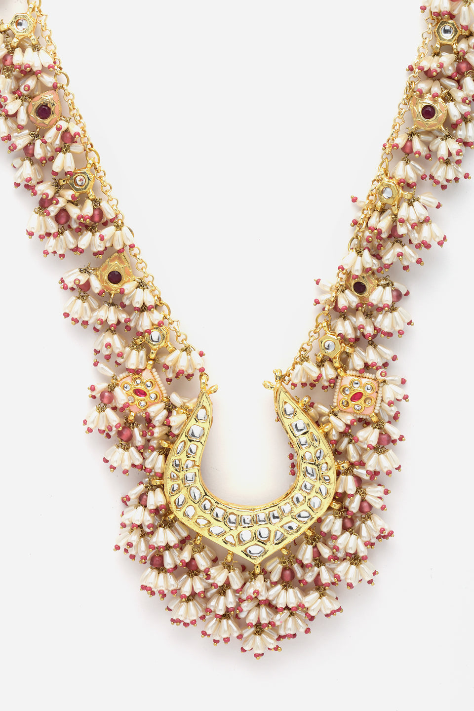 Hand Looped Pearl Drop With Pink Sapphire In Temple Neck Pc Is What Makes This Neck Pc Super Unique And Classy For All Times. Elegance Of Temple Jewellery And Tinch Of Peachy Effect Is What Makes This Neck Pc Super Elegant.; Category Of Jewellery Is Necklace; Sub Category Is Haar; Ideal For Women; Color Is Pink, Gold, White; Gemstones Used - Kundan, Pearls, Natural Stones; Plating Is Gold-Plated; Base Metal Is Alloy; Other Material Used - Adjustable Chain; Size Is Freesize; Adjustable - Yes; Weight Is 106 Gms; Mesaurements - Length Of Necklace =54 Cm; Width Of Necklace = 8 Cm; Adjustable - Yes; Content 1 Necklace