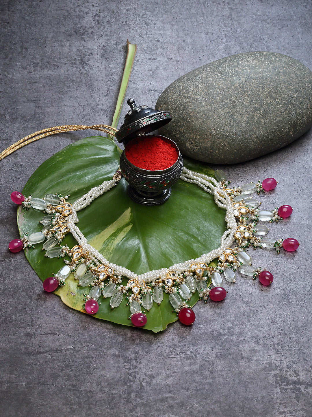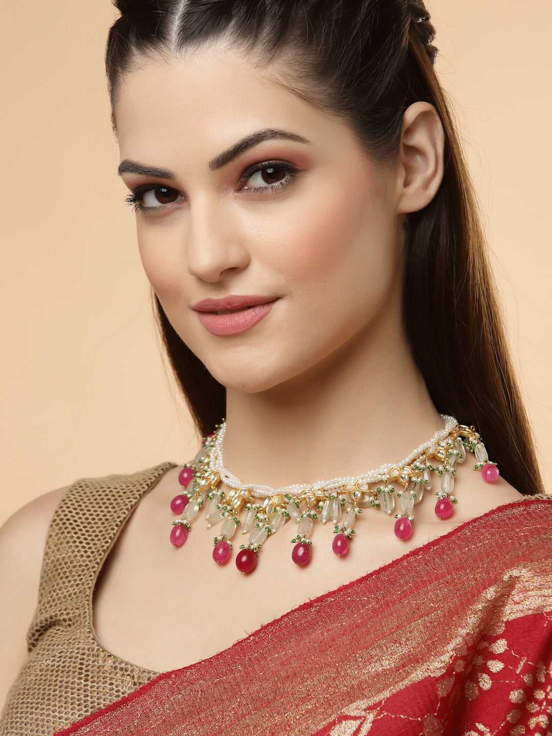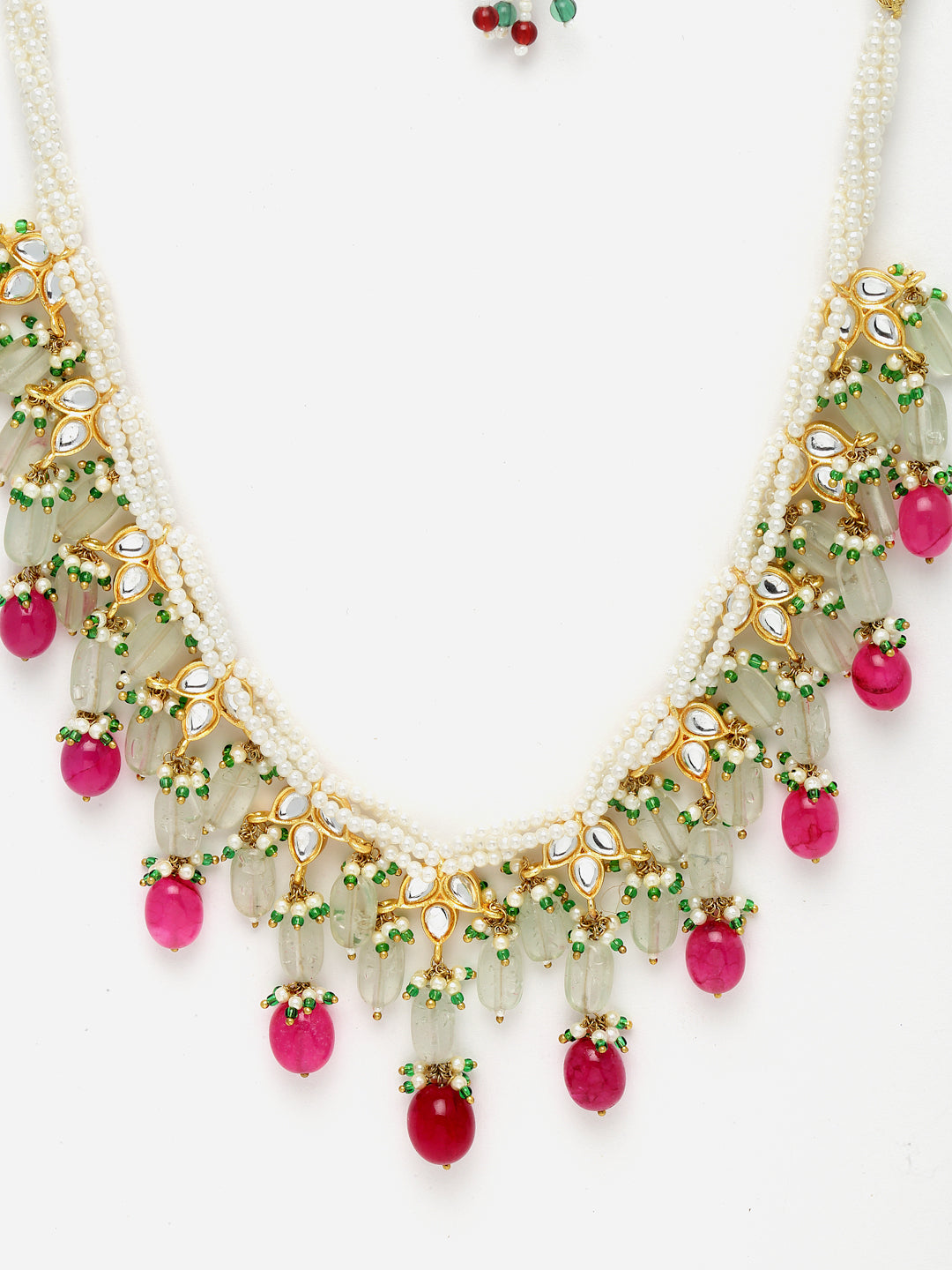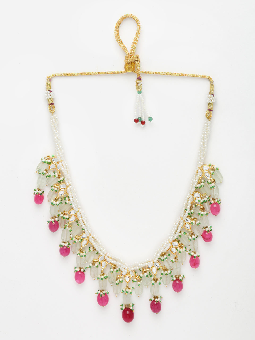 Handcarfted Neck Pc With Hndlooped Pearls With Tinch Of Green And Semi Precious Ruby Tassels Is What A Combination To Choose To Flaunt This Festive Season... Bling And Suttle Both In Same Pcs Makes It Unique Yet Stylish Neck Pc.; Category Of Jewellery Is Necklace; Sub Category Is Haar; Ideal For Women; Color Is Pink, Green, Gold, White; Gemstones Used - Kundan, Pearls, Natural Stones; Plating Is Gold-Plated; Base Metal Is Alloy; Other Material Used - Adjustable Dori; Size Is Freesize; Adjustable - Yes; Weight Is 63 Gms; Mesaurements - Length Of Necklace =42 Cm; Width Of Necklace = 1.7 Cm; Adjustable - Yes; Content 1 Necklace