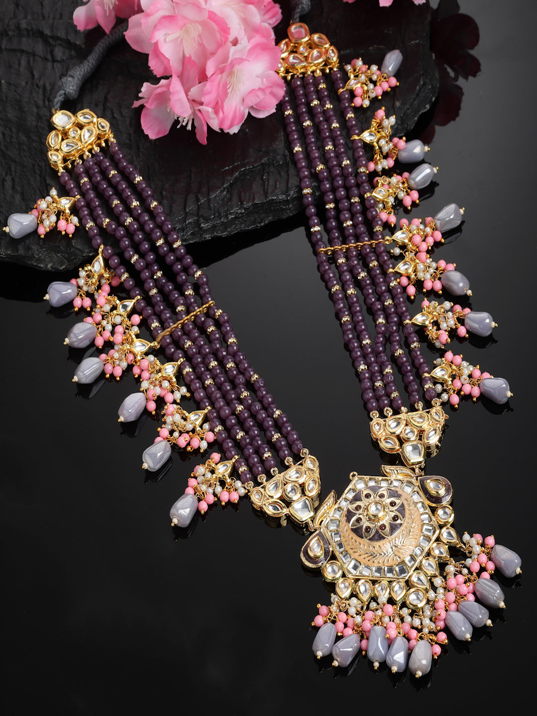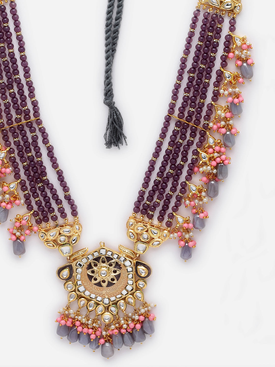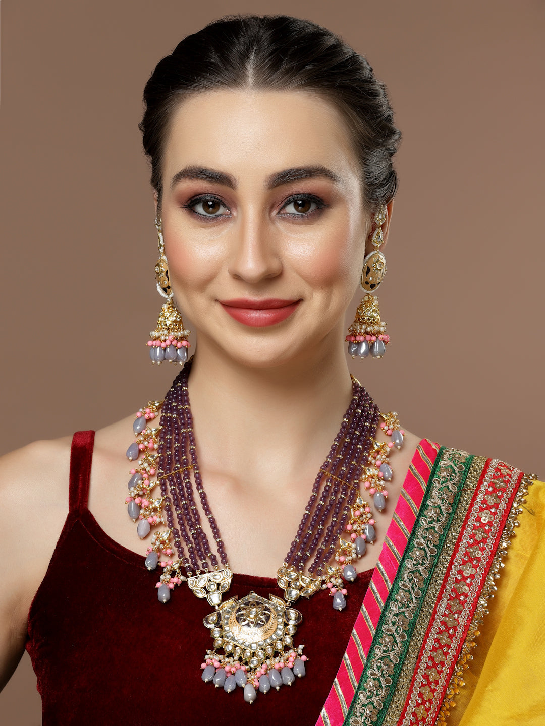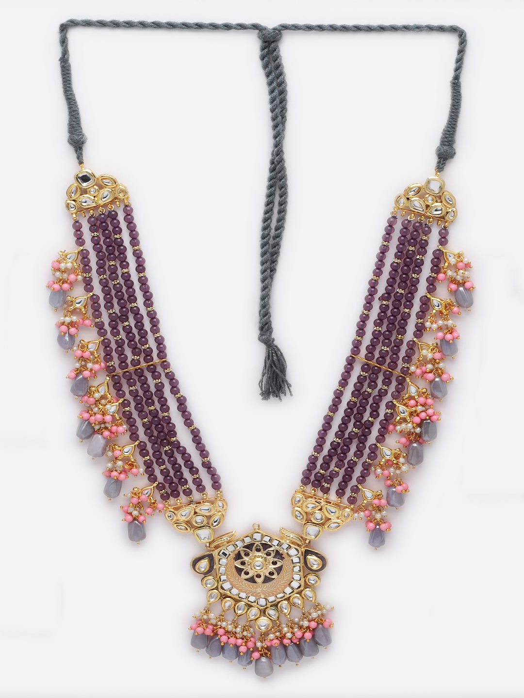 Meenakari Ivory An Kundan With Grey Latkan And Drop ; Category Of Jewellery Is Necklace; Sub Category Is Haar; Ideal For Women; Color Is Purple, Pink, Grey, Orange, Gold, White; Gemstones Used - Kundan, Pearls, Natural Stones; Plating Is Gold-Plated; Base Metal Is Alloy; Other Material Used - Adjustable Dori; Size Is Freesize; Adjustable - Yes; Weight Is 150 Gms; Mesaurements - Length Of Necklace =82 Cm; Width Of Necklace = 12.2 Cm; Adjustable - Yes; Content 1 Necklace