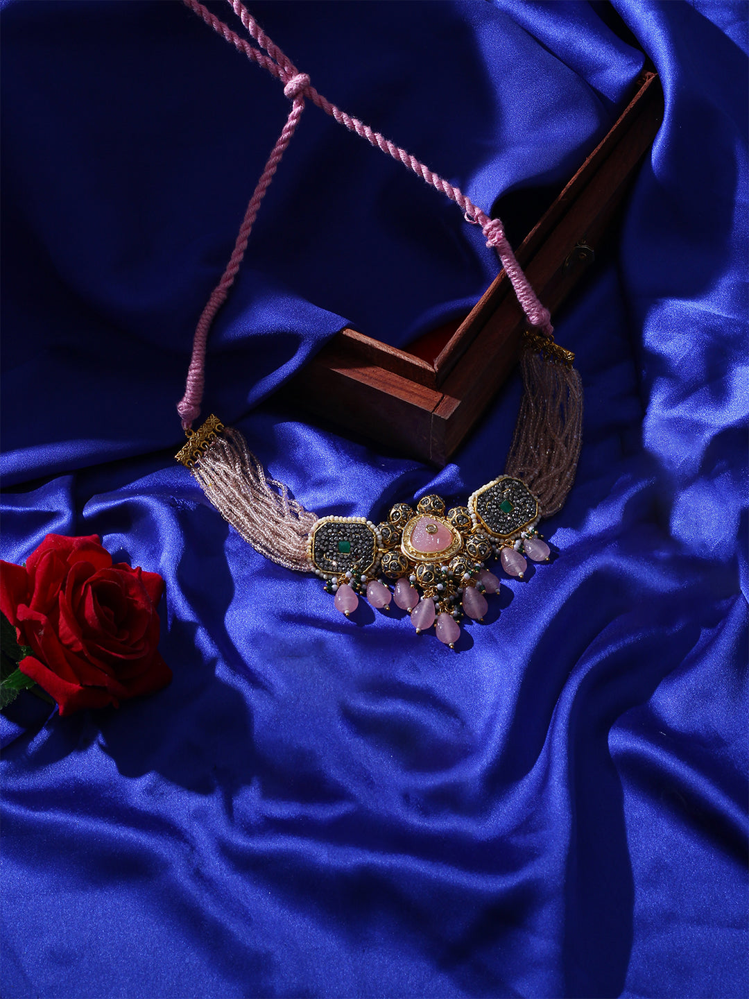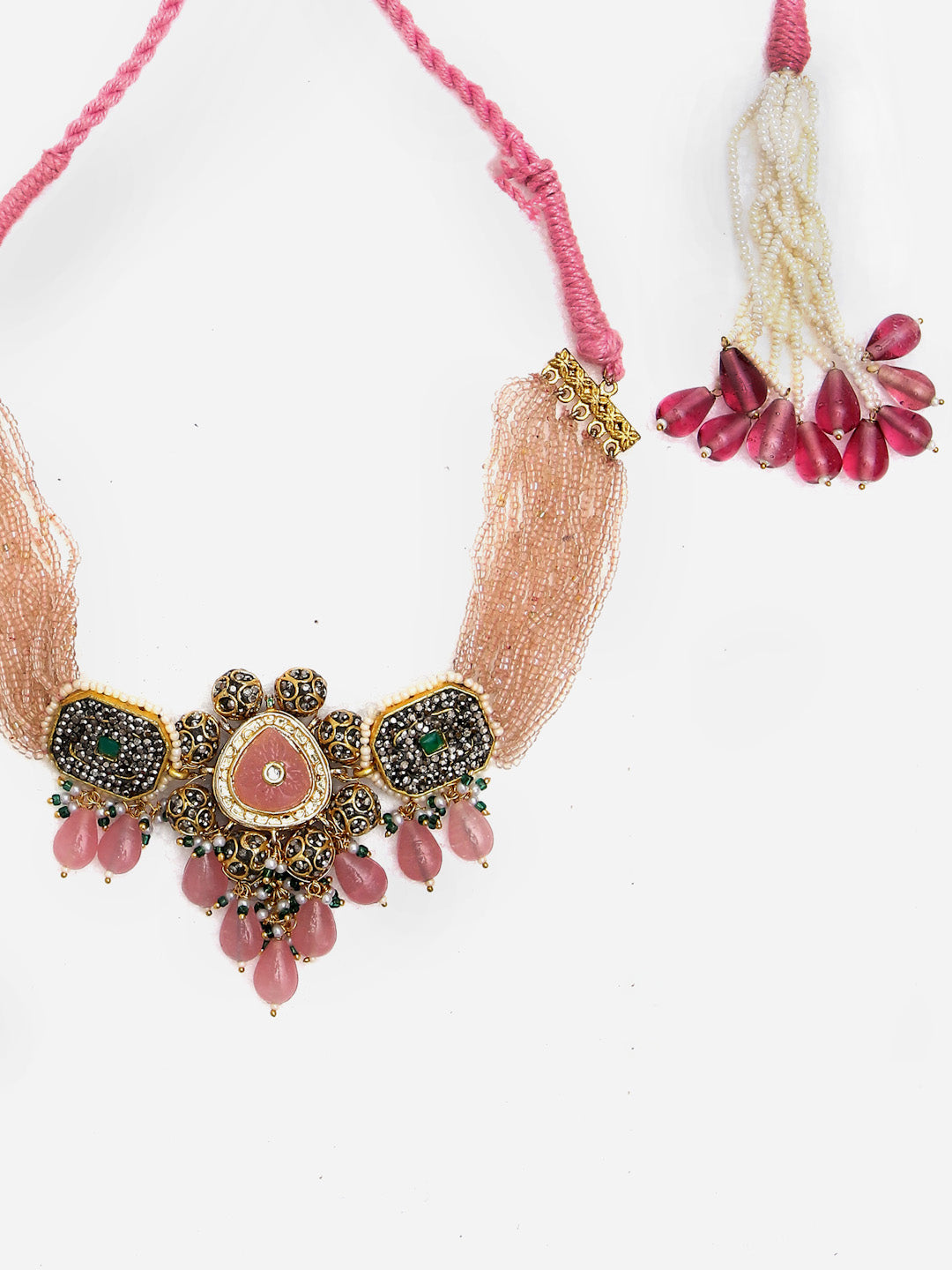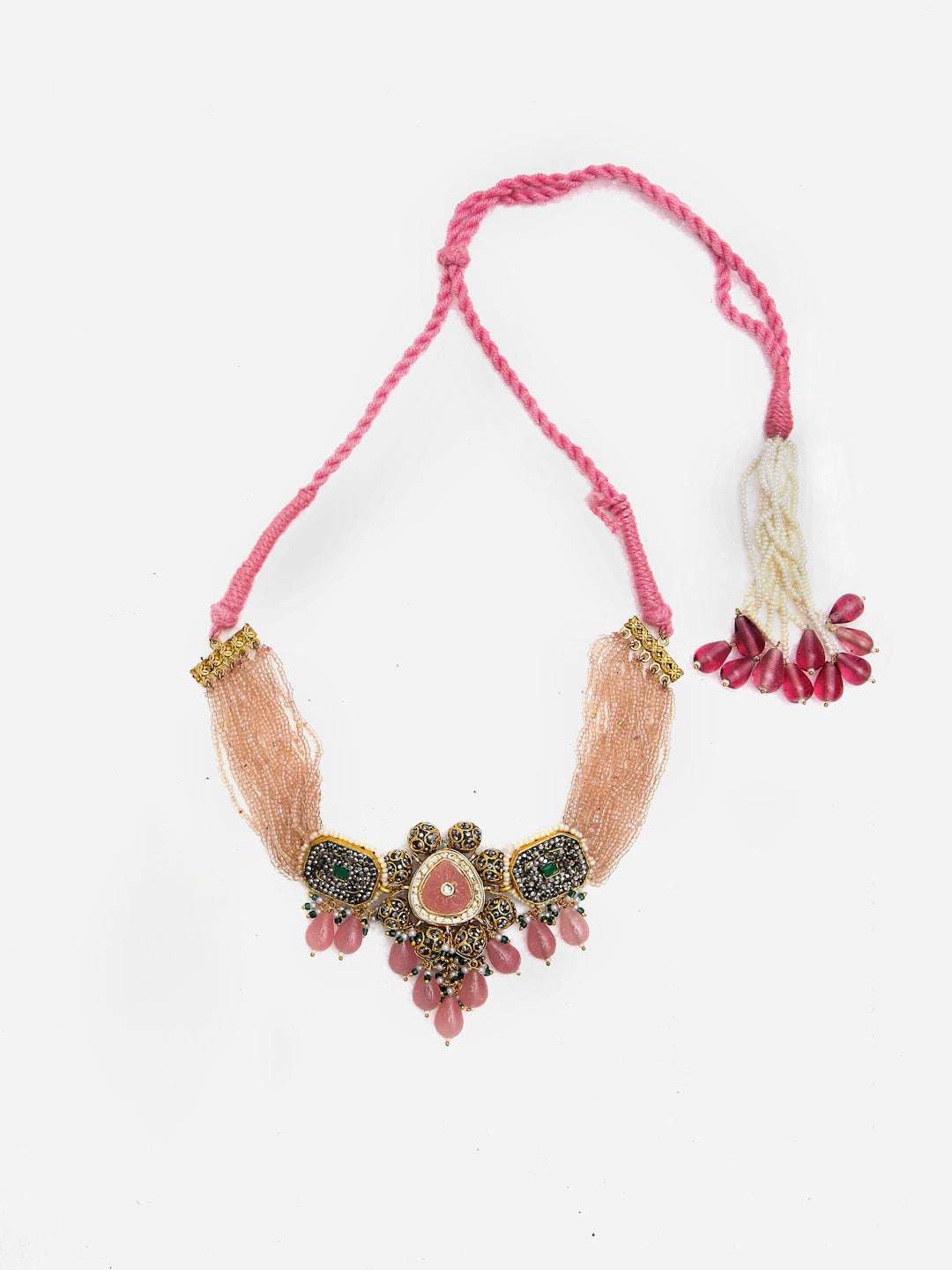 Chokar Styled Neck Pc Can Be Worn Both Ways In Trending Color And Style Of Real Jewellery Picked By Designer; Category Of Jewellery Is Necklace; Sub Category Is Haar; Ideal For Women; Color Is Pink, Black, Green, Peach, Orange, Gold, White; Gemstones Used - Kundan, American Diamonds, Pearls, Natural Stones; Plating Is Gold-Plated; Base Metal Is Alloy; Other Material Used - Adjustable Dori; Size Is Freesize; Adjustable - Yes ; Weight Is 86 Gms; Mesaurements - Length Of Necklace =49 Cm; Width Of Necklace = 6 Cm; Adjustable - Yes ; Content 1 Necklace