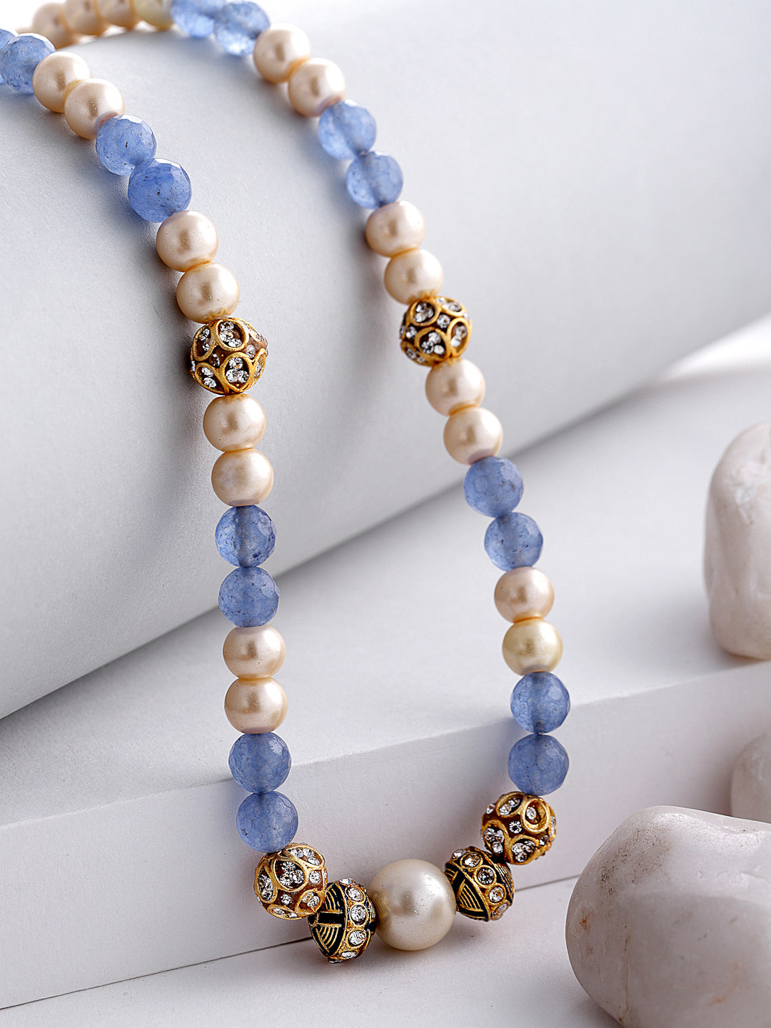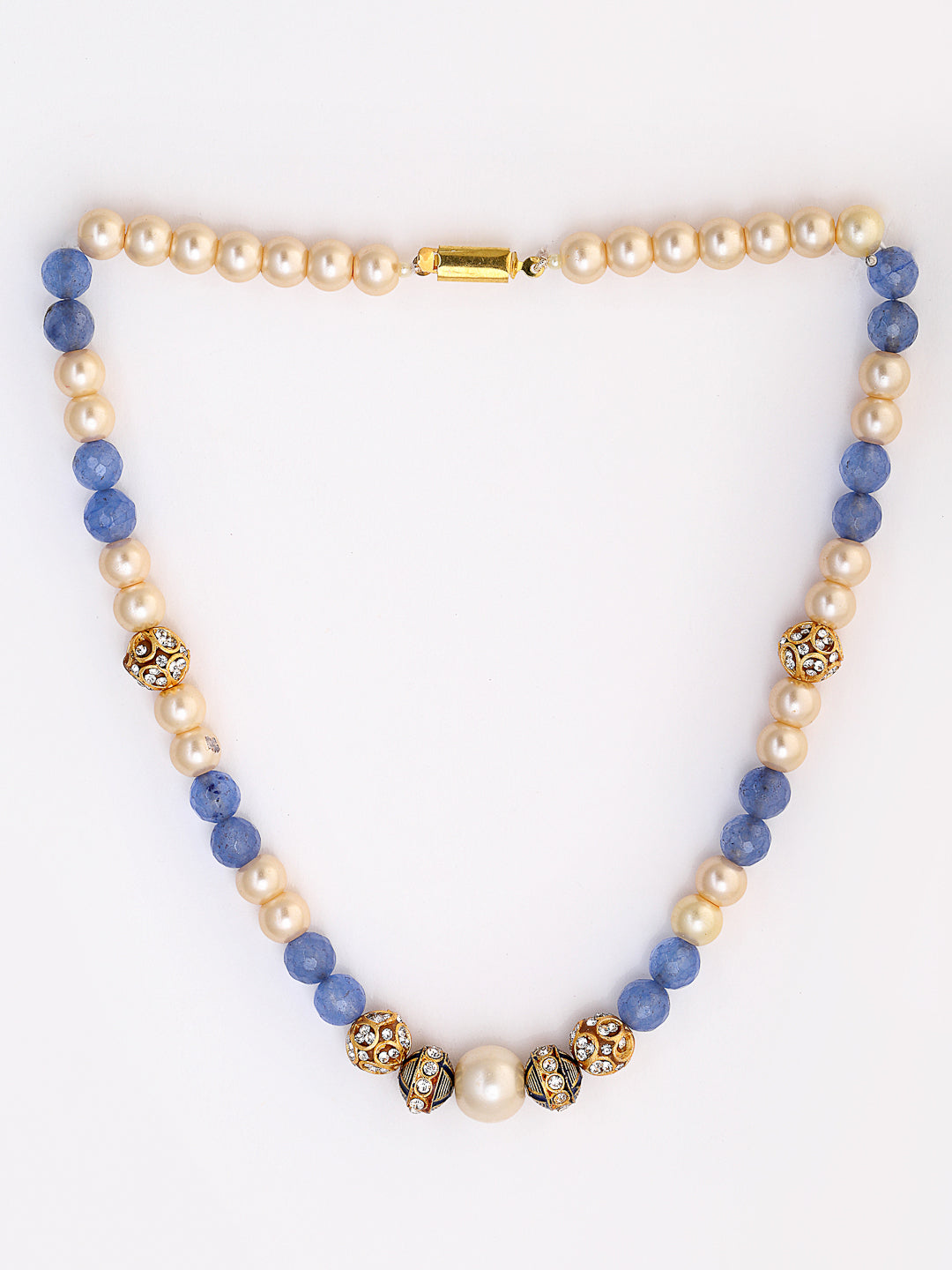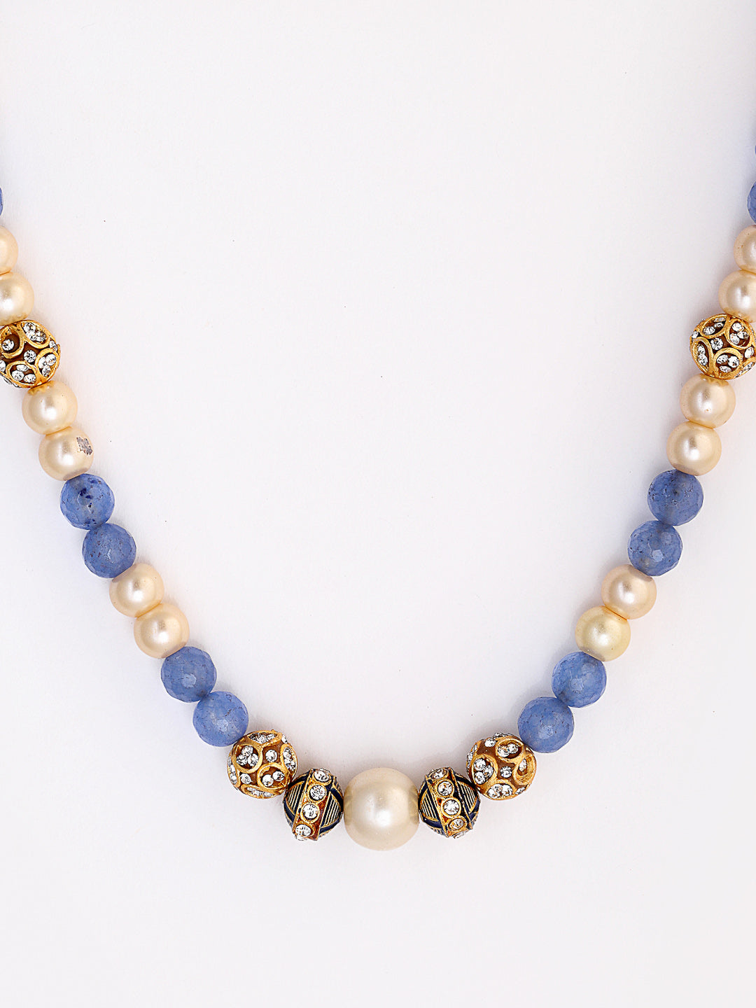 This Season, Style Your Self In Extra Special Smile And Style Of Yours With Our Handmade Necklace, Just To Make You Feel The Beauty Of Yours Inside Out.; Category Of Jewellery Is Necklace; Sub Category Is Layered; Ideal For Women; Color Is Blue, Black, White, Gold; Gemstones Used - Pearls, Natural Stones, American Diamond; Plating Is Gold-Plated; Base Metal Is Alloy; Other Material Used - None; Size Is Freesize; Adjustable - No; Weight Is 46 Gms; Mesaurements - Length Of Necklace =48 Cm; Width Of Necklace = 1.5 Cm; Adjustable - Yes; Content 1 Necklace