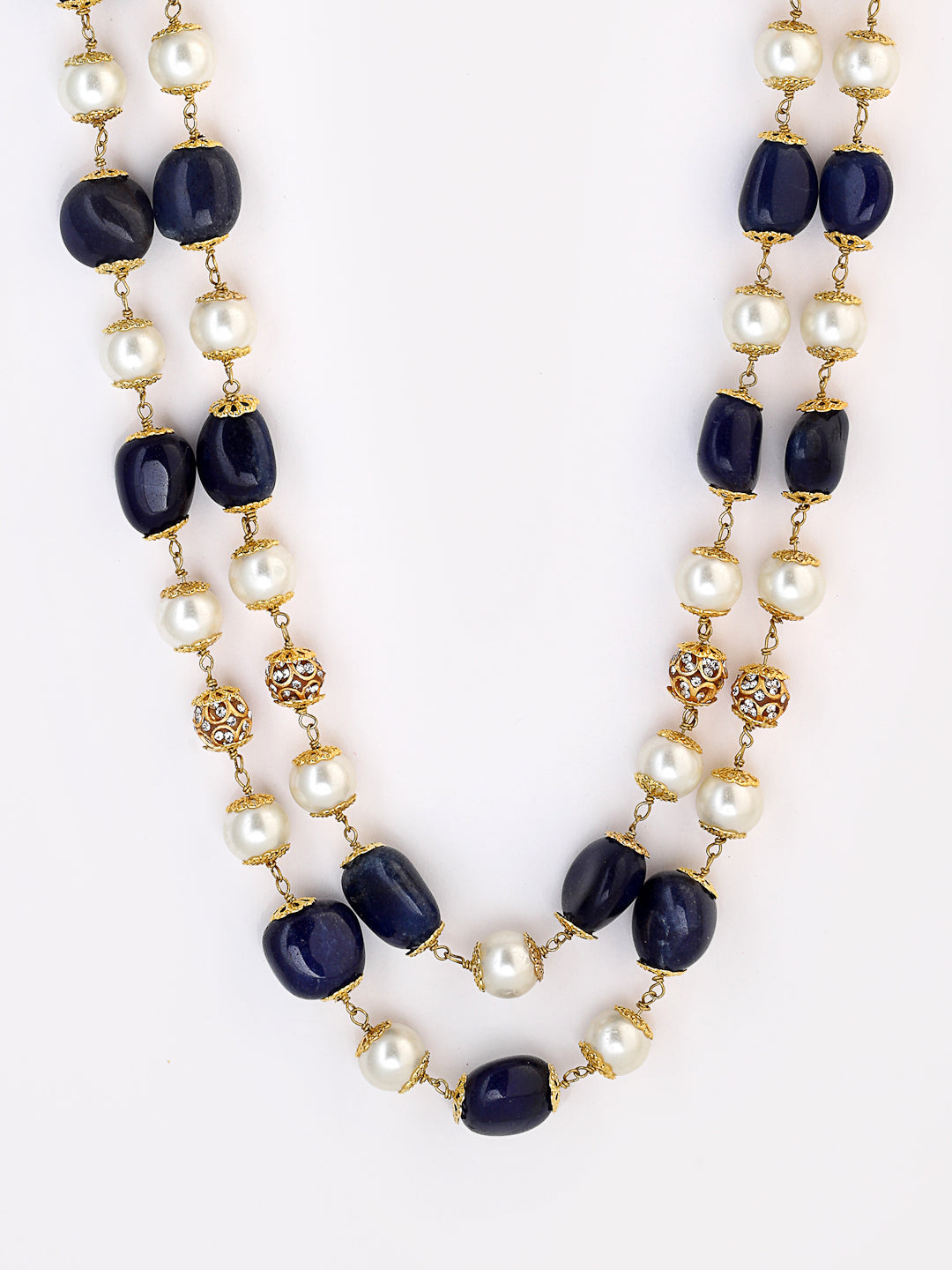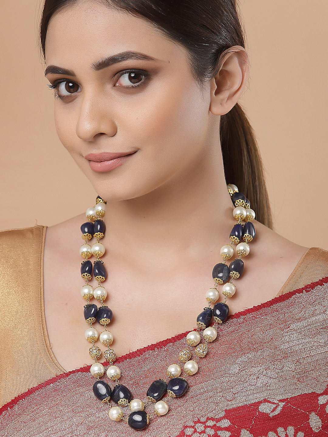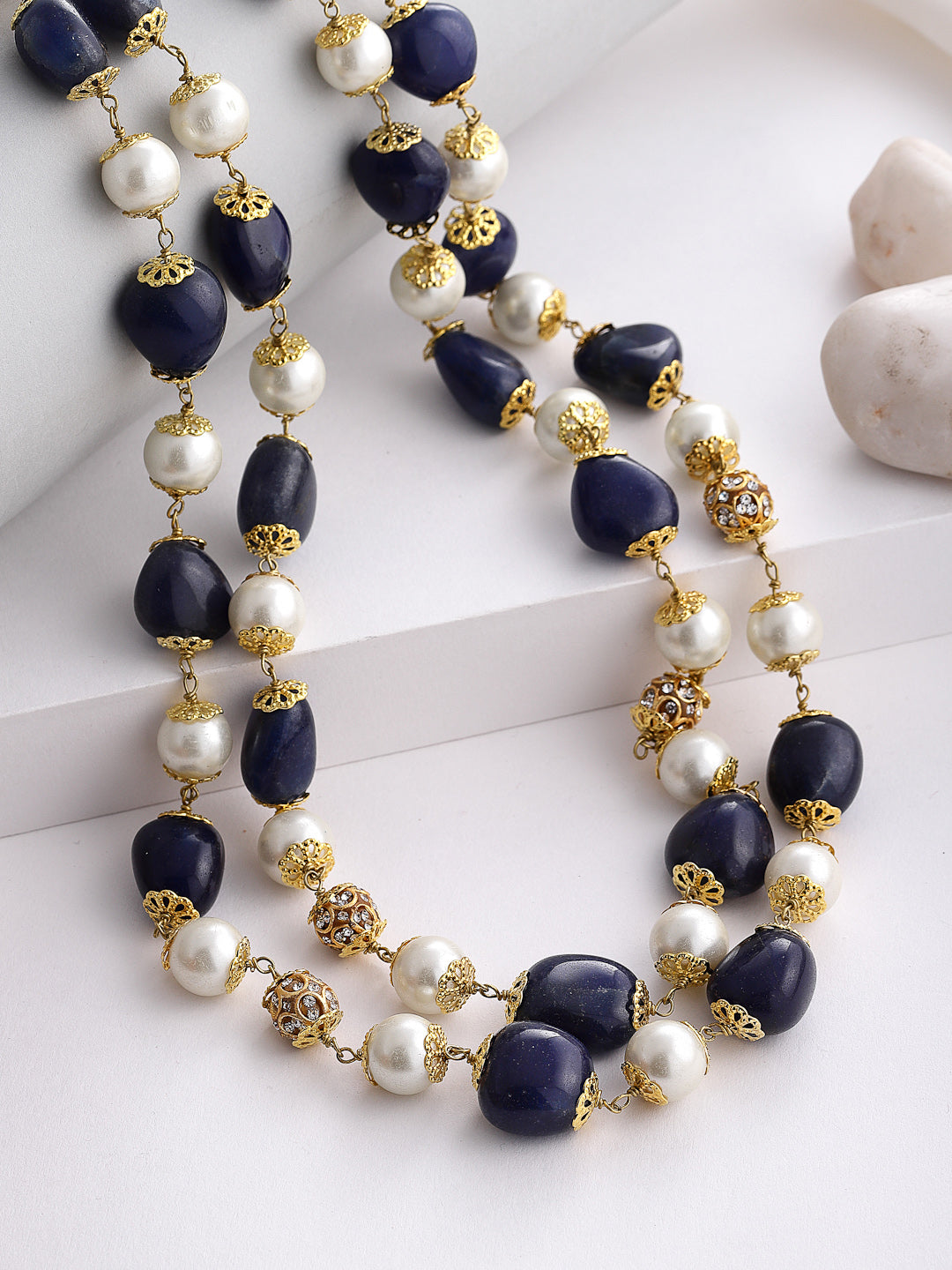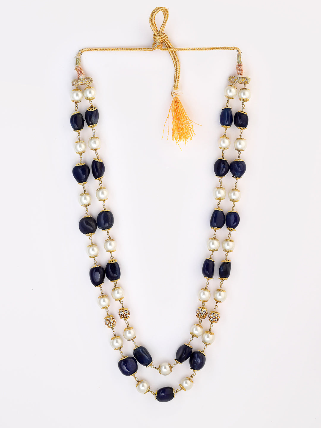 Festivity Is In The Corner, All You Need Is Our Handmade Jewellery Pc To Uplift Any Of Your Occasion Along With Your Smile.; Category Of Jewellery Is Necklace; Sub Category Is Layered; Ideal For Women; Color Is Blue, White, Gold; Gemstones Used - Pearls, Natural Stones, Faux Blue Sapphire; Plating Is Gold-Plated; Base Metal Is Alloy; Other Material Used - Adjustable Dori; Size Is Freesize; Adjustable - Yes; Weight Is 174 Gms; Mesaurements - Length Of Necklace =72 Cm; Width Of Necklace = 3.6 Cm; Adjustable - No; Content 1 Necklace