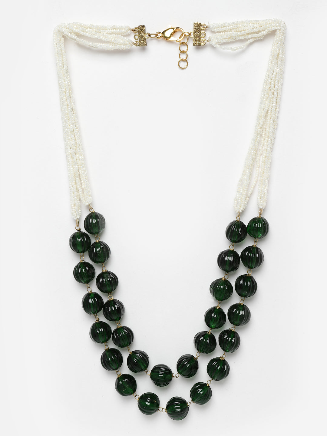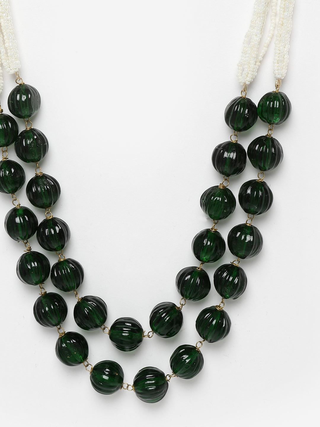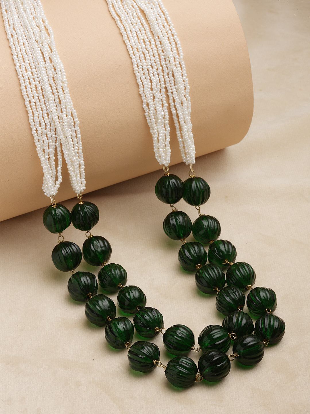 String Of Emerlad And Pearl With Effect Of Super Classy And Good For Upcoming Season Of Love And Care.; Category Of Jewellery Is Necklace; Sub Category Is Layered; Ideal For Women; Color Is Green, Gold, Cream; Gemstones Used - Pearls, Natural Stones, Faux Emerald; Plating Is Gold-Plated; Base Metal Is Alloy; Other Material Used - Adjustable Chain; Size Is Freesize; Adjustable - Yes; Weight Is 126 Gms; Mesaurements - Length Of Necklace =65 Cm; Width Of Necklace = 5.1 Cm; Adjustable - Yes; Content 1 Necklace