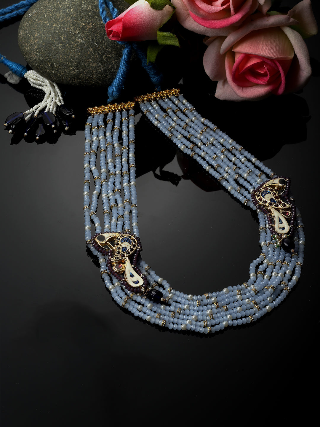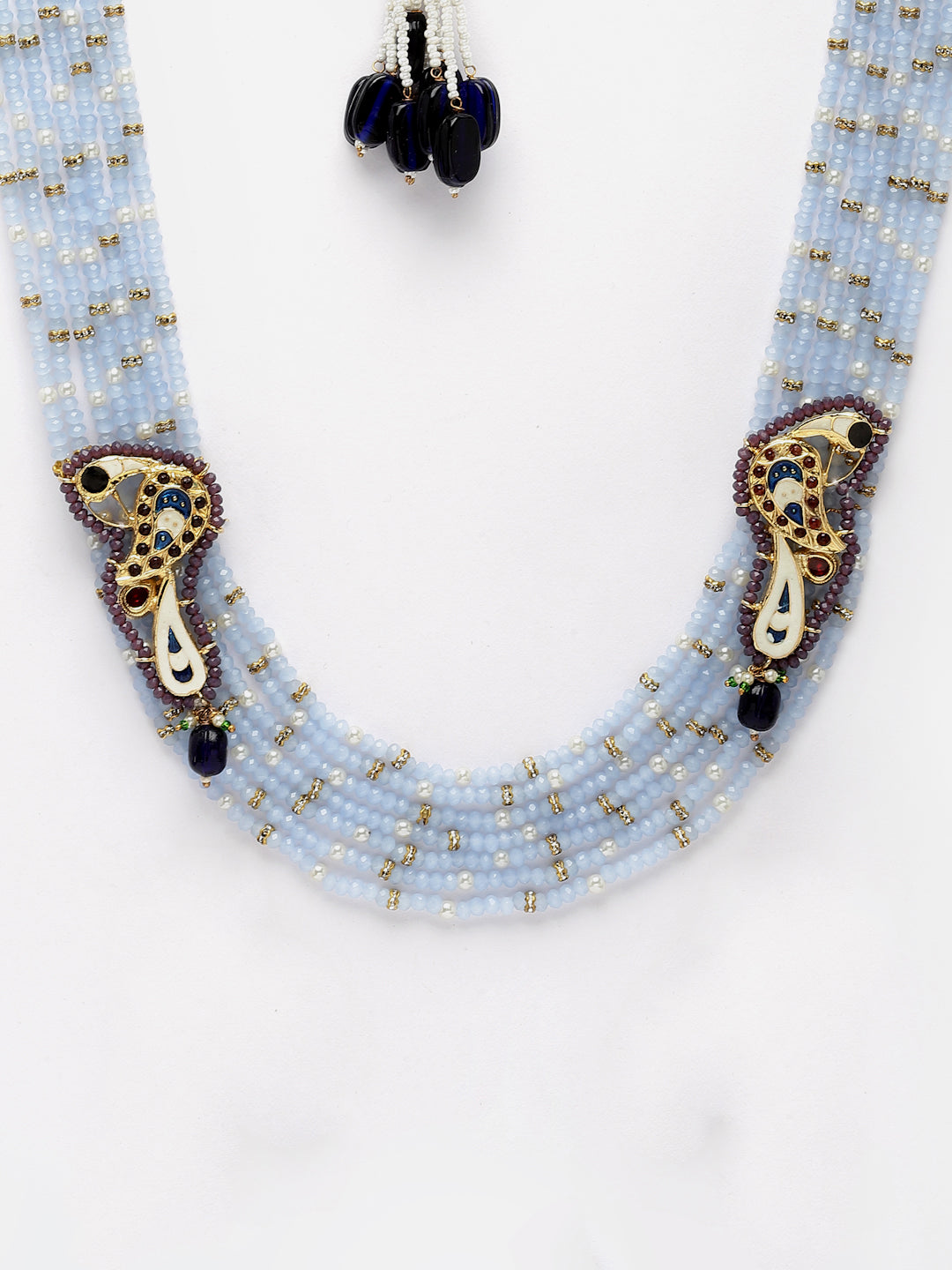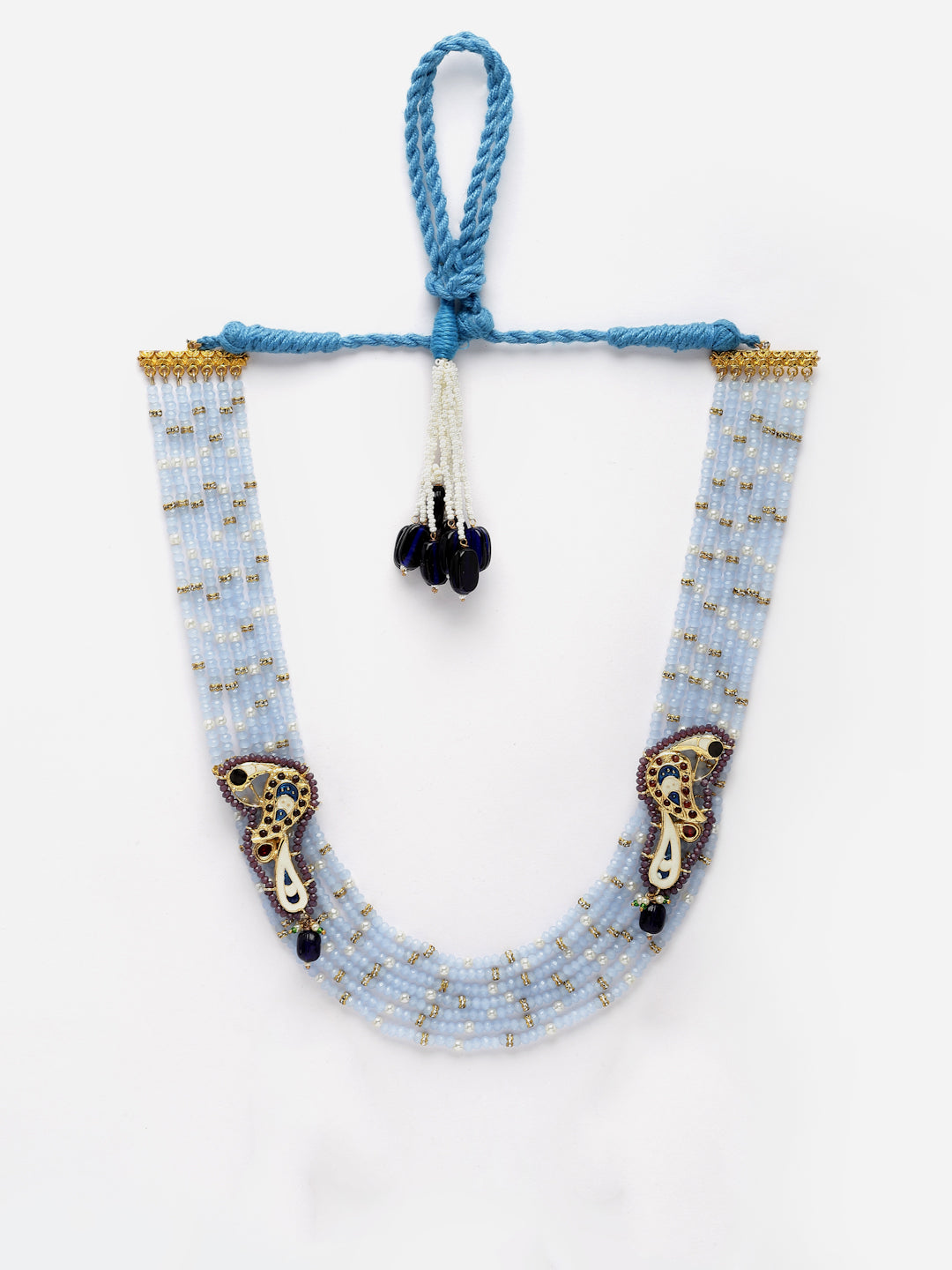 Layers Of Blue Stone And Peacock Meenakari Handcrafted Pc; Category Of Jewellery Is Necklace; Sub Category Is Layered; Ideal For Women; Color Is Blue, Maroon, Gold, White, Cream; Gemstones Used - Kundan, Pearls, Natural Stones; Plating Is Gold-Plated; Base Metal Is Alloy; Other Material Used - Adjustable Dori; Size Is Freesize; Adjustable - Yes; Weight Is 90 Gms; Mesaurements - Length Of Necklace =52 Cm; Width Of Necklace = 4 Cm; Adjustable - Yes; Content 1 Necklace