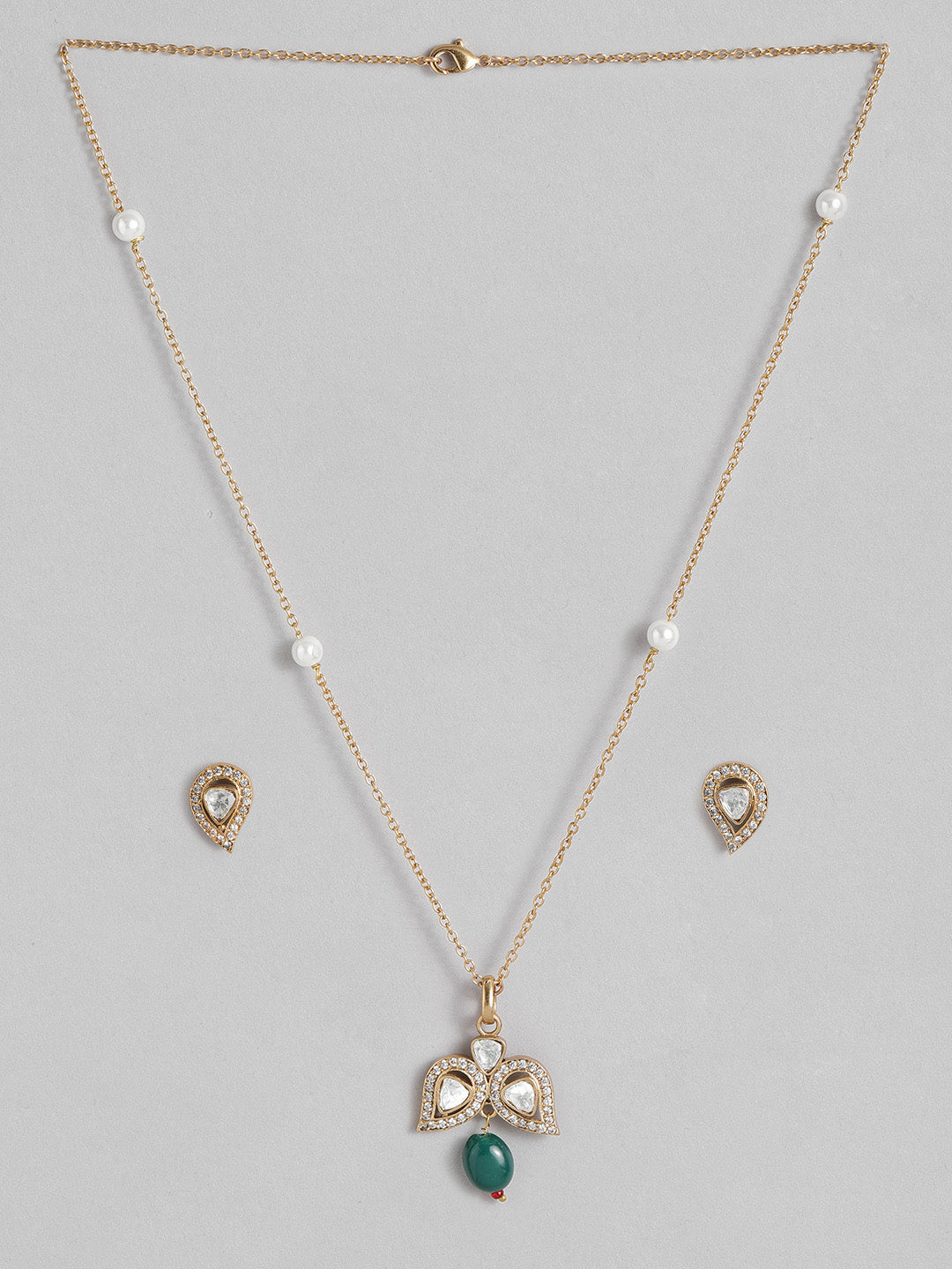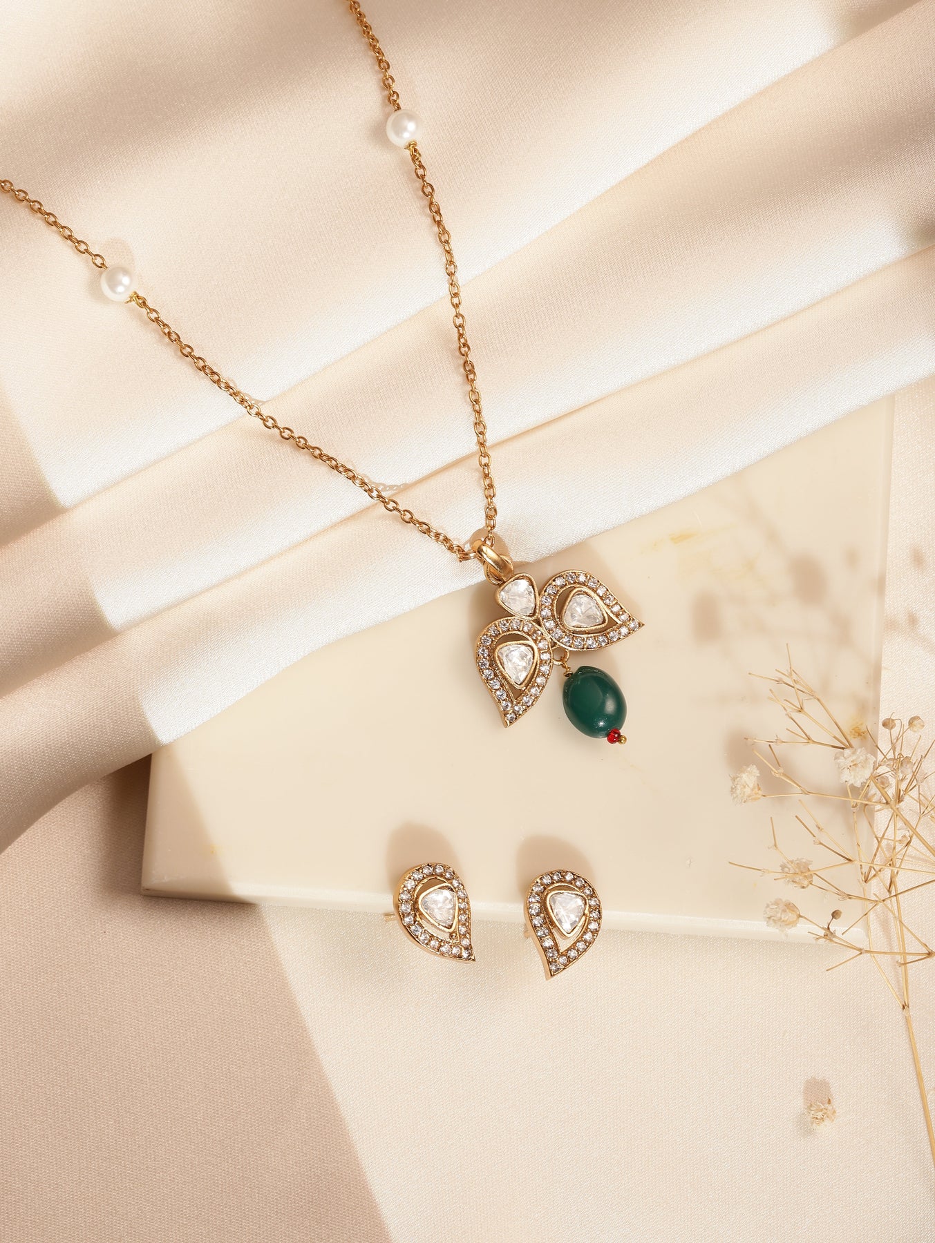 Women's Gold Plated Kundan Polki & American Diamond Pendant Chain With Pair Of Earrings