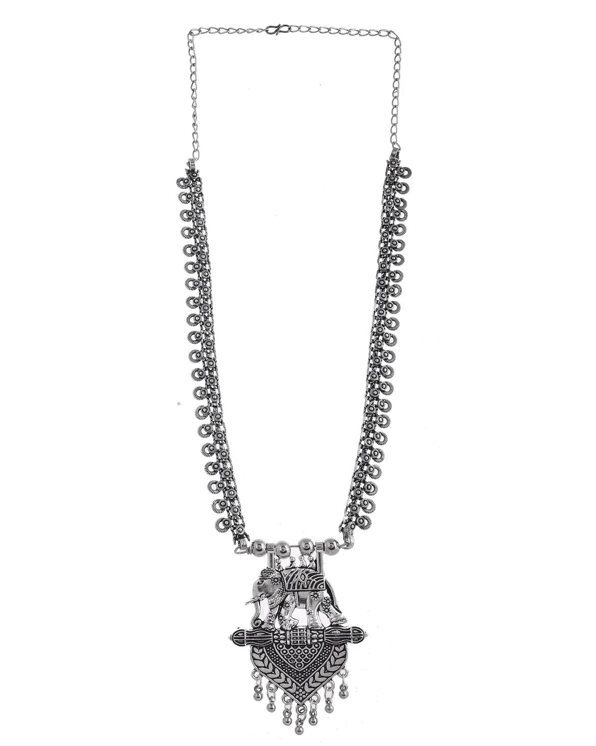 Make A Statement With The Oxidised Spring Chain Necklace Featuring An Intricately Designed Elephant Pendant By Vastrabhushan. This Traditional Necklace Celebrates Heritage And Artistry, With The Majestic Elephant Motif Symbolising Strength And Wisdom. The Oxidised Silver Finish On The Spring Chain And Pendant Adds A Vintage Charm, Making It A Perfect Match For Ethnic And Fusion Wear. Ideal For Festive Occasions, Weddings, Or Casual Outings, This Piece Exudes Timeless Elegance And Cultural Significance.