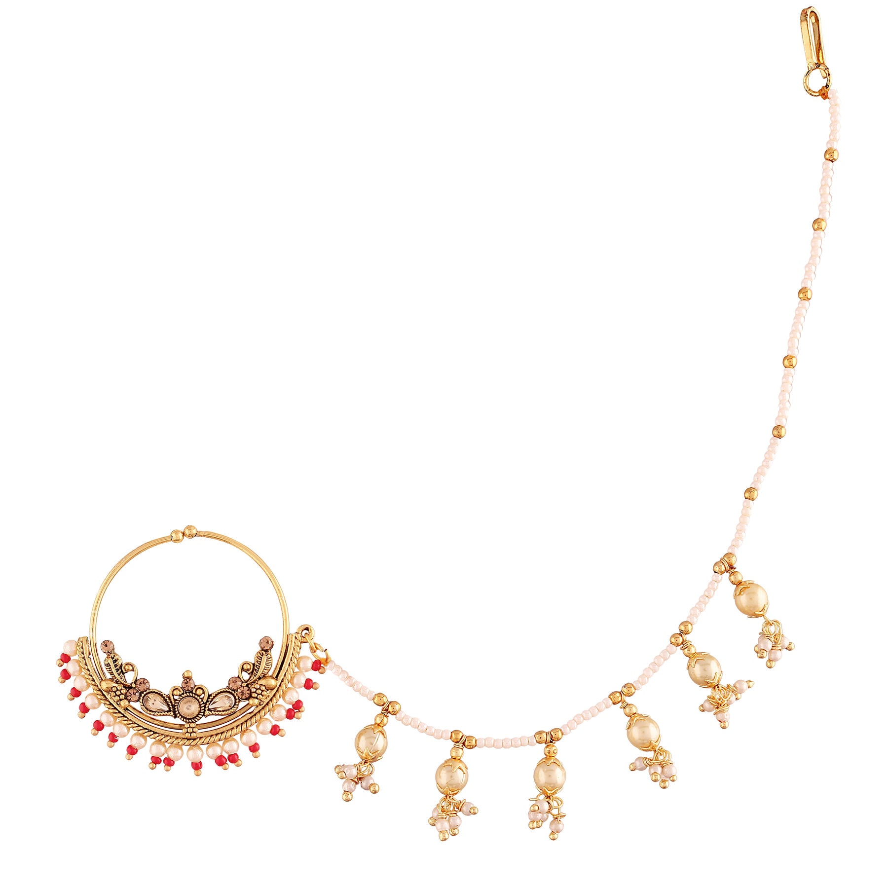 This Traditional Nose Pin Is Crafted In Gold-Plating And Features Pearl Beaded Clip-On Nose Ring With Chain, Connecting To A Hook Closure. Style This Nose Pin With Your Ethnic Attires For Festive Ready Look. No Piercing Required. Perfect Accessory For Every Jewelry Box!