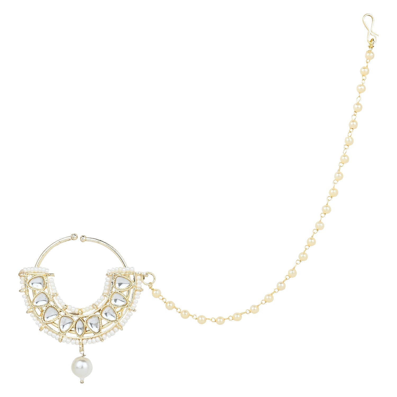 Women's Gold Plated Traditional Ethnic Bridal Nose Ring/Nath Without Piercing With Pearl Chain Encased With Pearl Stone