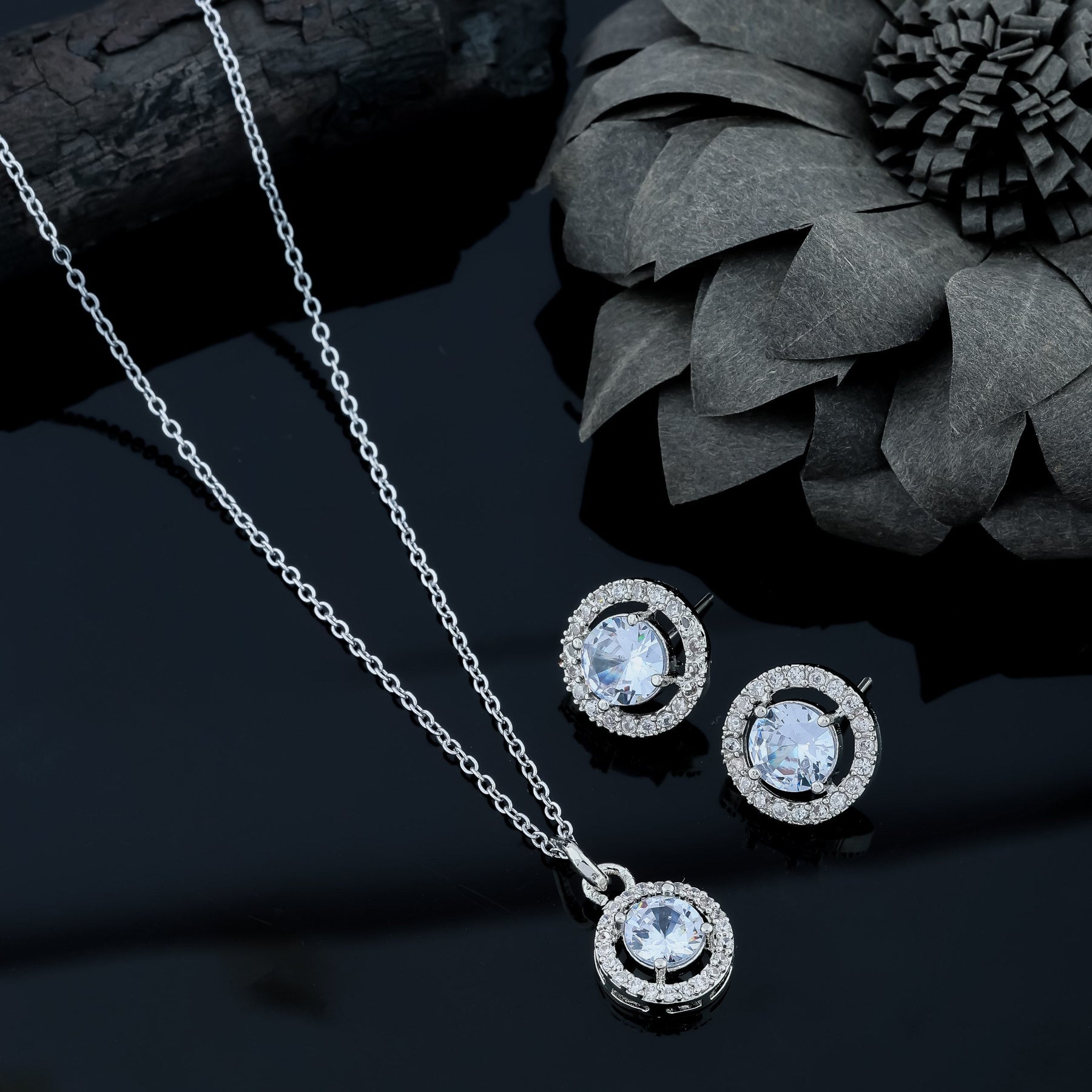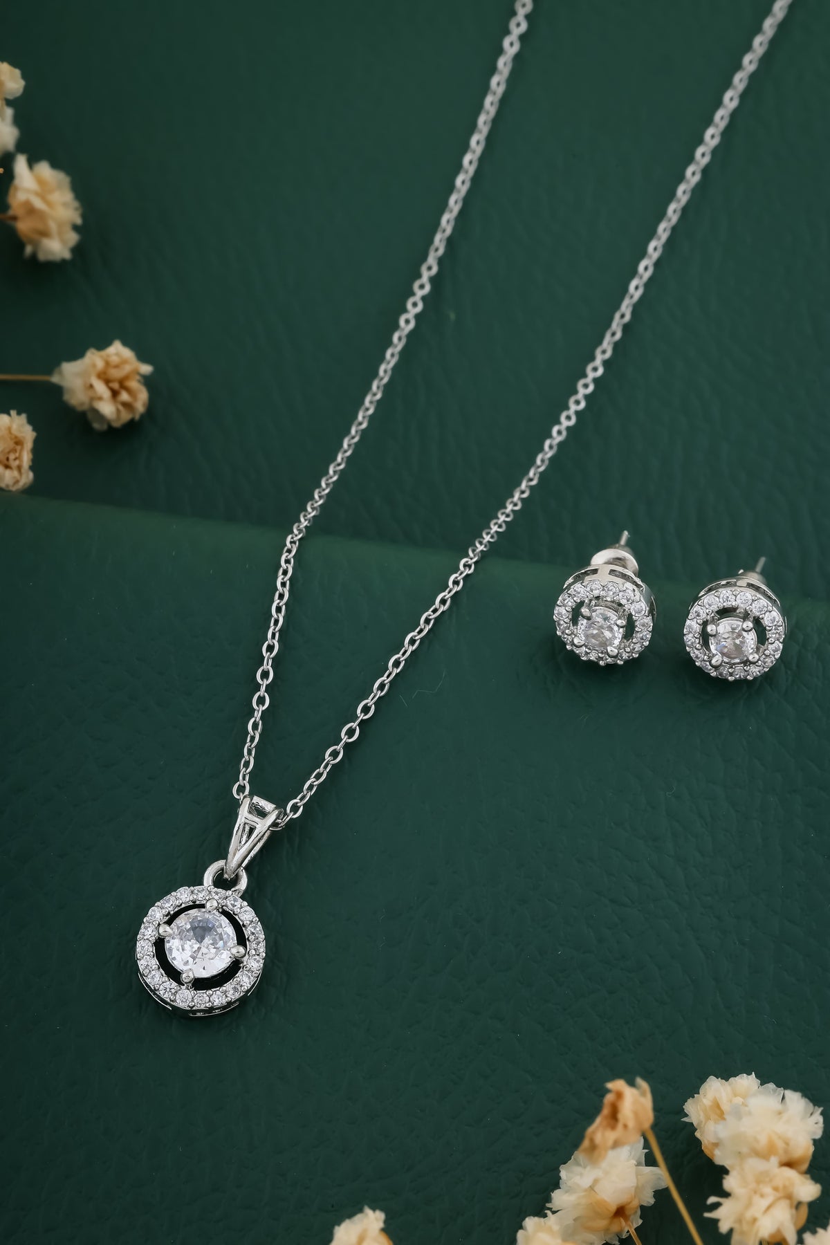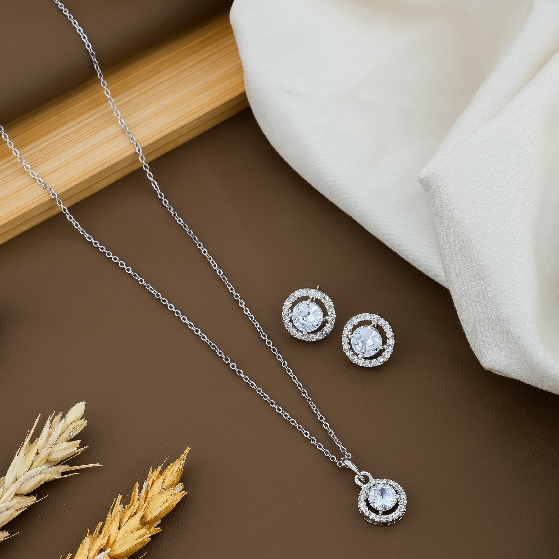Rhodium Plated Pendant Chain, Has Sliver Toned Ad White Stone-Studded Secured With A Hook Closure A Pair Of Matching Drop Earrings, Each Secured With A Post-And-Back