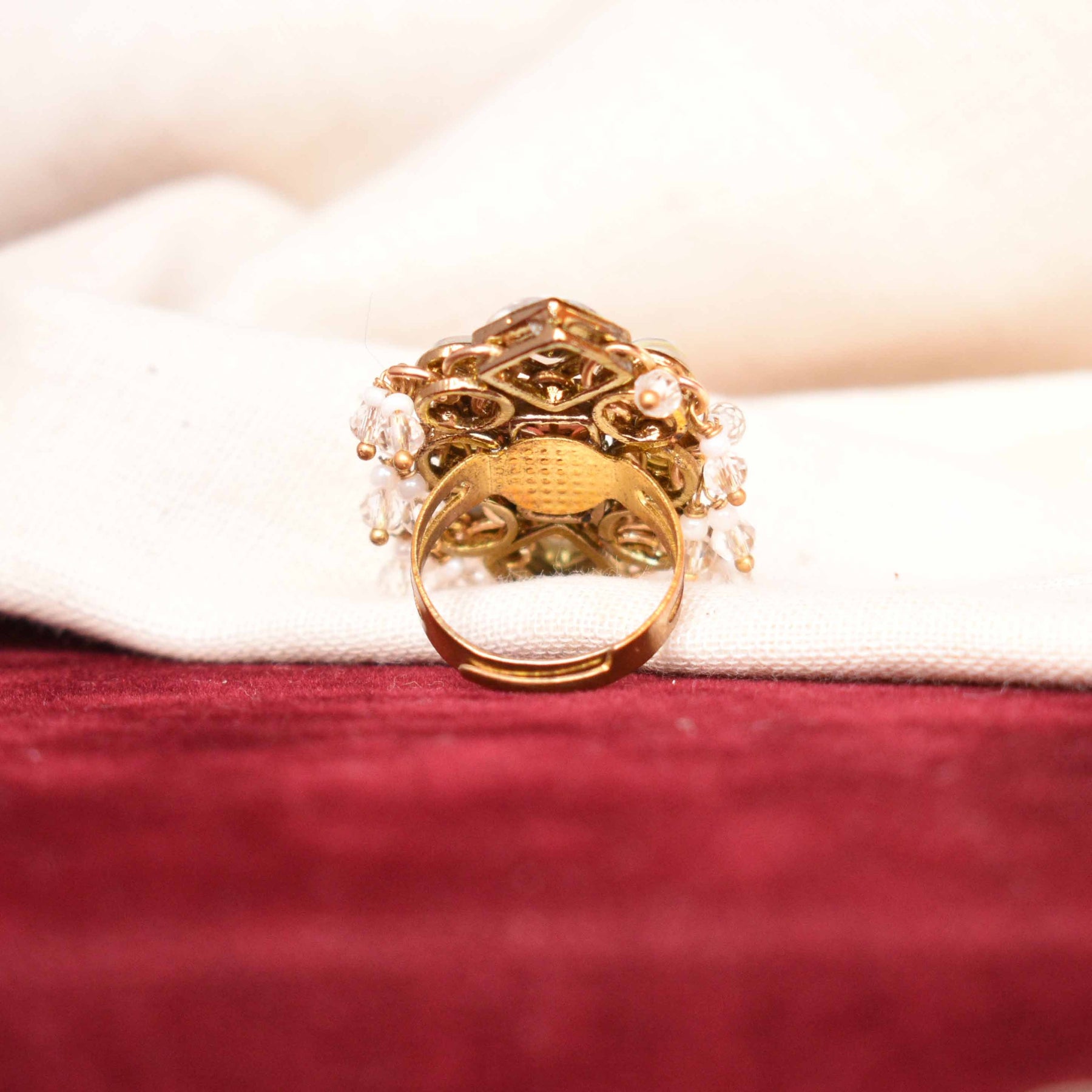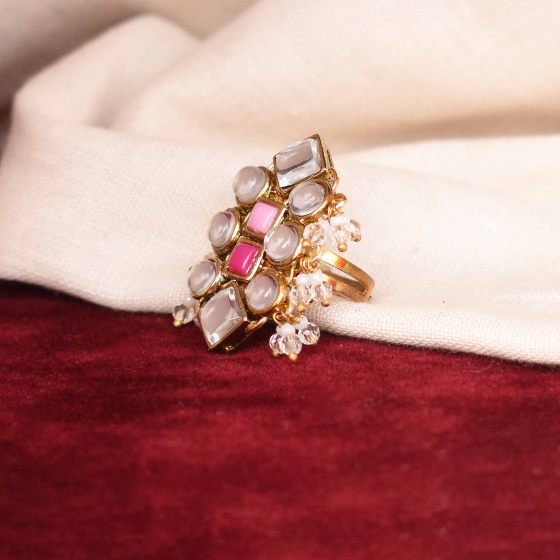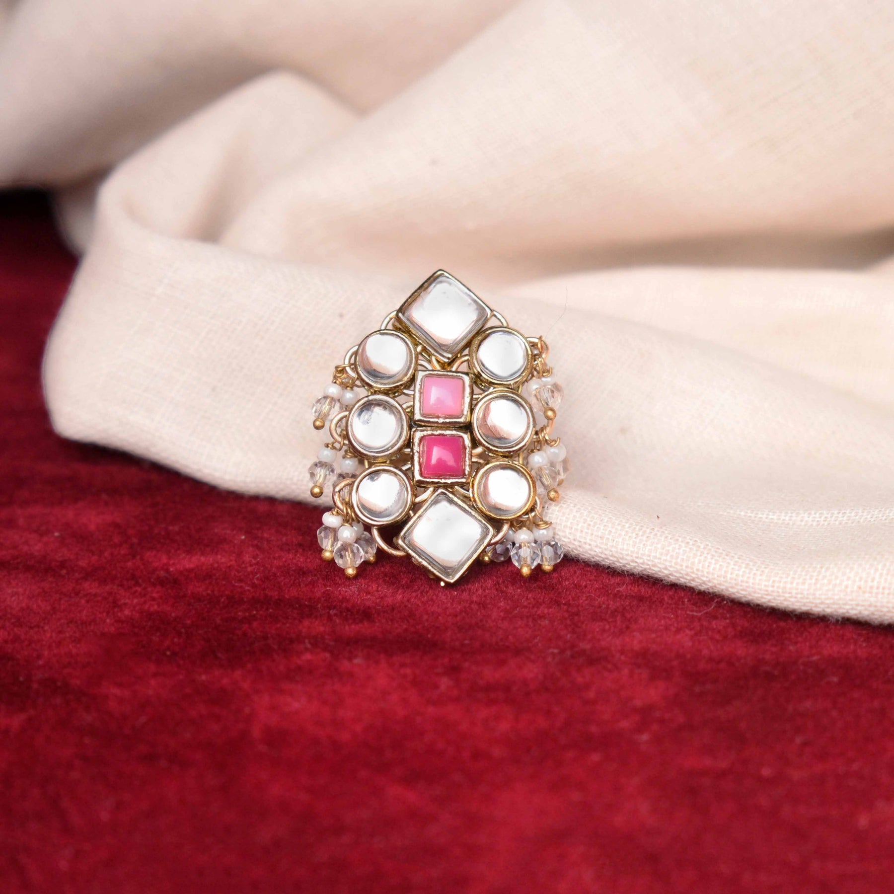 Discover The Allure Of Tradition With The Enamoured Kundan Adjustable Ring, A Piece That Beautifully Marries The Classic Charm Of Kundan Artistry With The Convenience Of Modern Design. This Adjustable Ring Is A Celebration Of Love And Craftsmanship, Featuring A Stunning Array Of Hand-Set Kundan Stones That Shimmer With An Ethereal Glow.