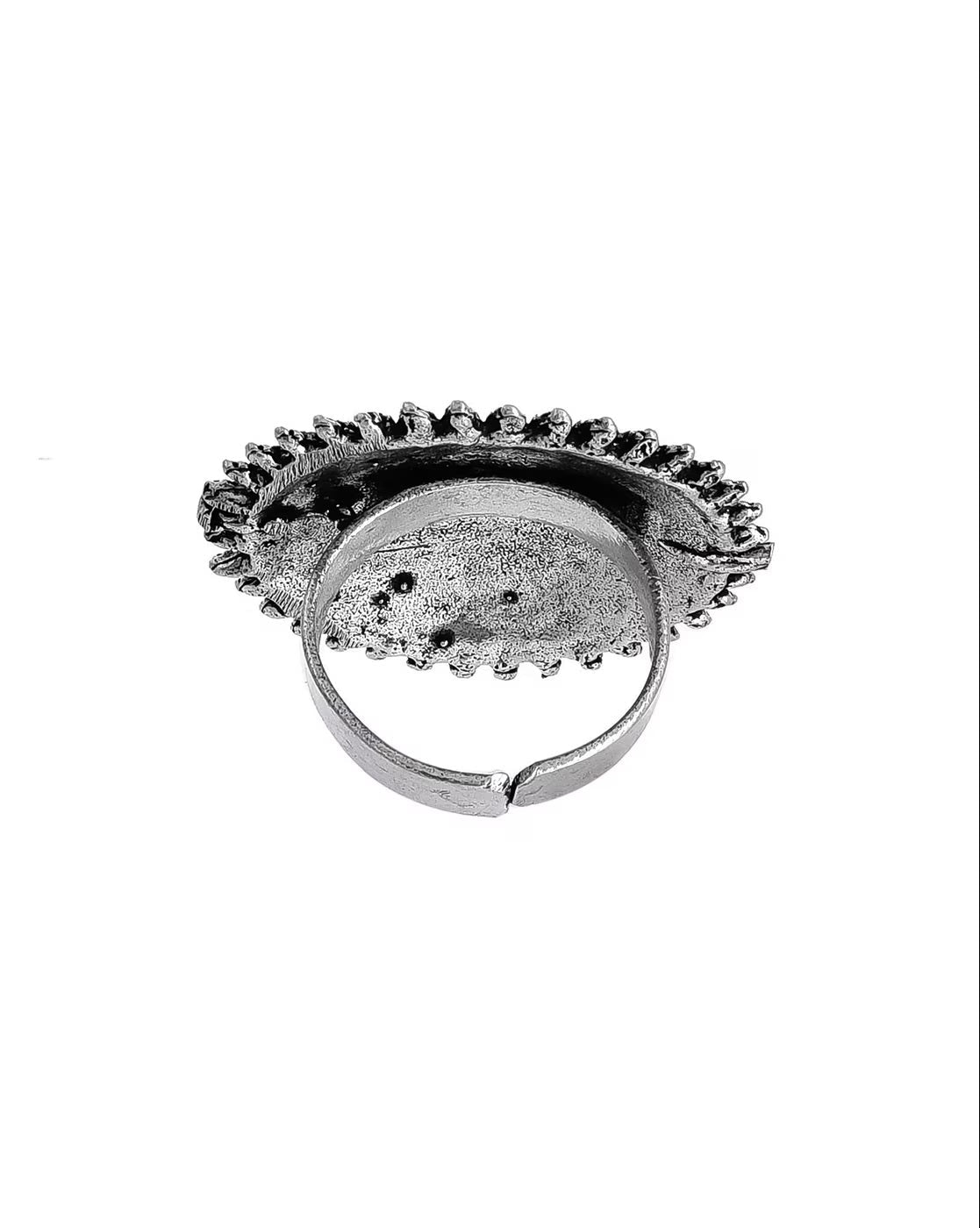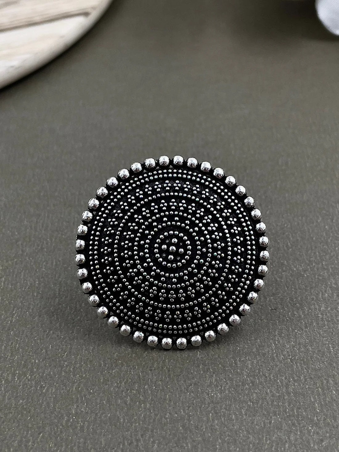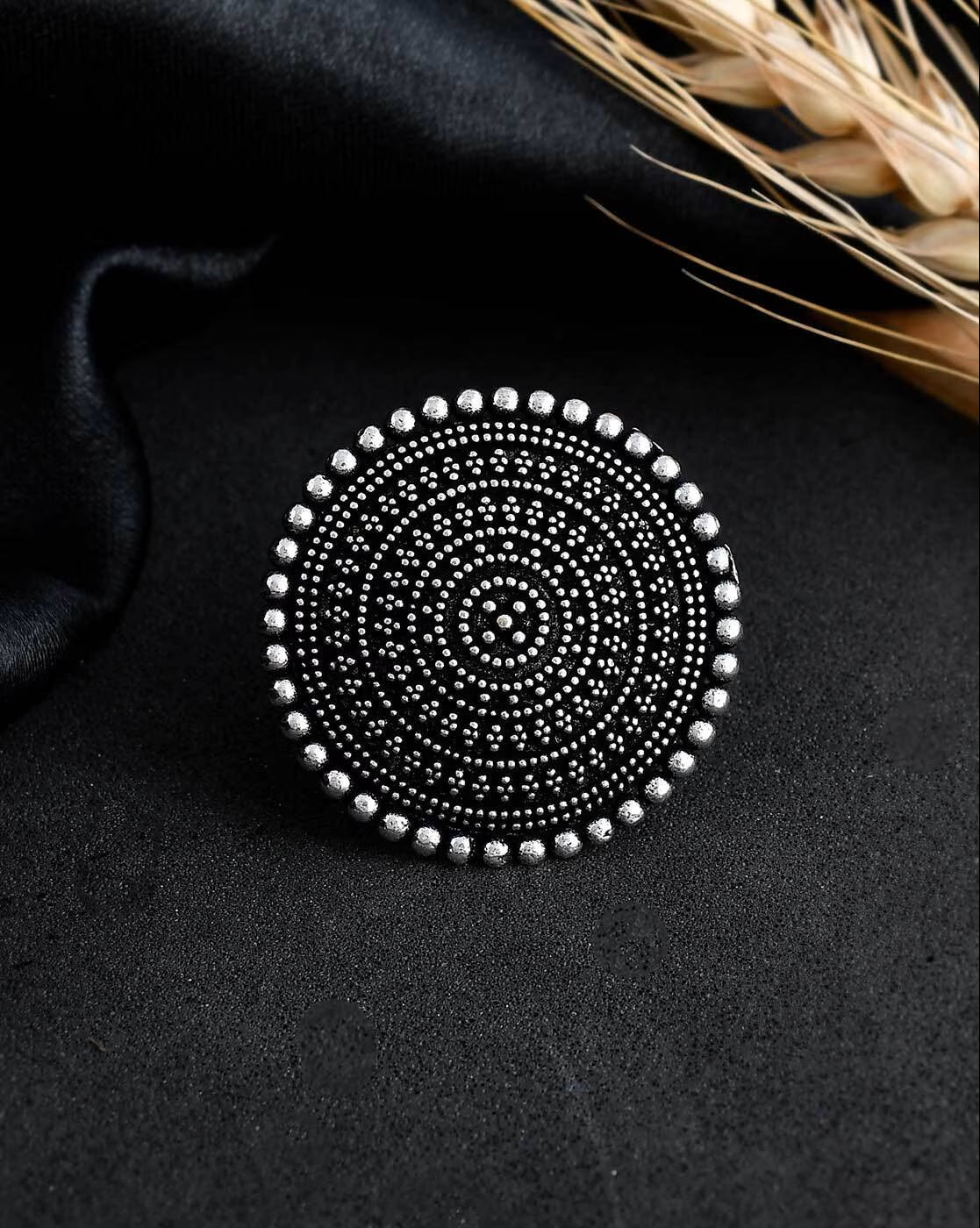 Elevate Your Style With This Designer Oxidised Brass Ring Featuring A Sophisticated Oxidized Silver Plating And Black Polish Finish By Vastrabhushan. This Statement Ring Showcases Intricate Craftsmanship And A Bold Design That Exudes Elegance And Modernity. Perfect For Both Traditional And Contemporary Outfits, This Ring Is An Ideal Accessory For Festive Occasions, Weddings, Or Everyday Wear. Add This Unique Piece To Your Jewelry Collection To Make A Lasting Impression.