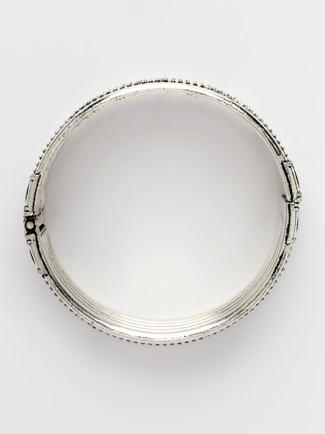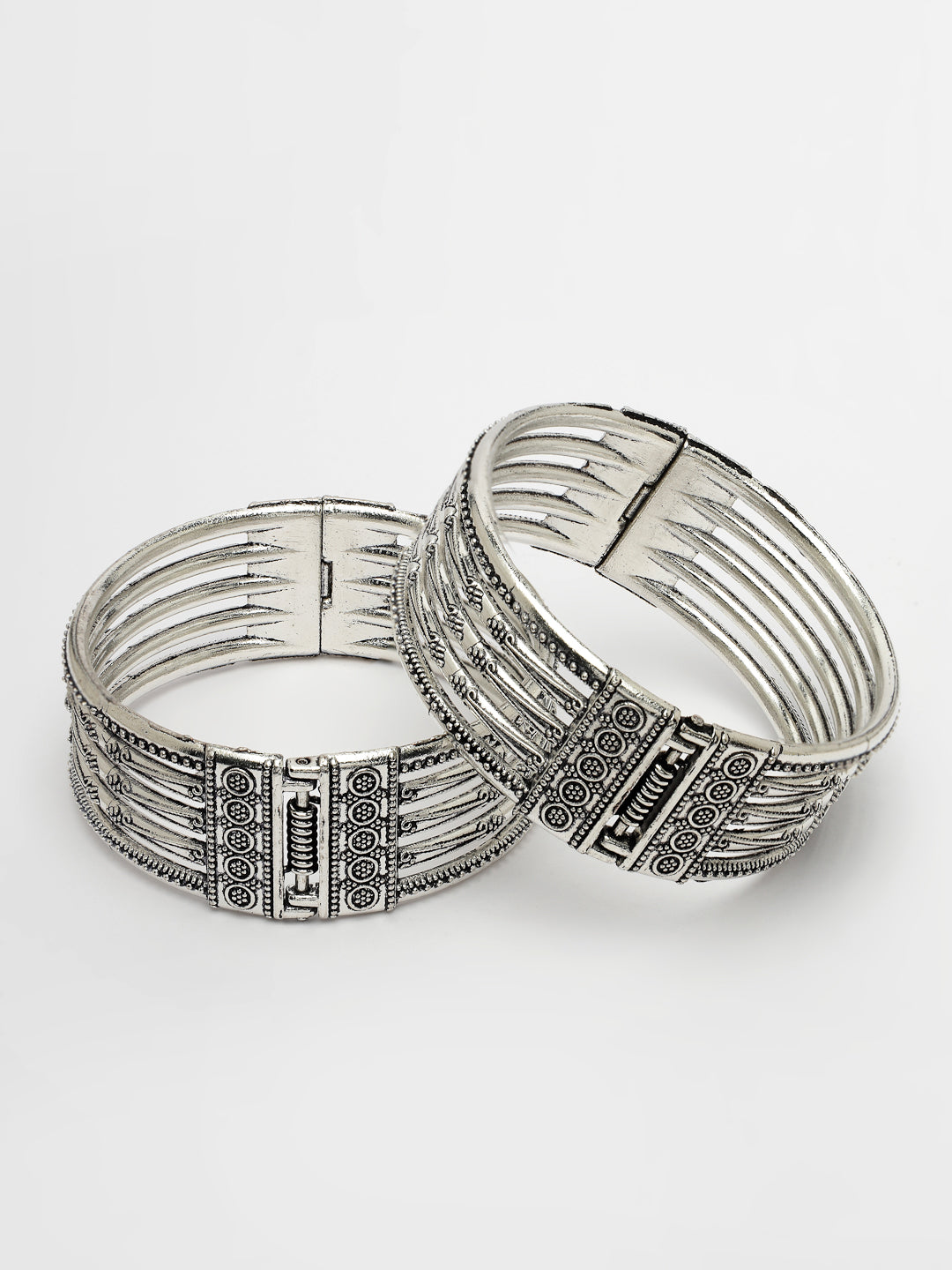 Style Note: Add a touch of rustic charm to your ensemble with the NVR Women Silver-Toned German Silver Oxidized Kada Bangle. This bangle exudes a sense of bohemian elegance, featuring intricate oxidized detailing that adds depth and character to any outfit. The silver-toned finish lends a versatile appeal, allowing you to effortlessly pair it with both casual and semi-formal attire. Whether you're exploring the streets of a vibrant city or attending a laid-back gathering with friends, this kada bangle is the perfect accessory to elevate your look with a hint of artisanal flair. Embrace the free-spirited vibe and let your style shine with this unique piece adorning your wrist.