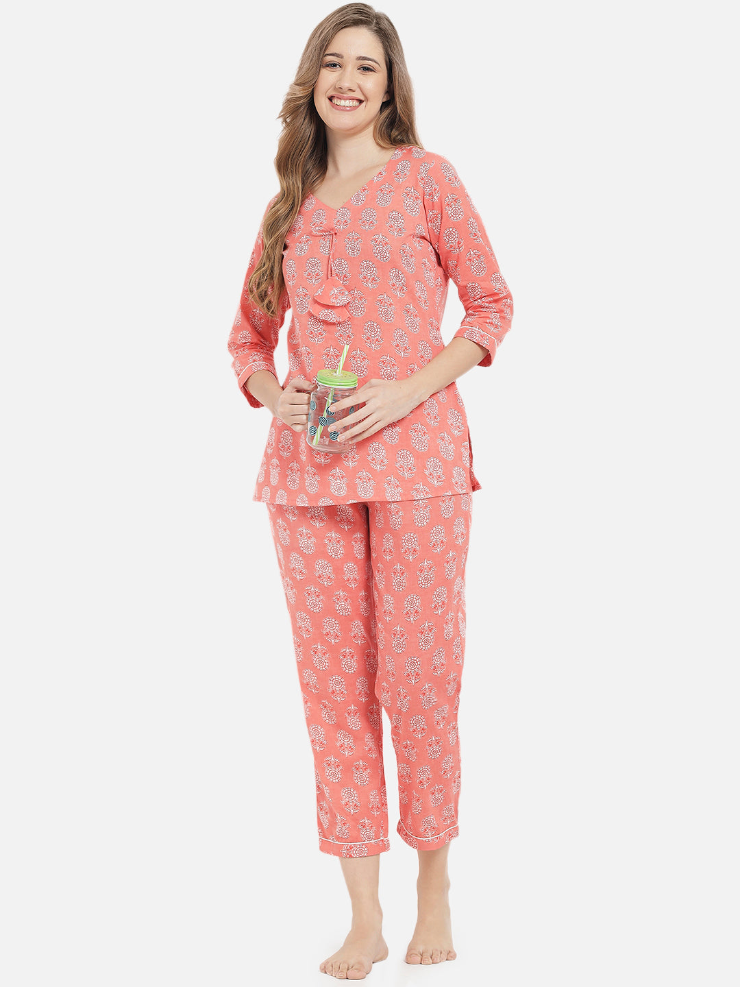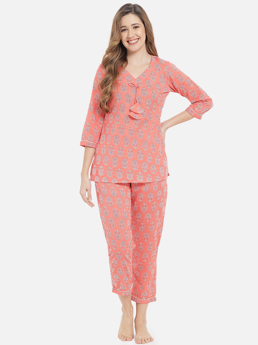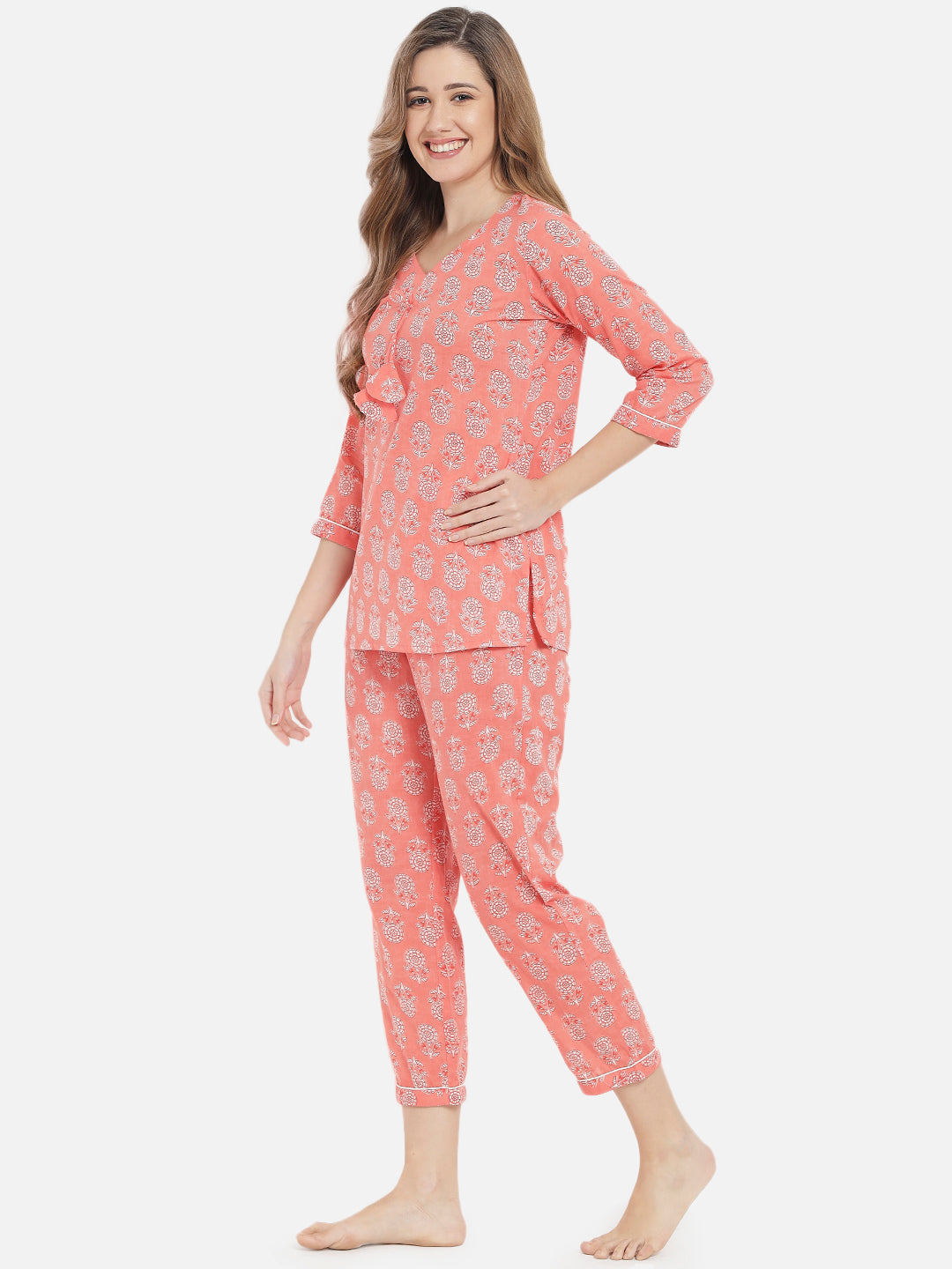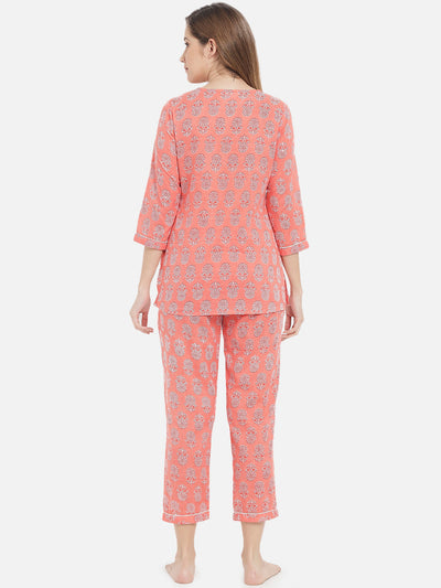 Peach Floral Print With V Neckline And Three Quarter Sleeves With Partially Elasticated Pants Night Suit